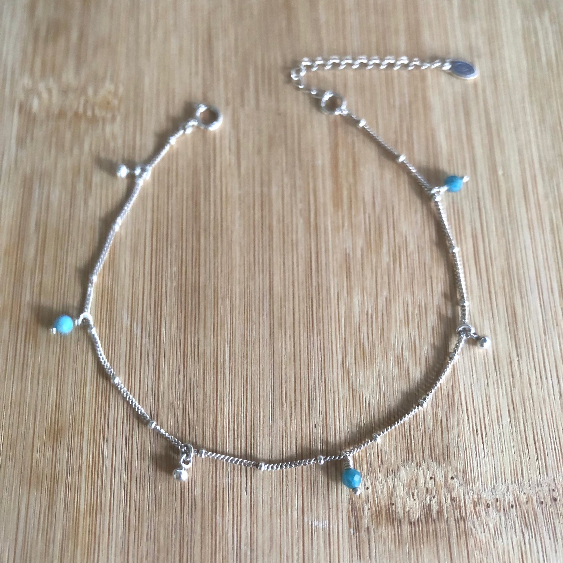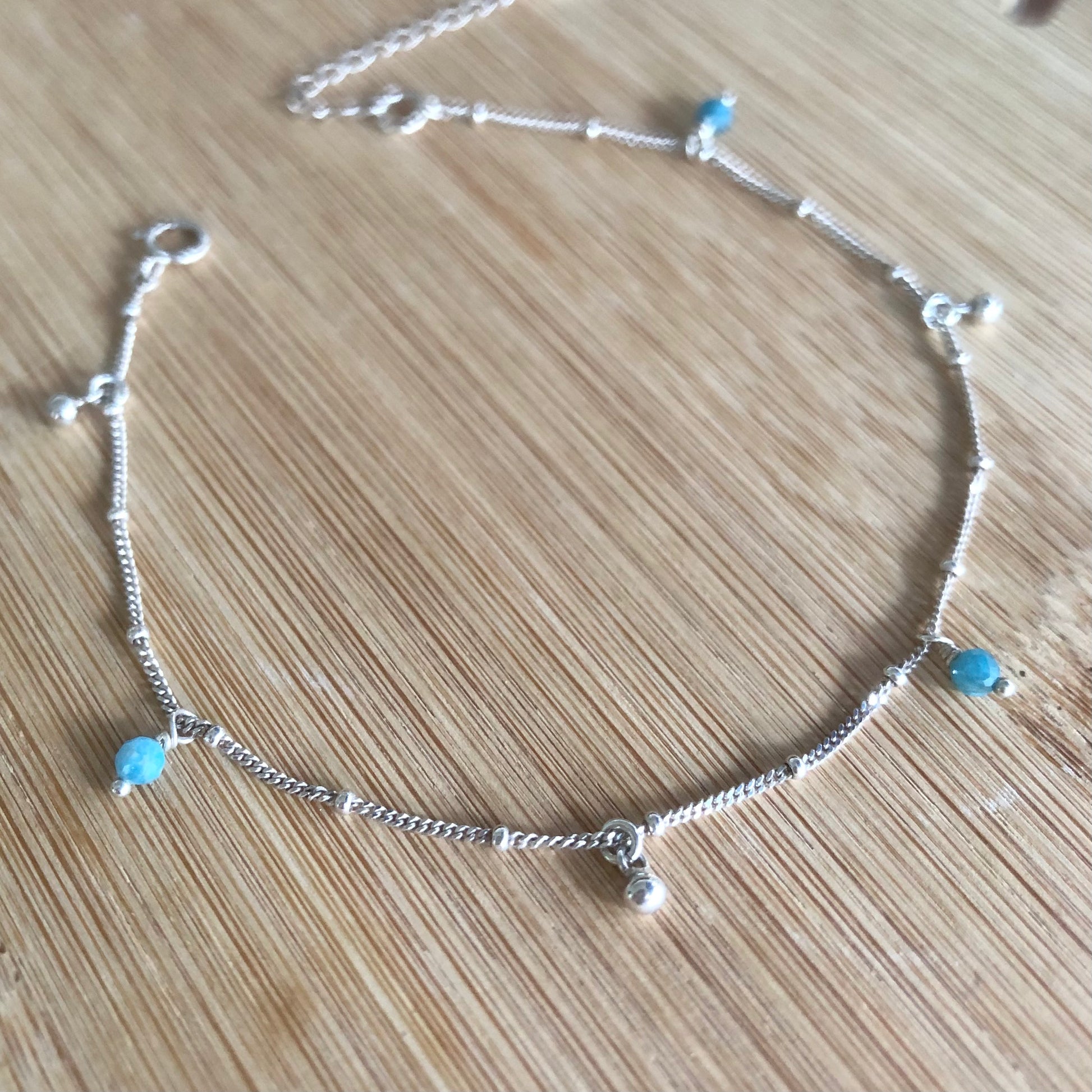 A anklet made with a silver ball chain, some beads of amazonite stone and some silver beads.