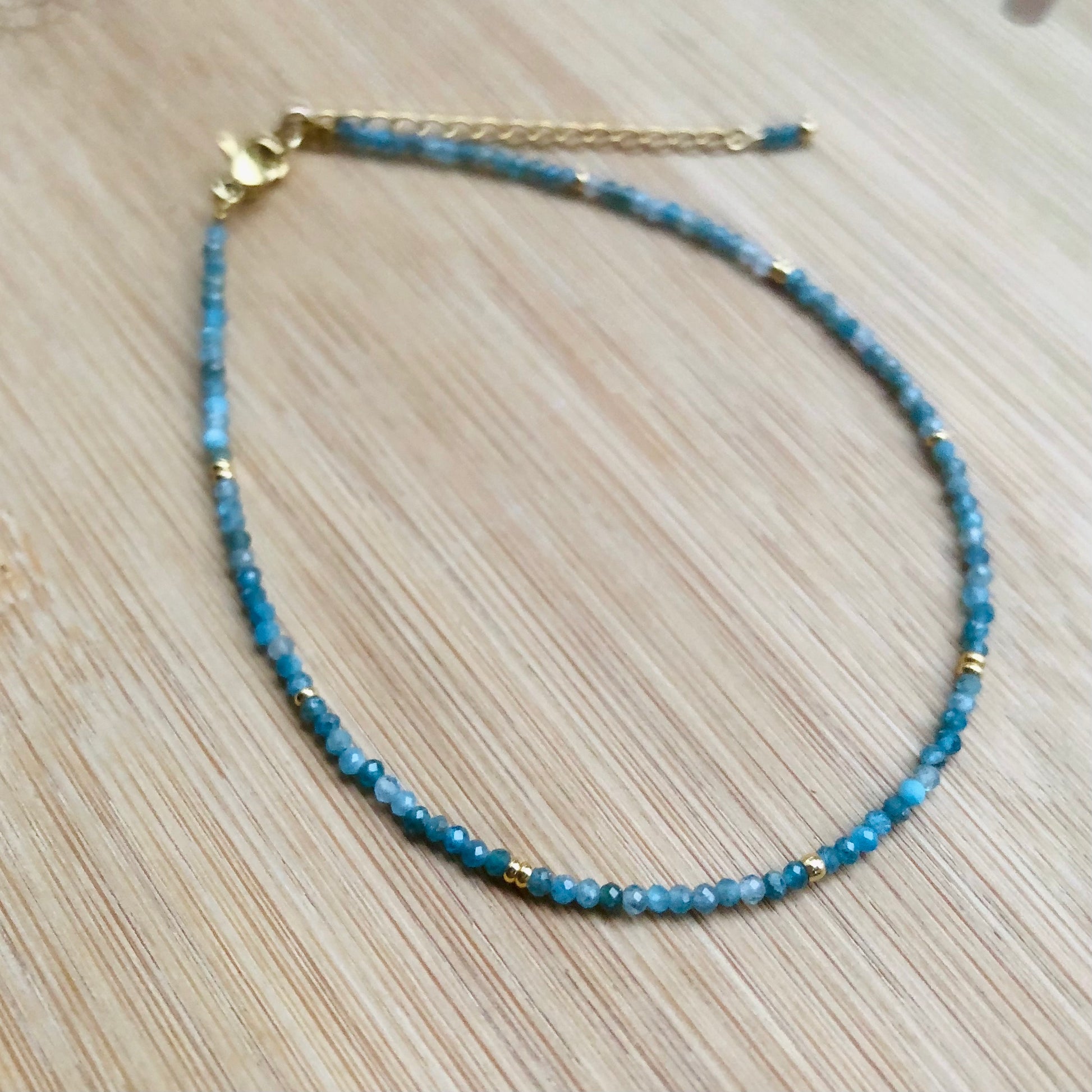 An anklet made with small apatite stone beads and gold plated stainless steel beads.