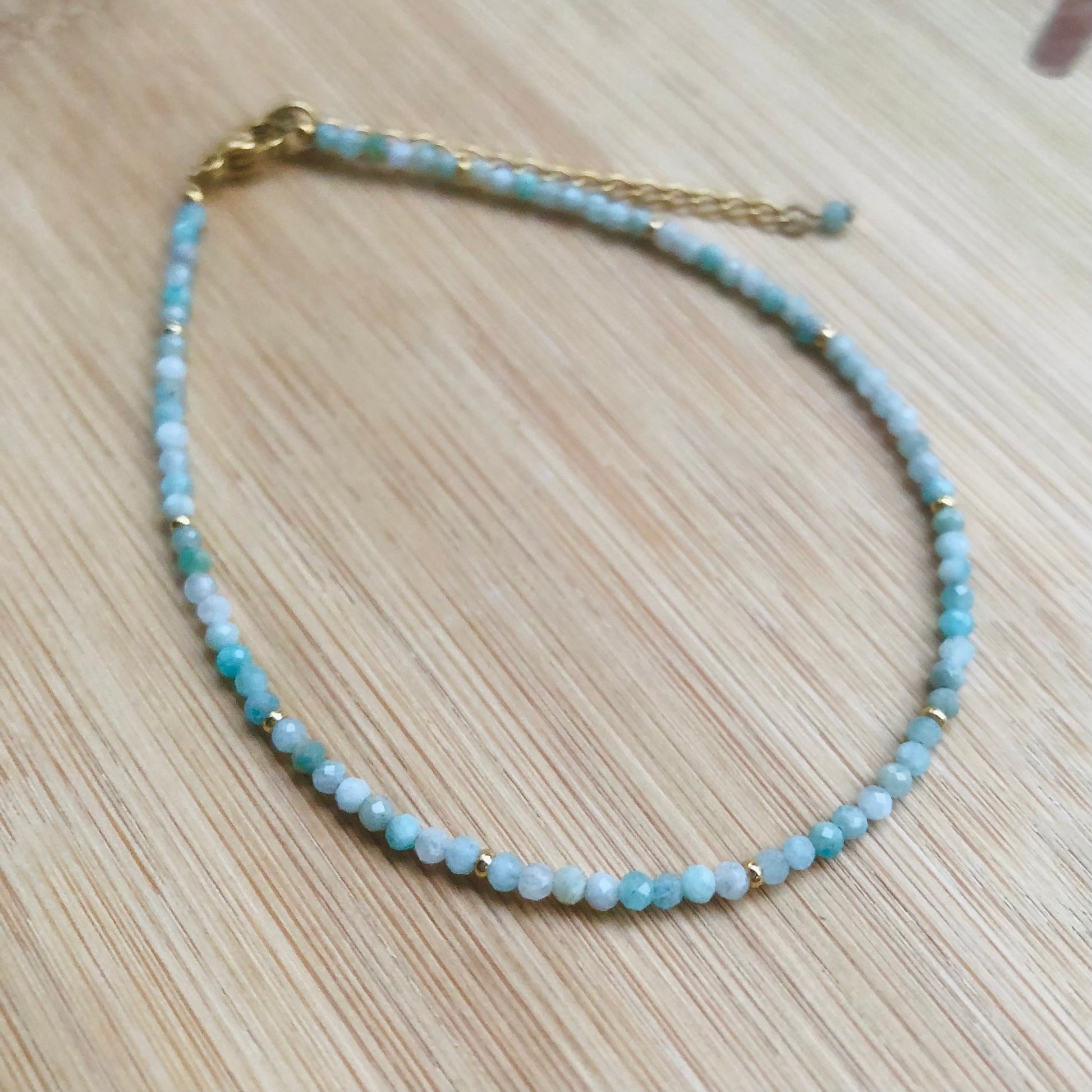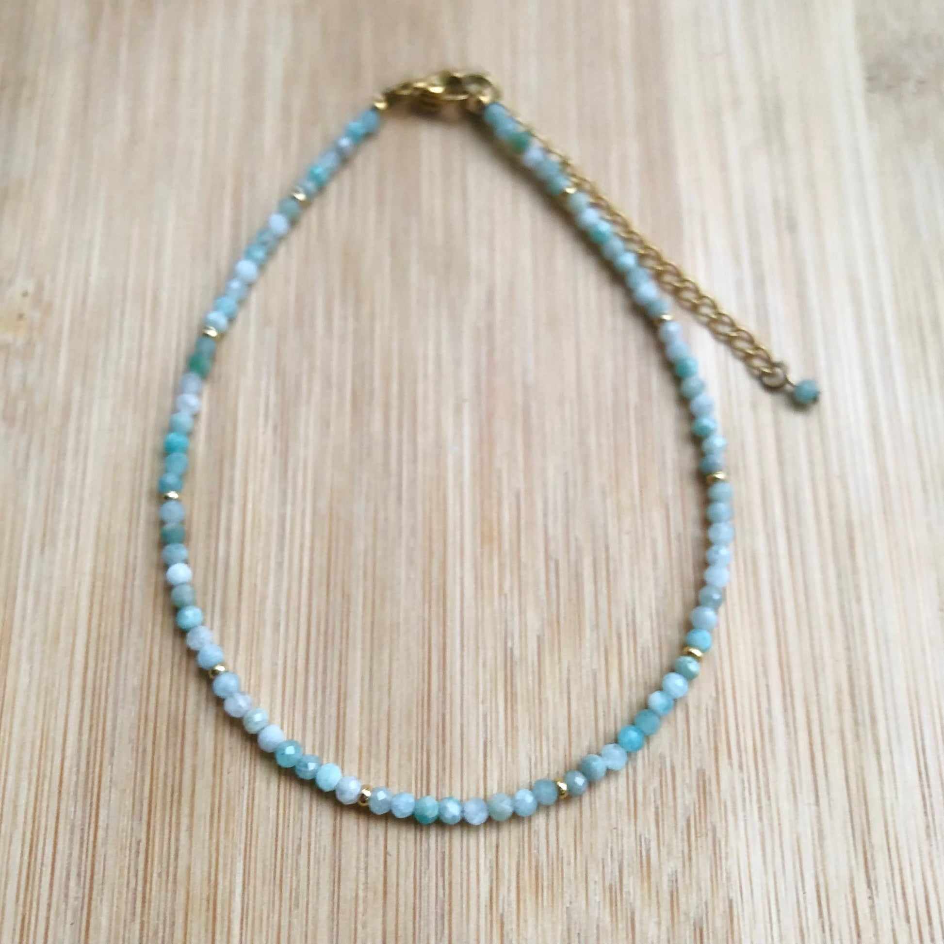 An anklet made with small amazonite stone beads and gold plated stainless steel beads.
