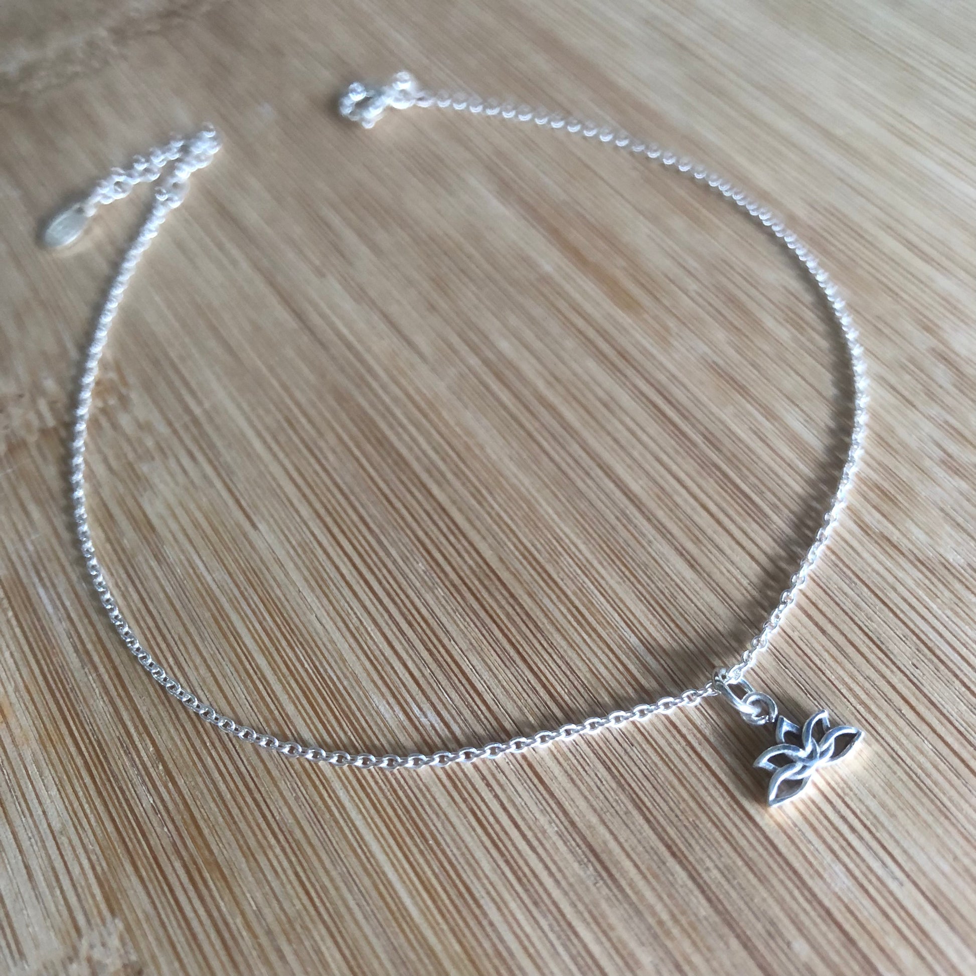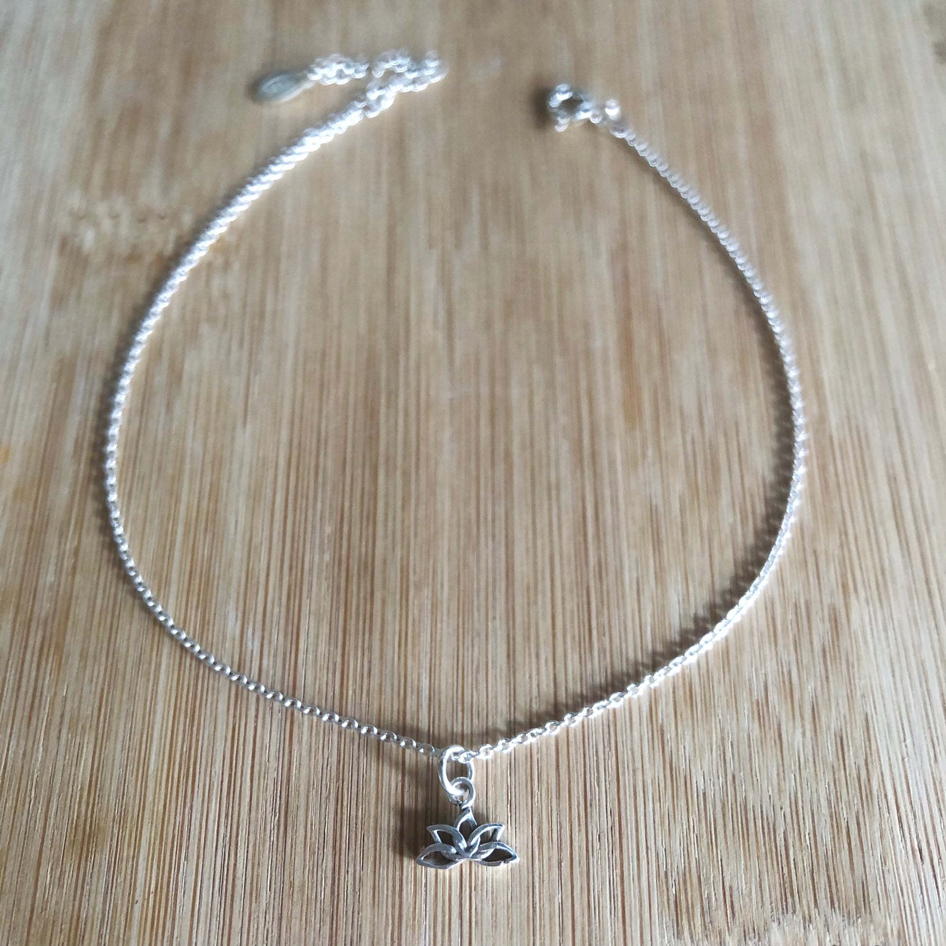 A anklet made with a thin silver chain and a lotus flower silver charm.