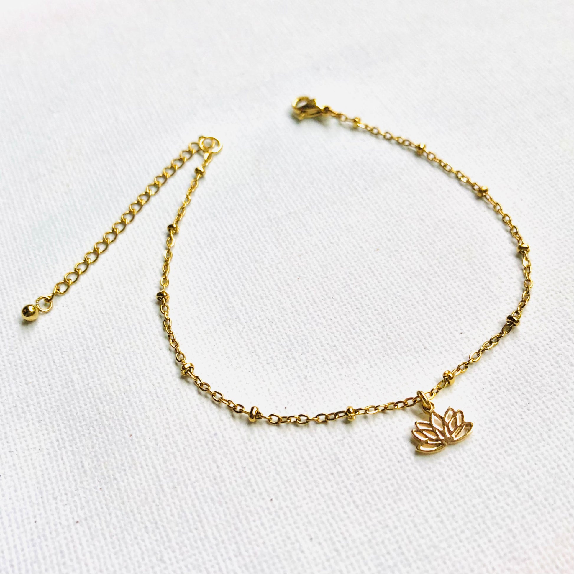 Una elegante tobillera confeccionada con una cadena de bolas y un charm de flor de loto.