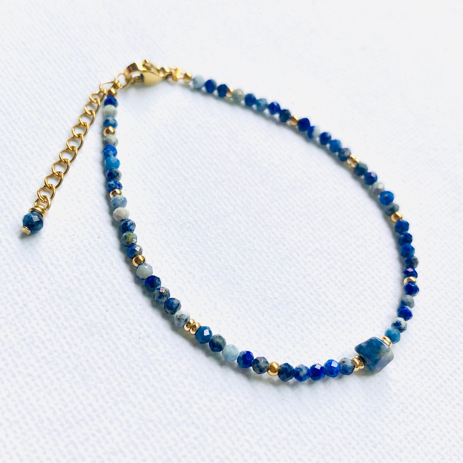 Una pulsera hecha con cuentas de piedra de lapislázuli, unas cuentas de acero inoxidable bañadas en oro y una cuenta de lapislázuli en bruto en el medio.