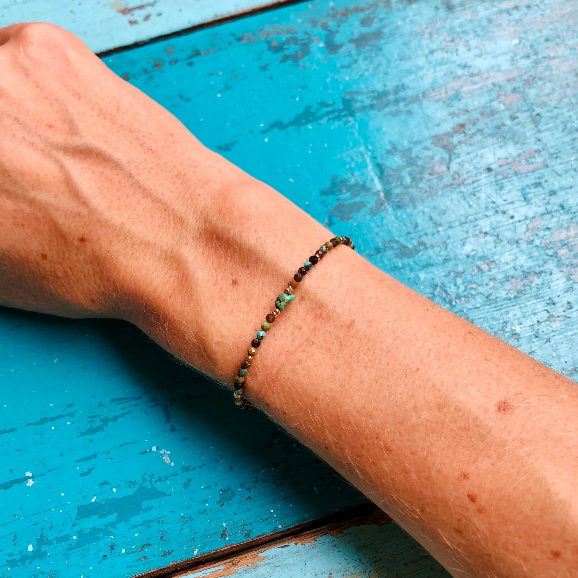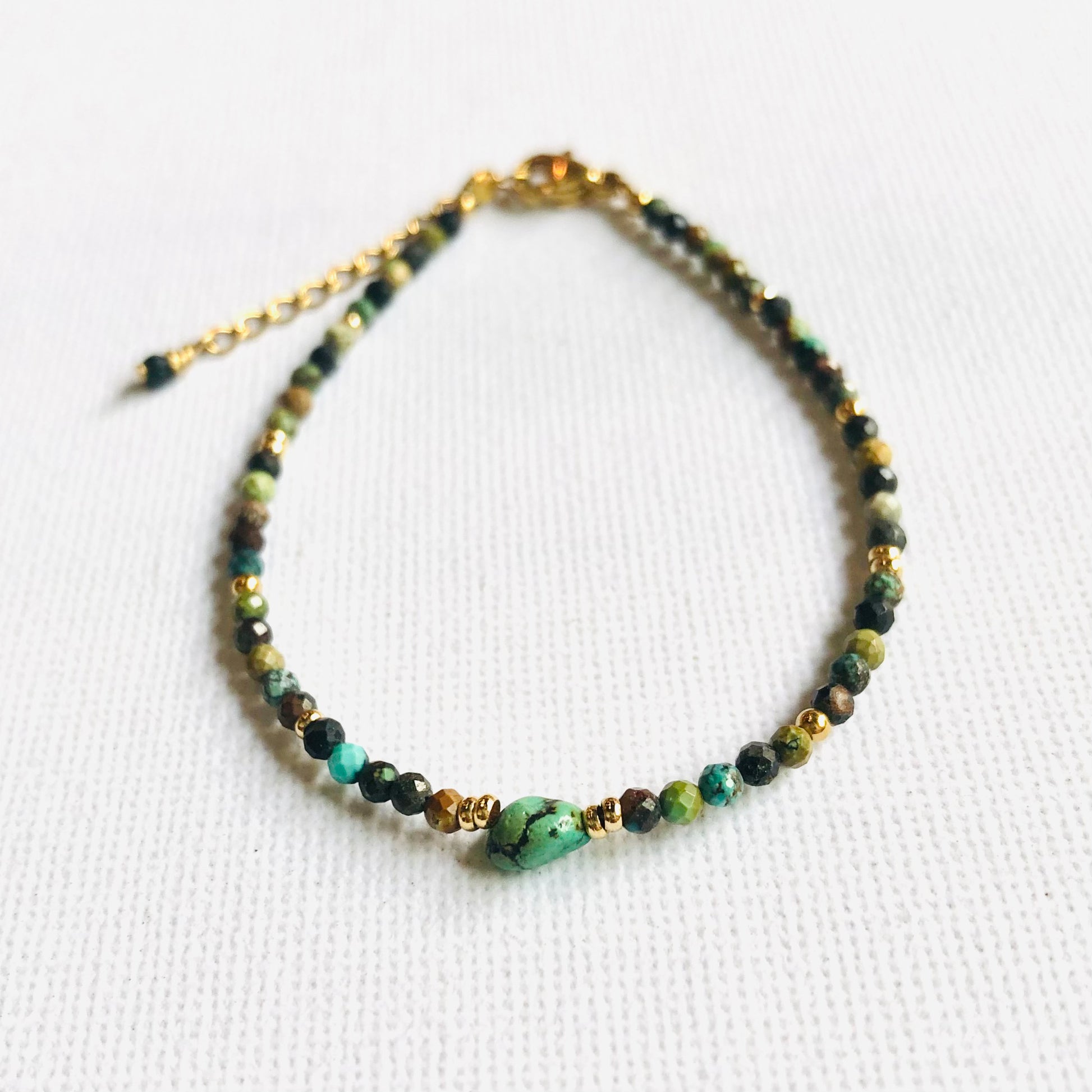 Una pulsera hecha con cuentas de piedra turquesa, unas cuentas de acero inoxidable bañadas en oro y una cuenta de turquesa cruda en el medio.