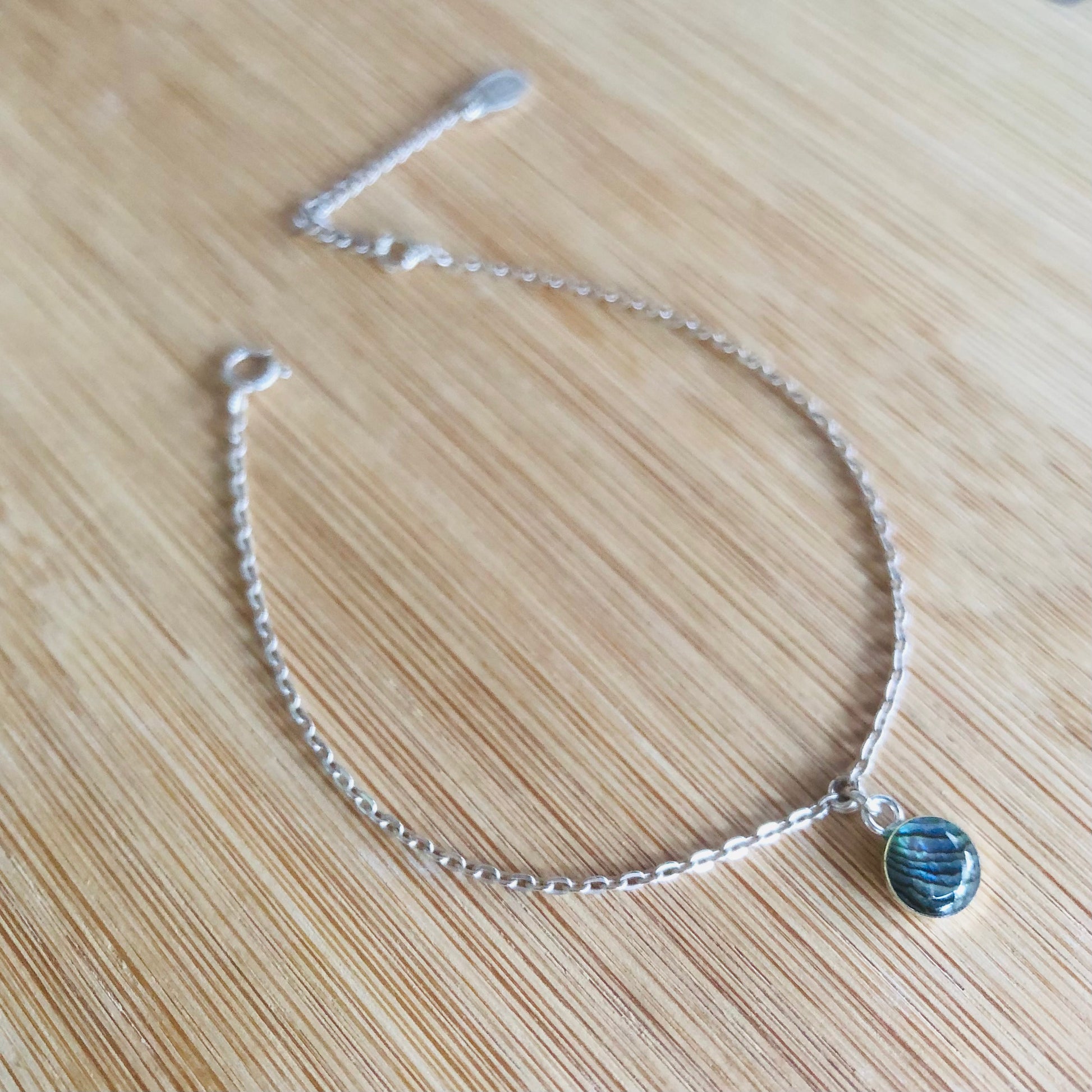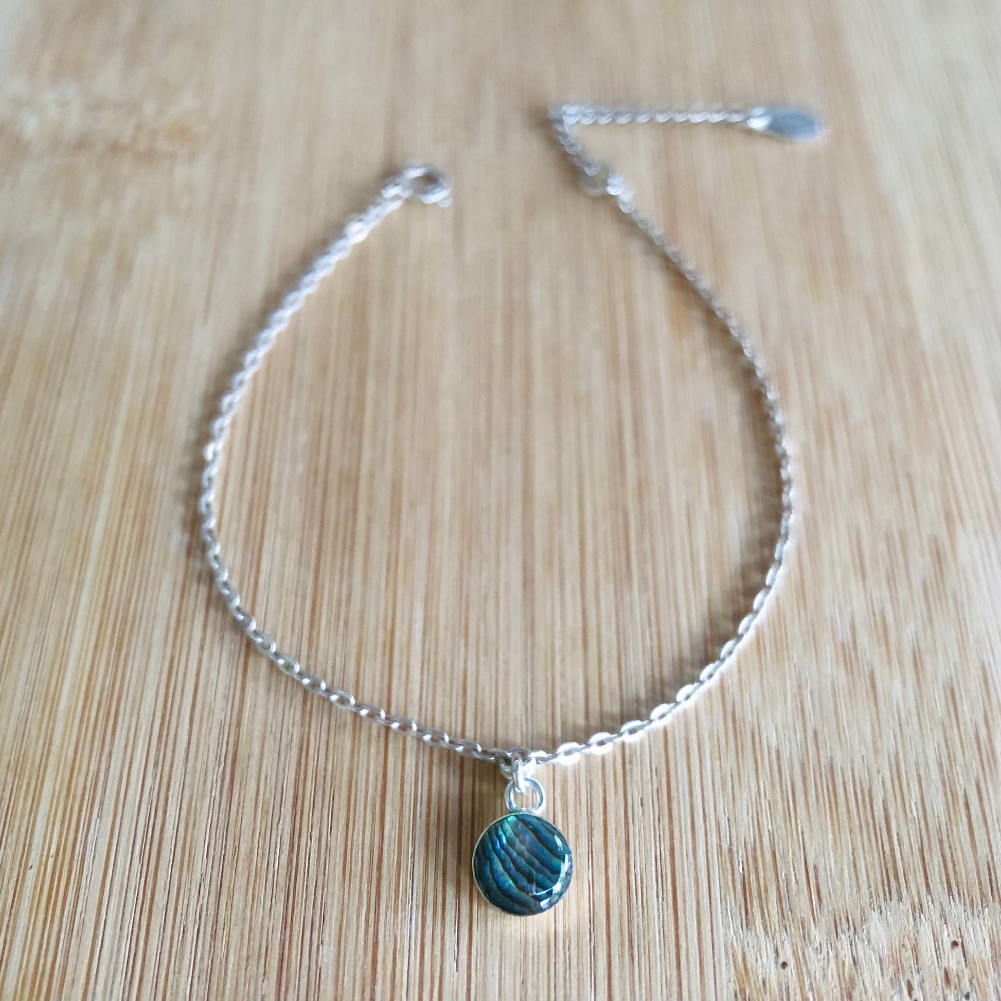 A bracelet made with a silver chain and an abalone shell silver charm pendant.