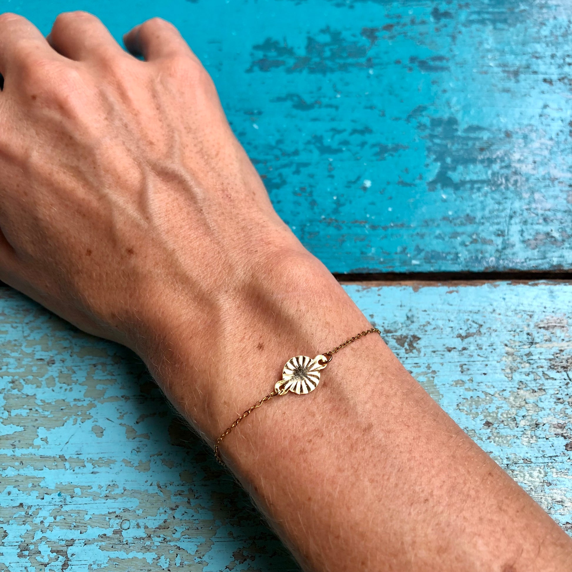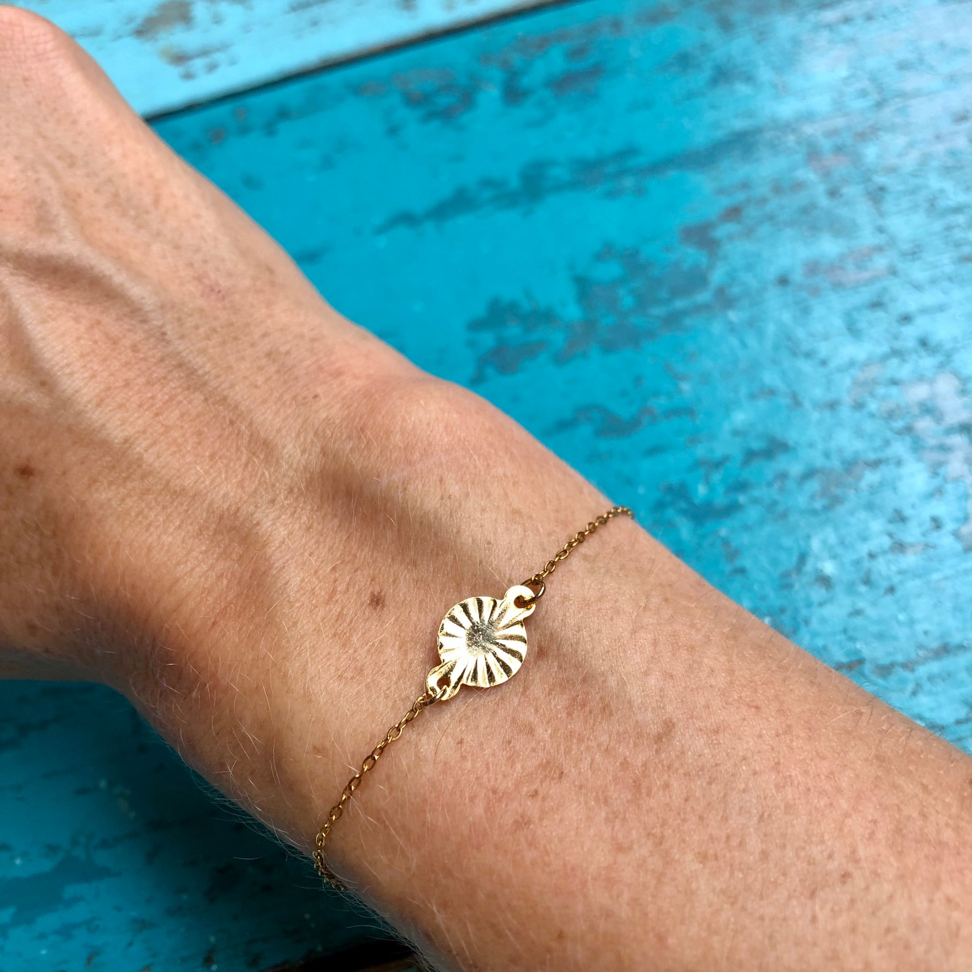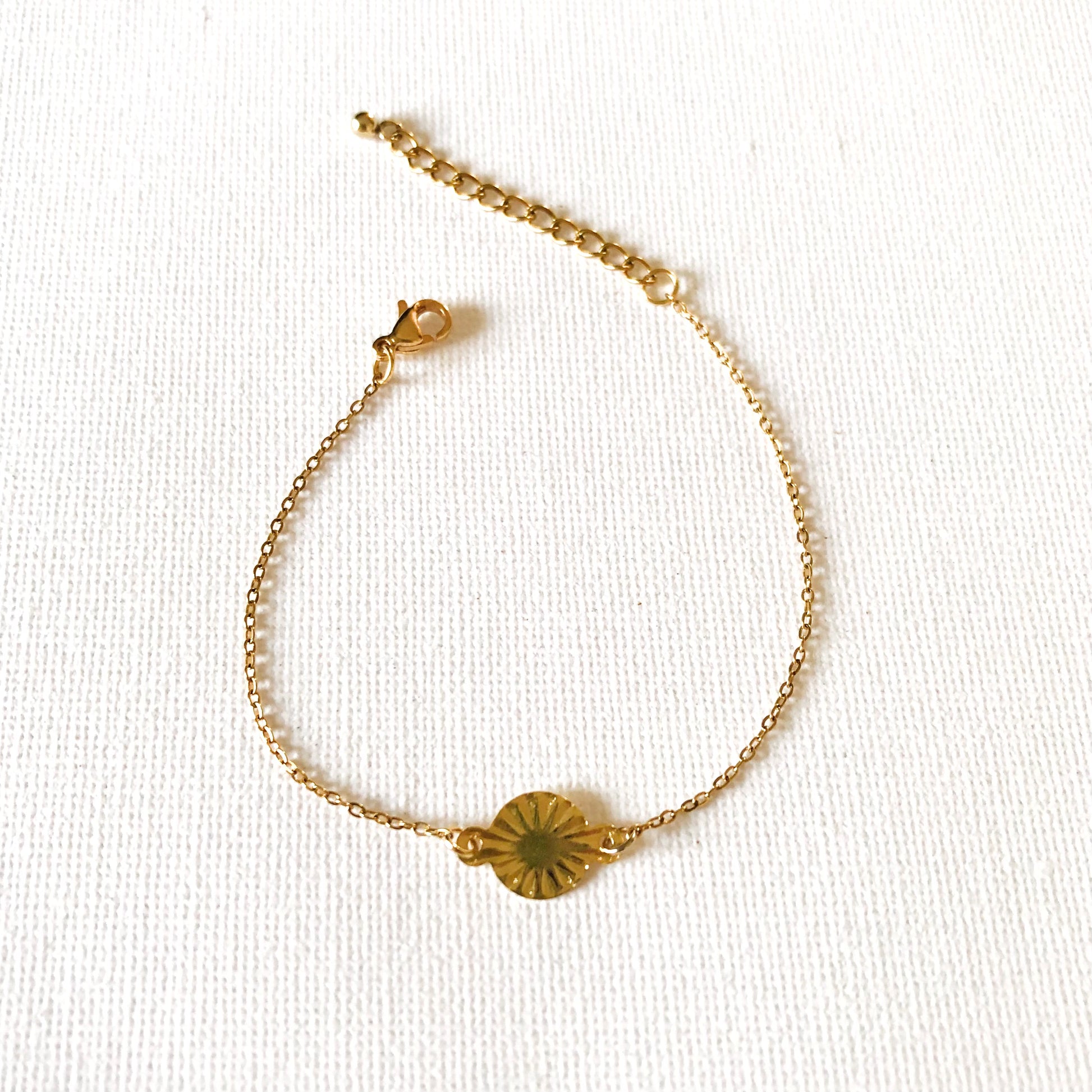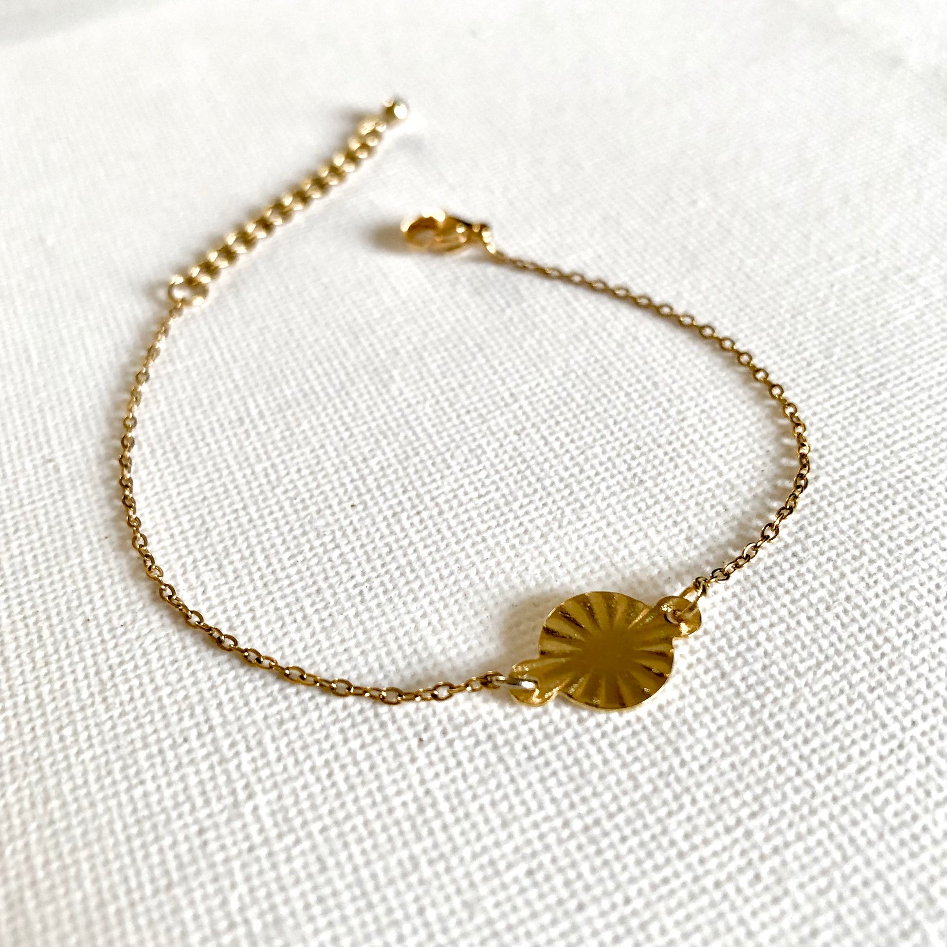 Una pulsera realizada con una fina cadena y un charm de acero inoxidable bañado en oro.