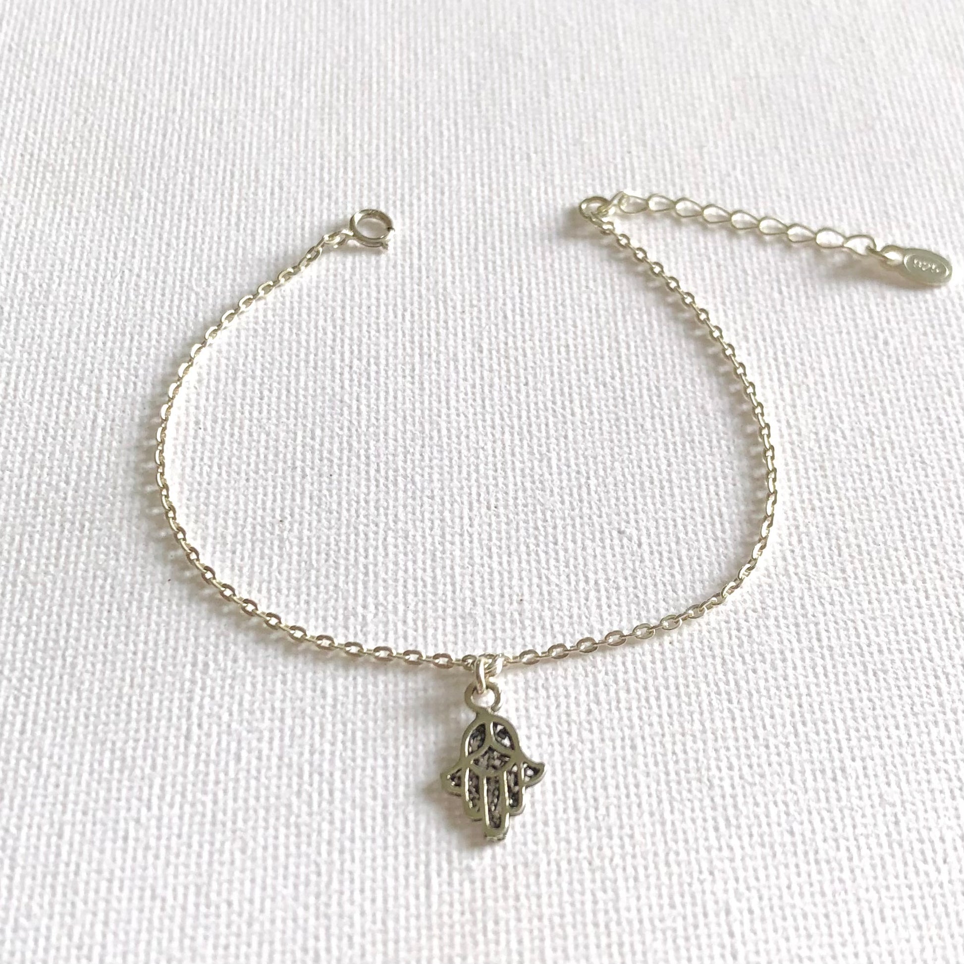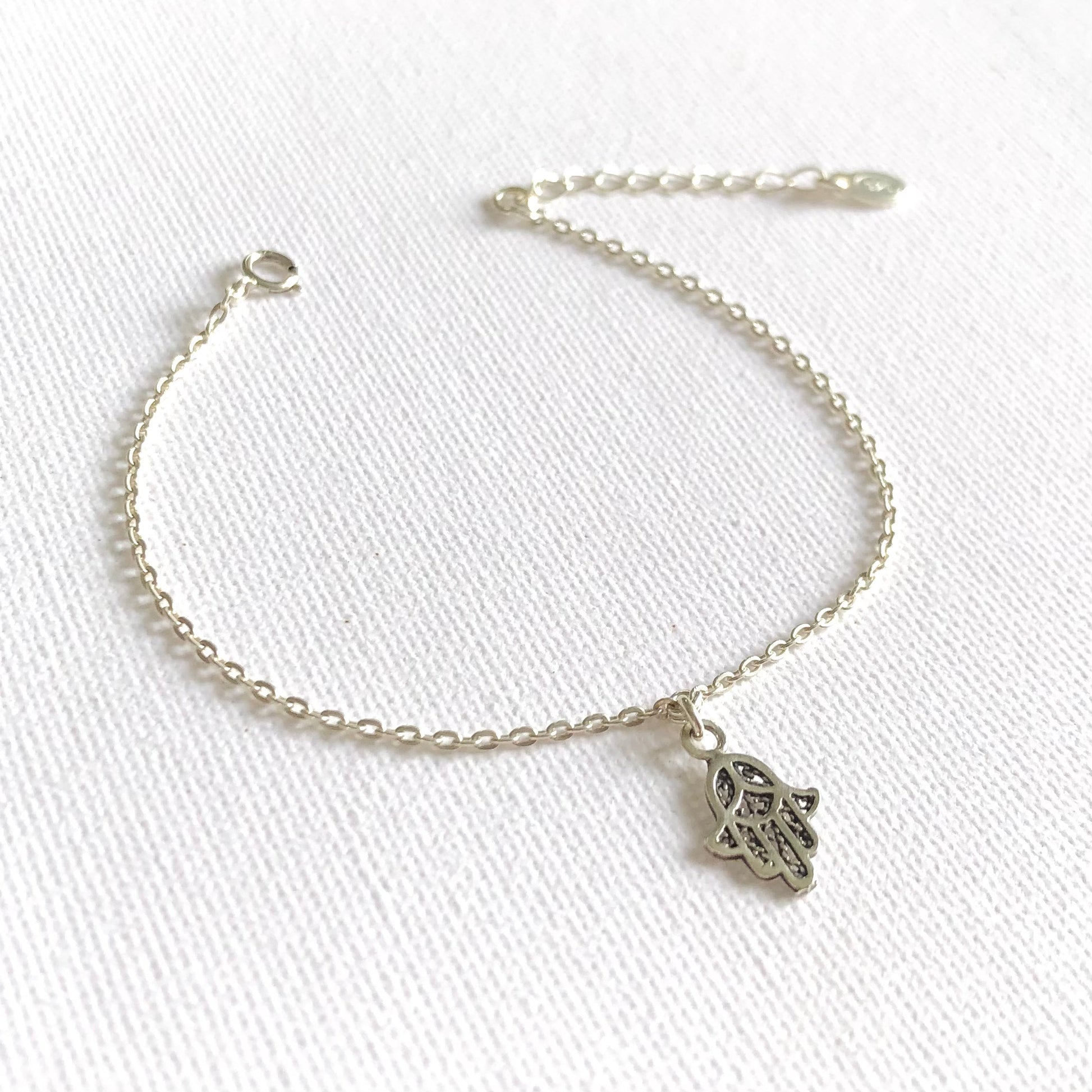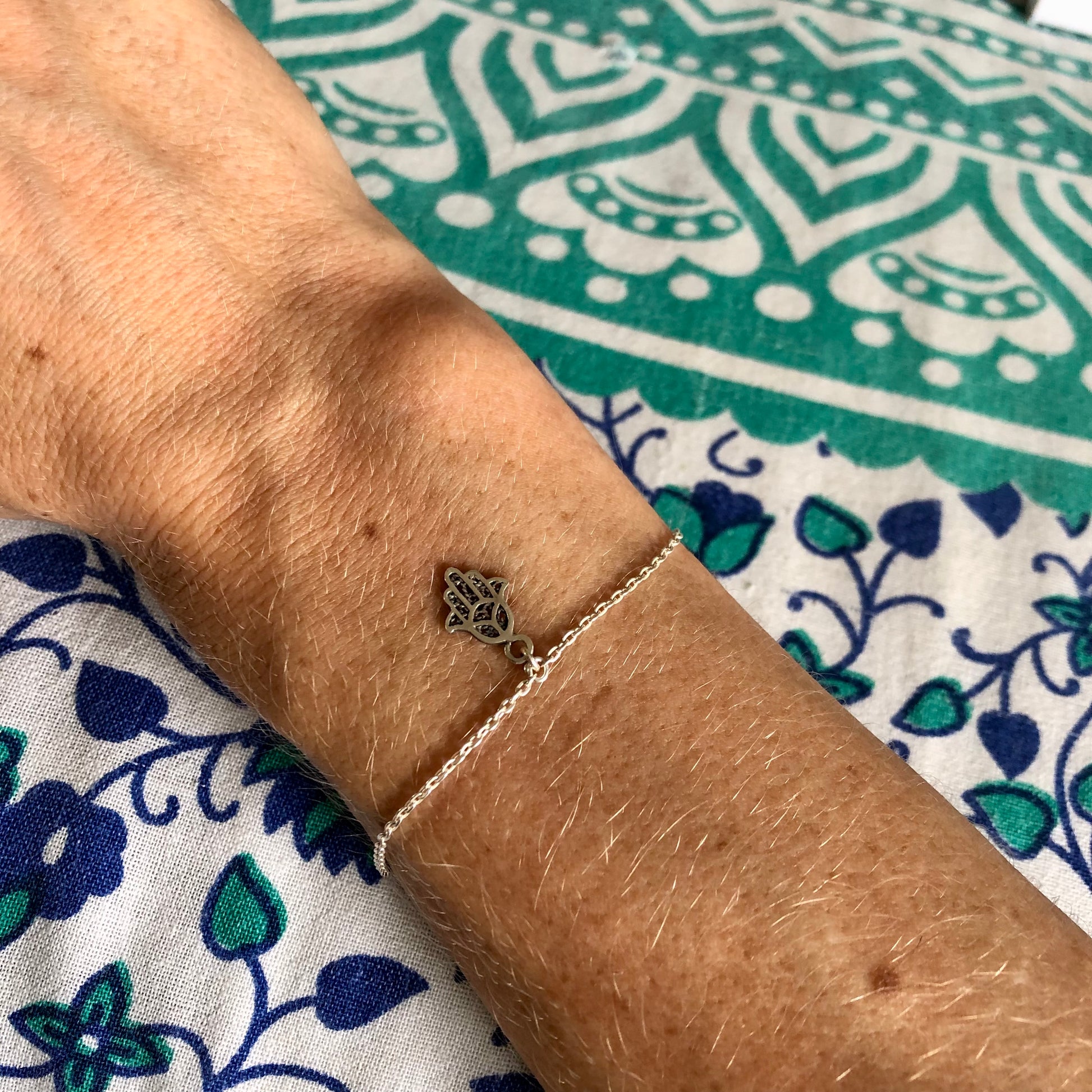 Una delicada pulsera realizada con una cadena de plata y un charm de la mano de Fatma.