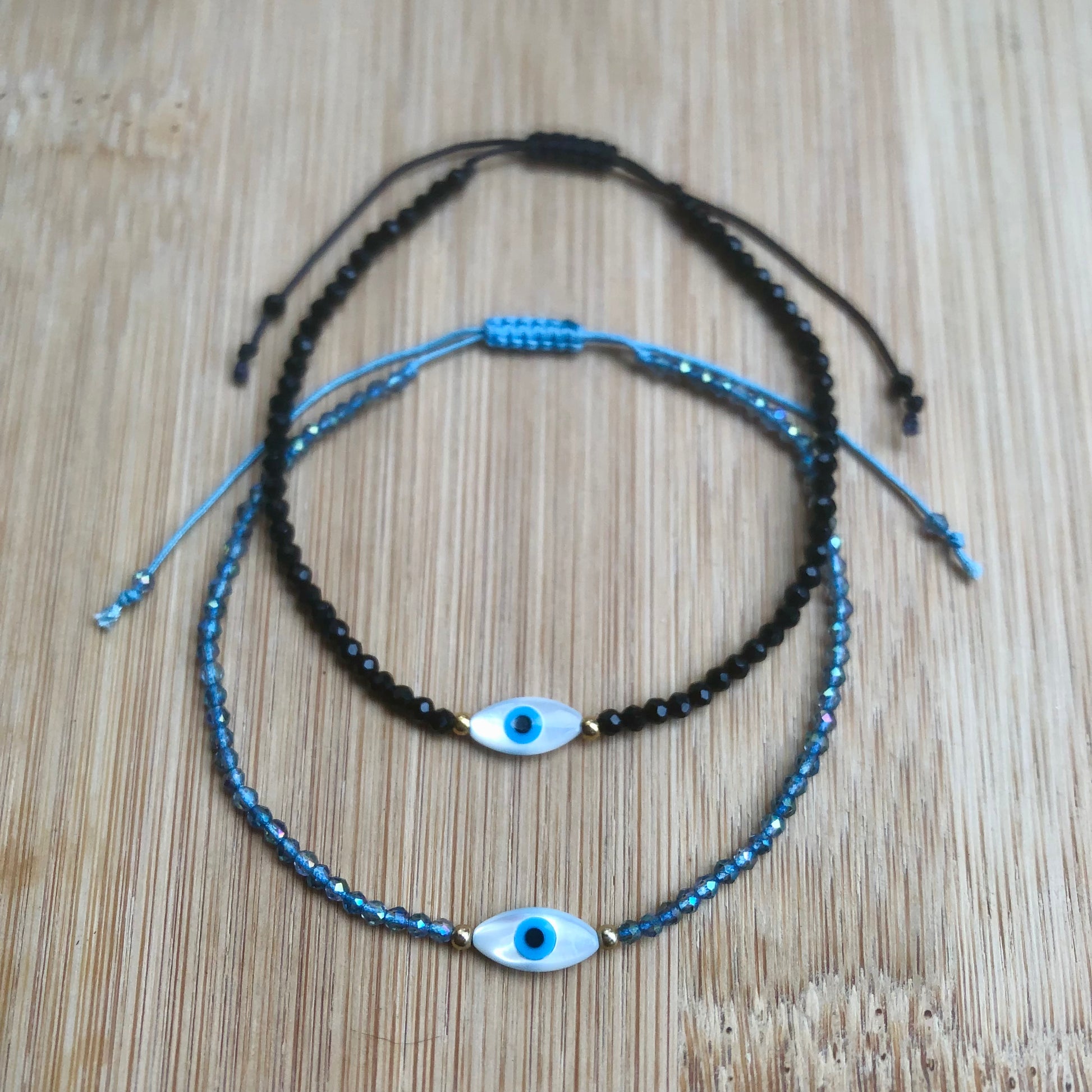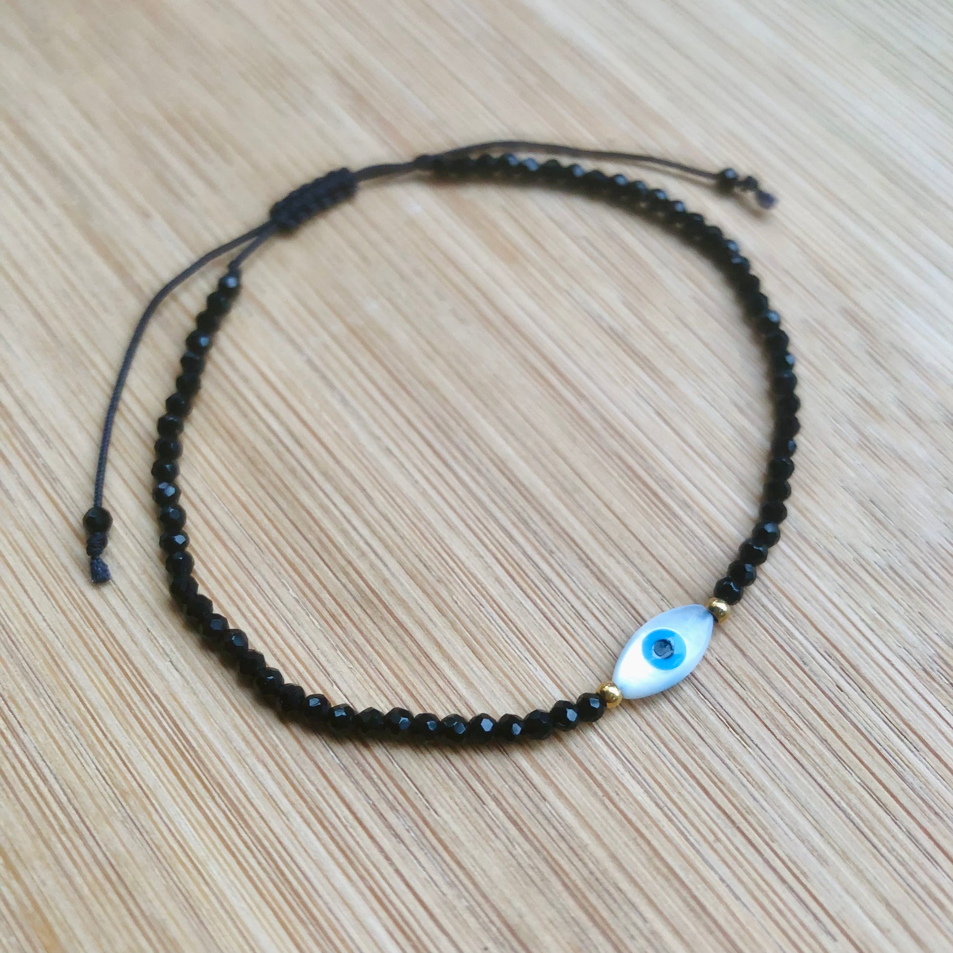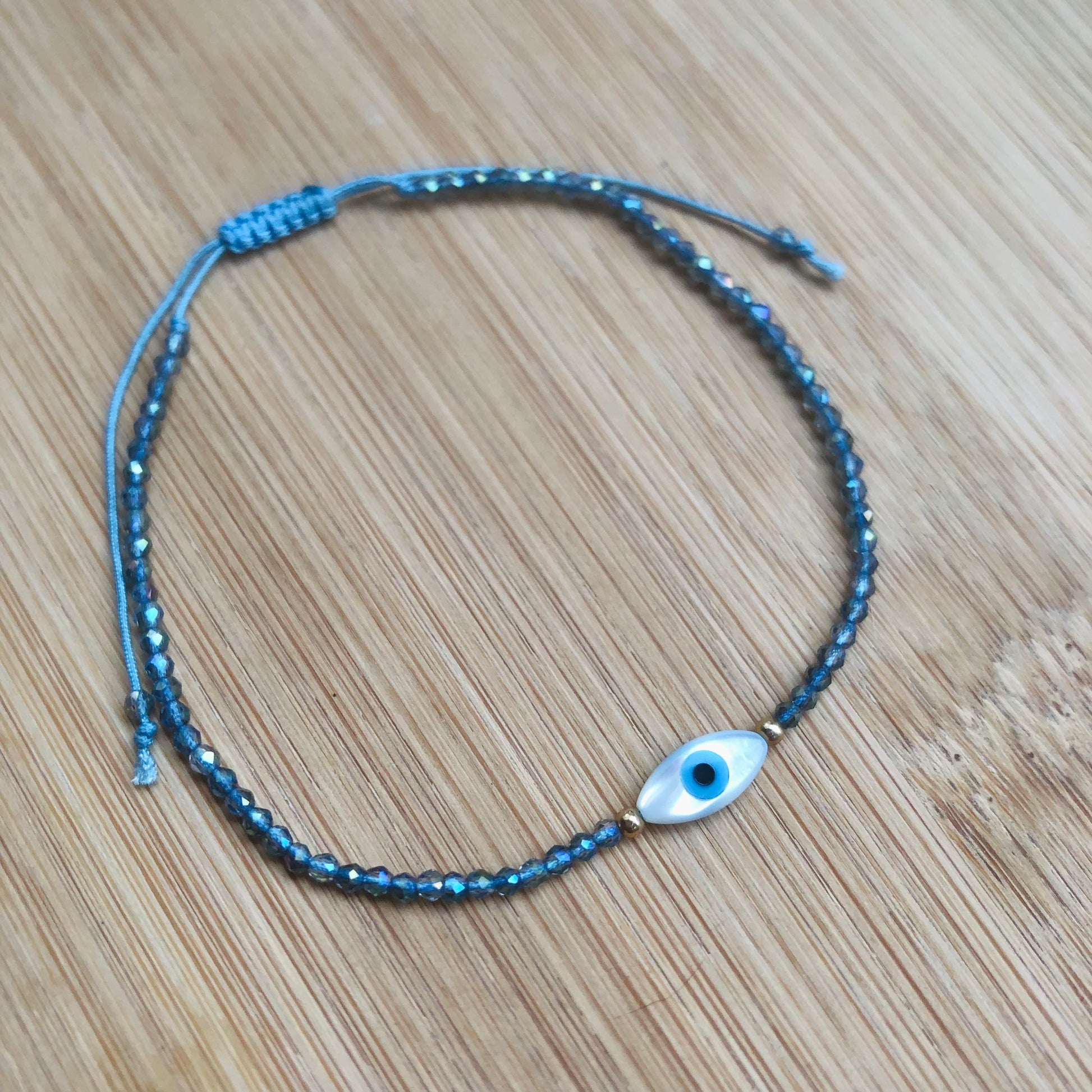 A bracelet made with crystal glass beads and an eye charm made with mother of pearl.