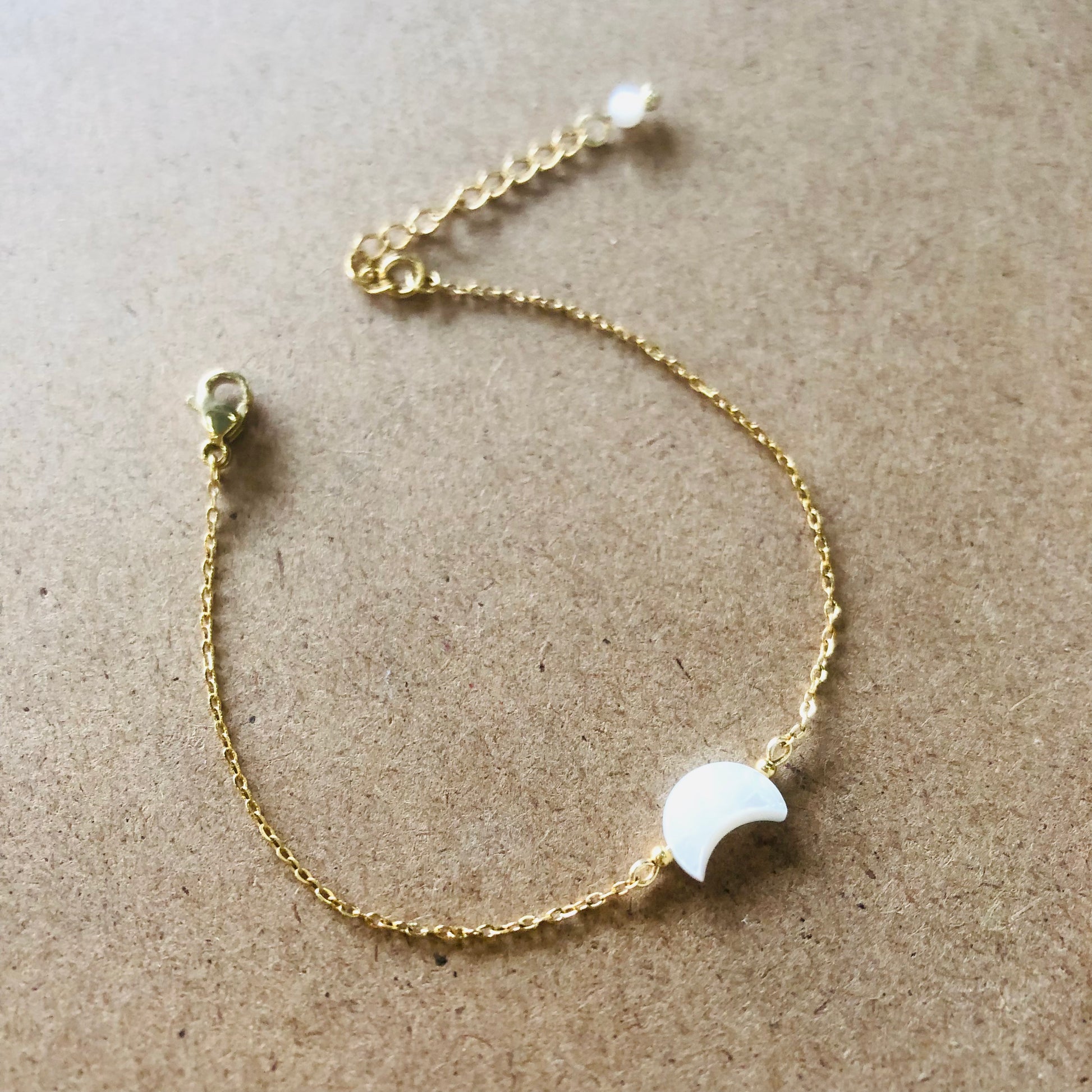 A bracelet made with a thin chain and a moon charm made in mother of pearl.