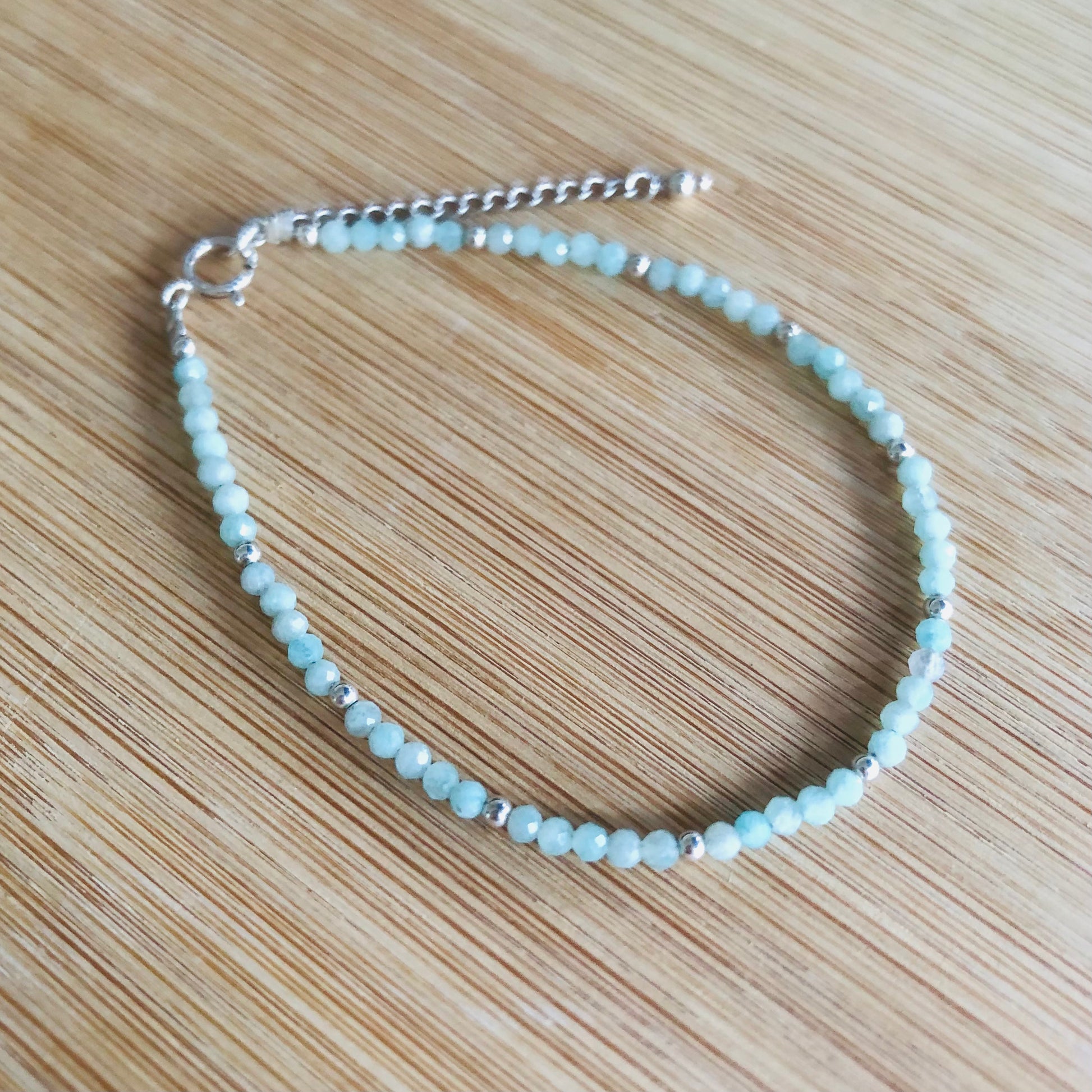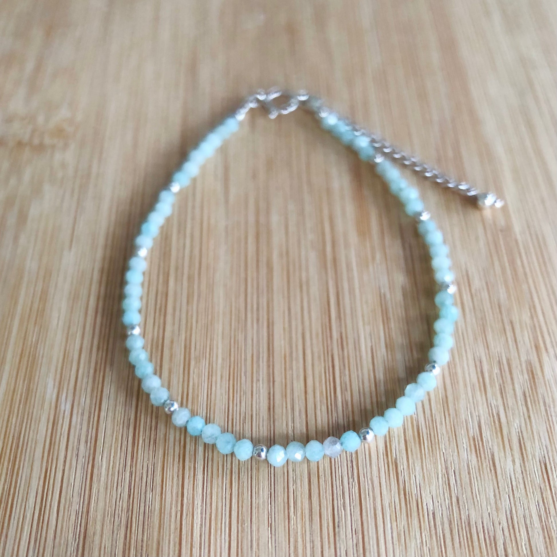 A thin bracelet made with light blue amazonite stone beads and some silver beads.