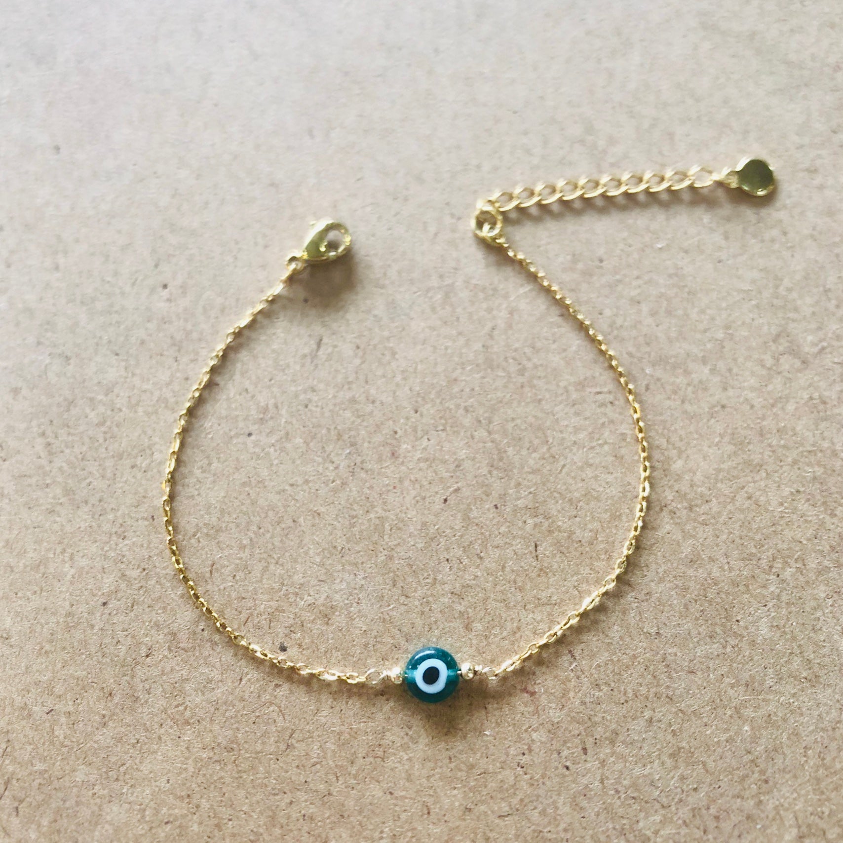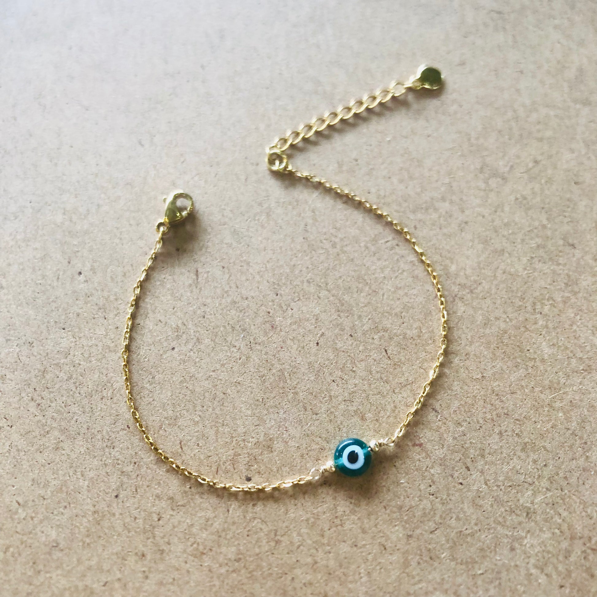 A bracelet made with a thin chain and a Greek eye talisman (Matiasma).