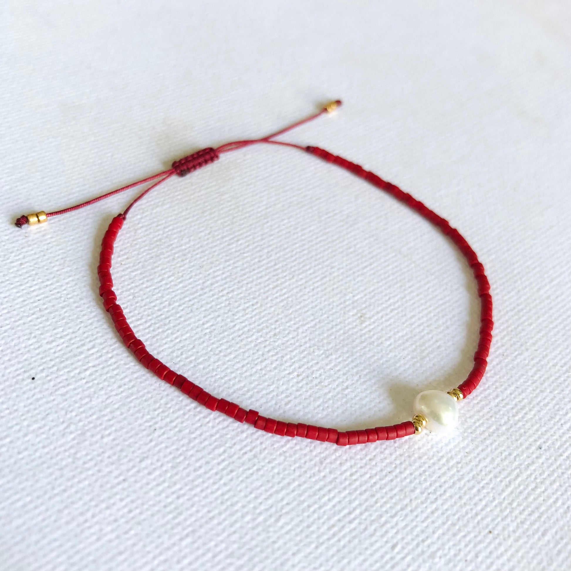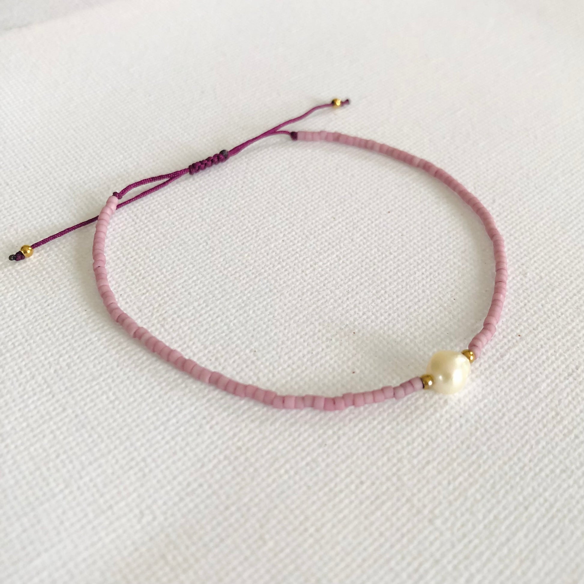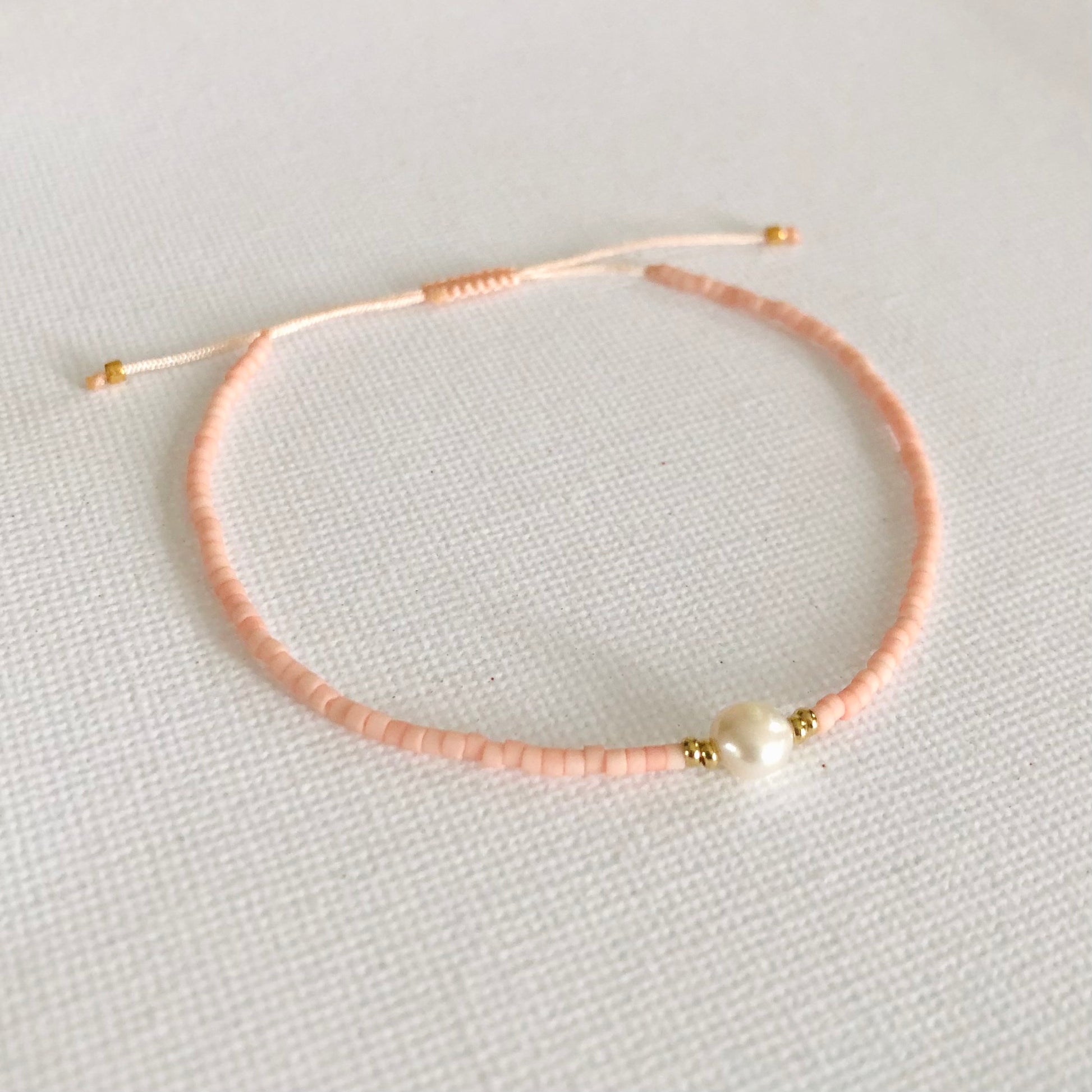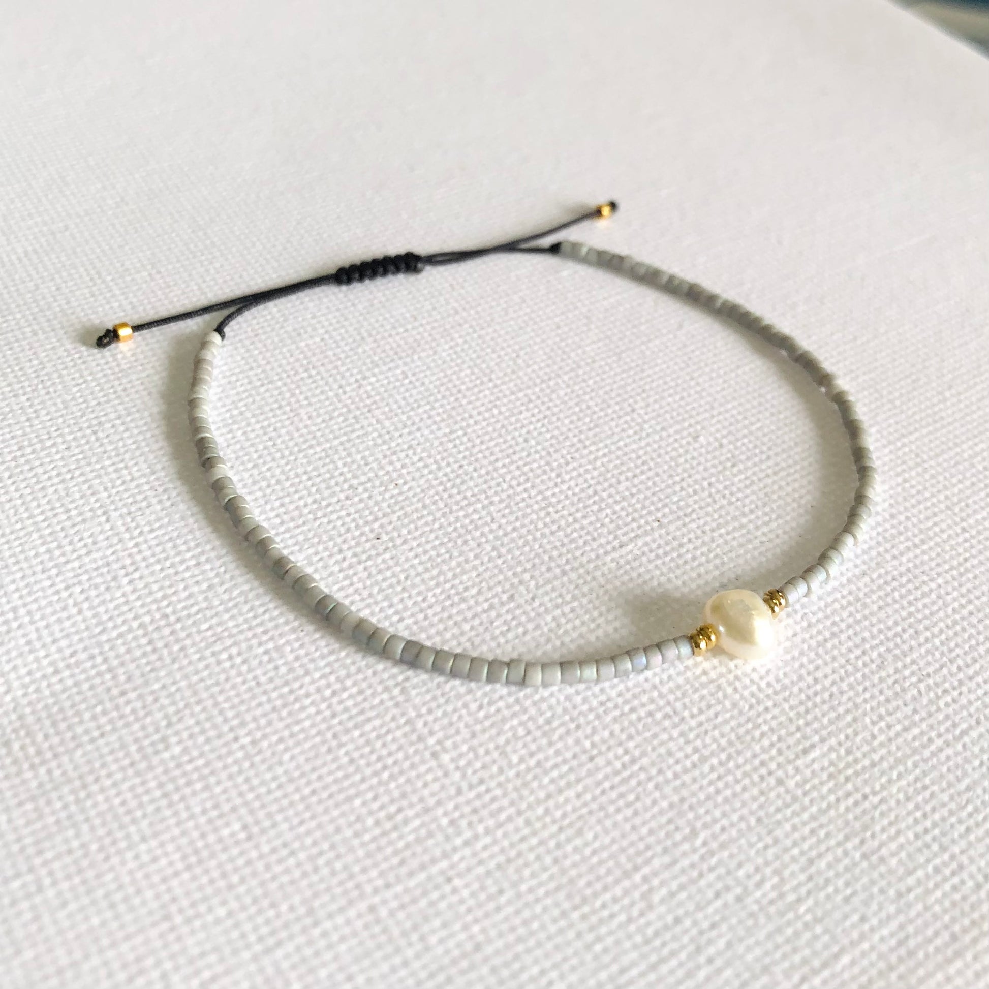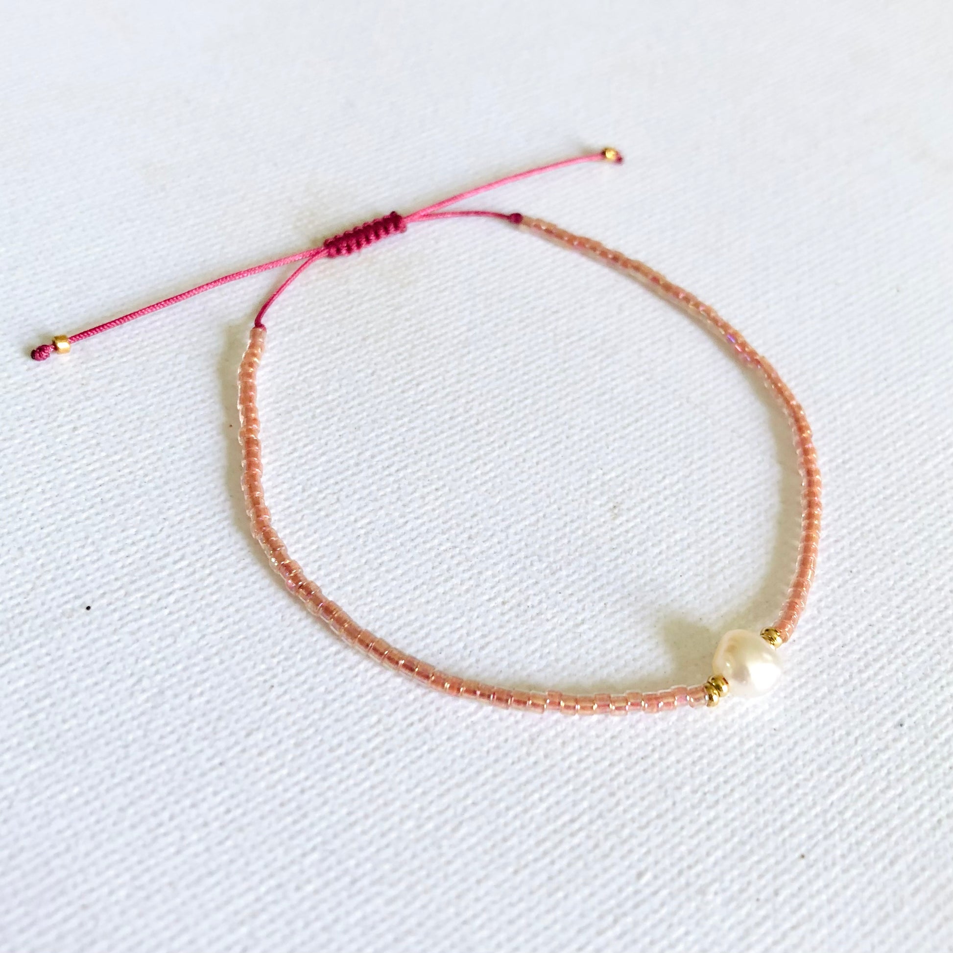Una pulsera hecha con cuentas de vidrio japonés (Miyuki Beads), una perla blanca de agua dulce y unas cuentas de acero inoxidable bañadas en oro.
