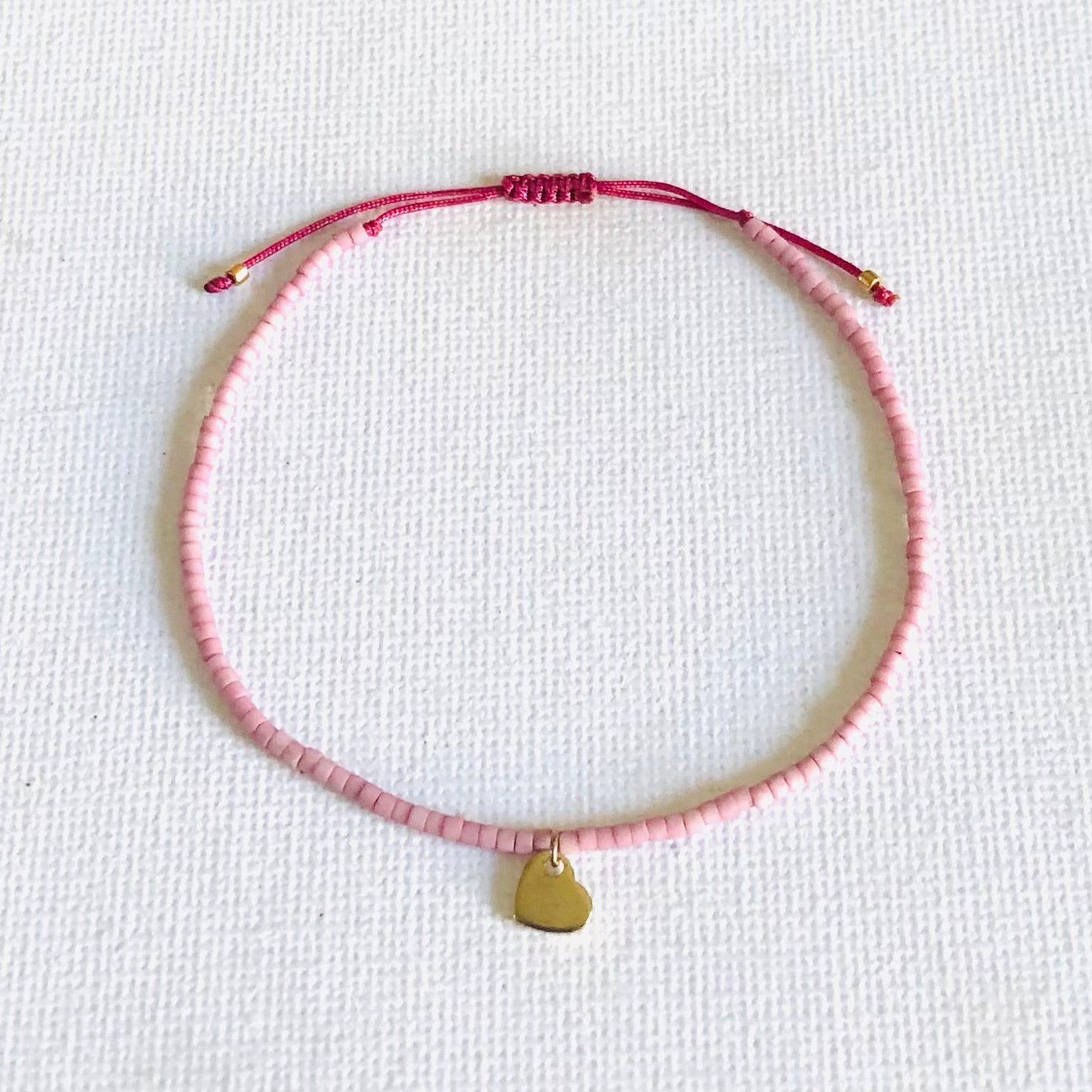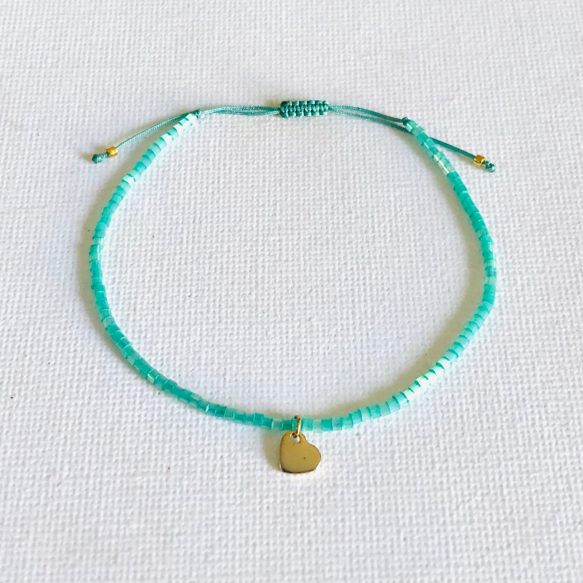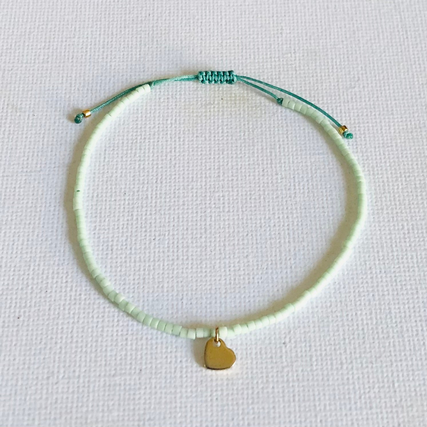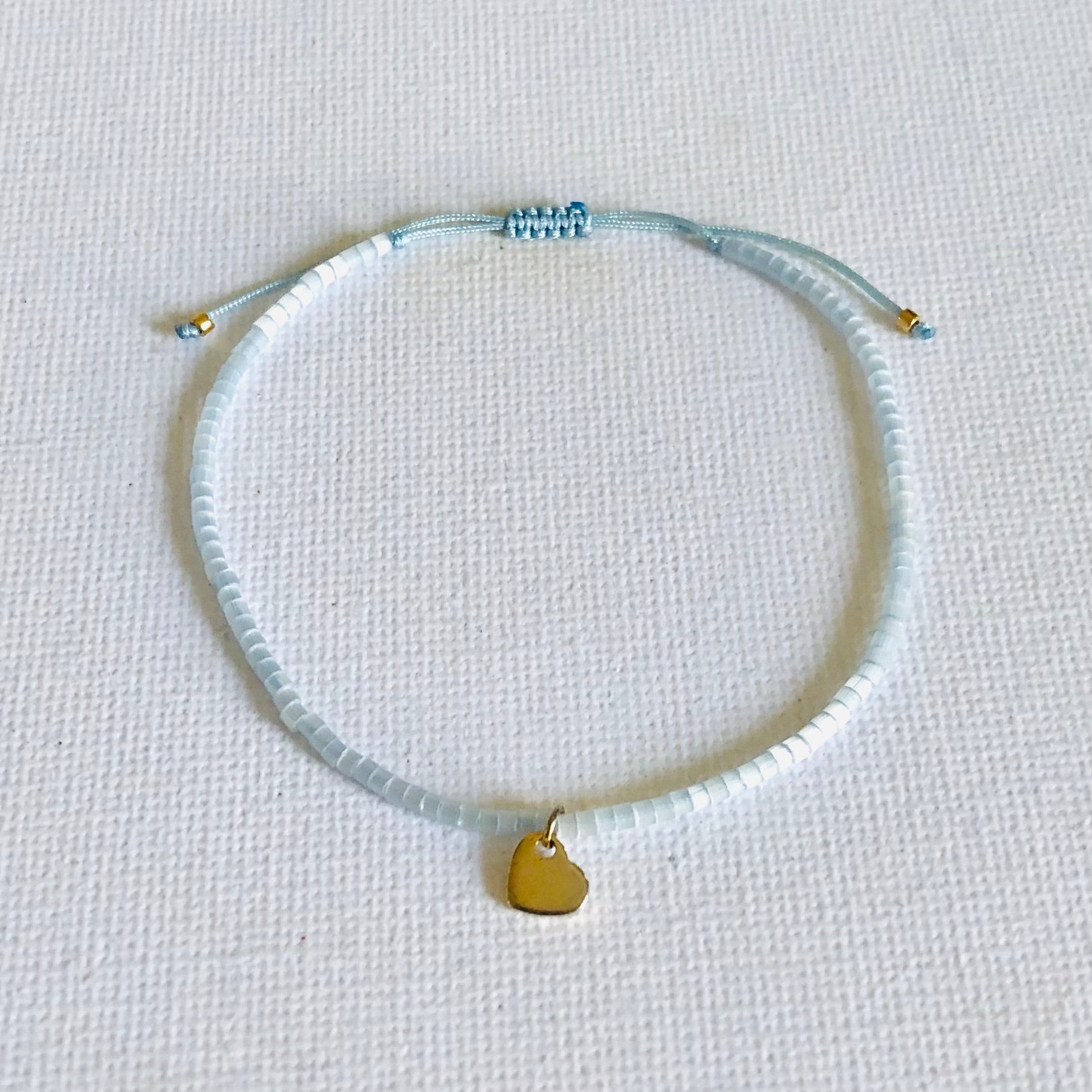 Una pulsera hecha con cuentas de vidrio japonés (Miyuki Beads), un mini charm de corazón y unas cuentas de acero inoxidable bañadas en oro.