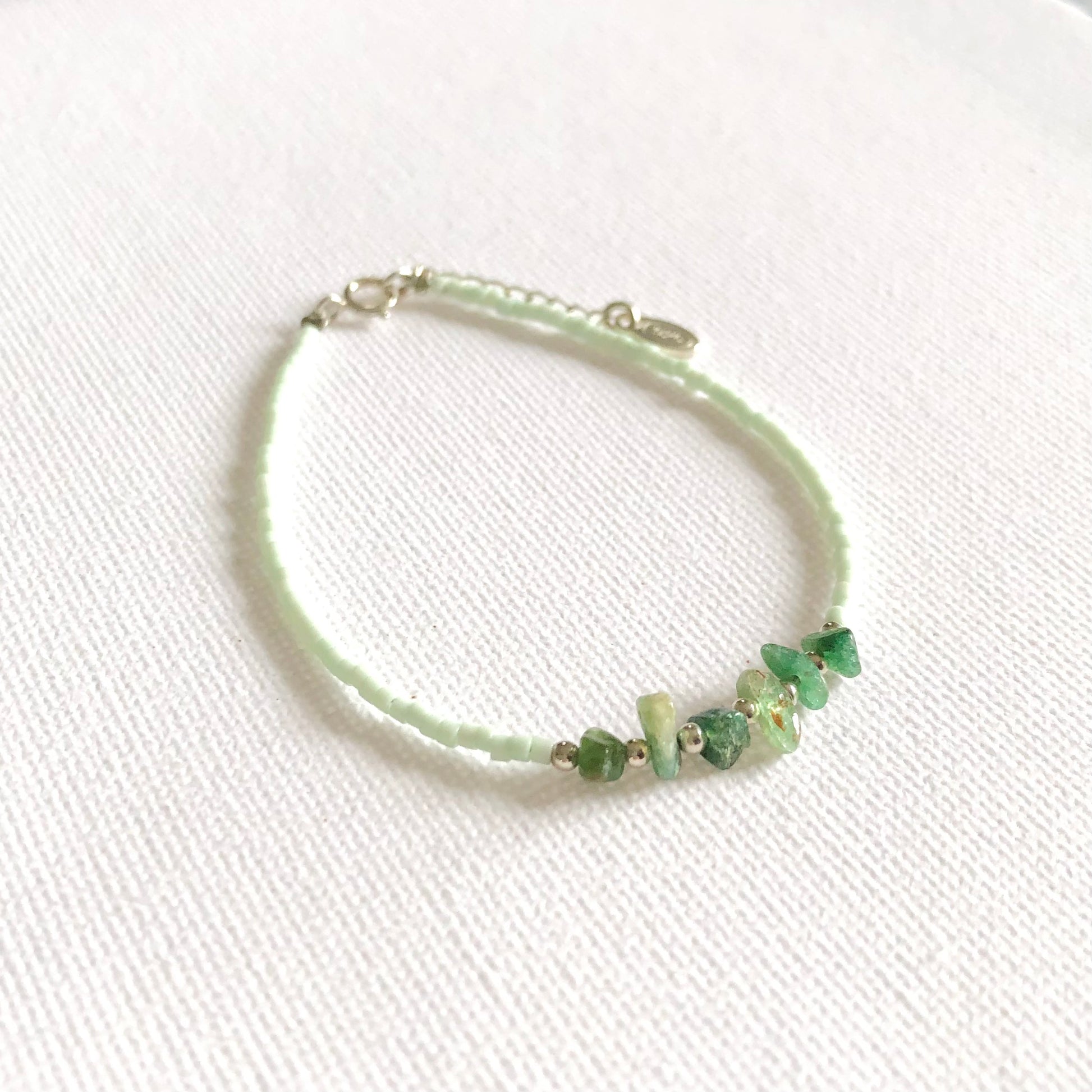 Una pulsera hecha con cuentas de vidrio japonés (Miyuki Beads), cuentas de plata y cuentas de piedras.