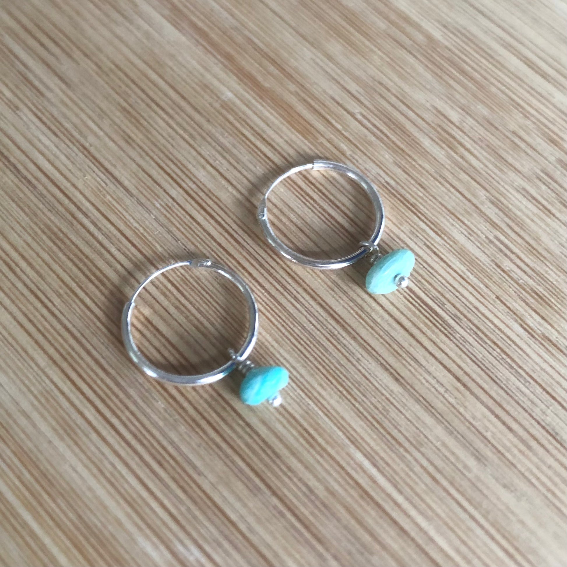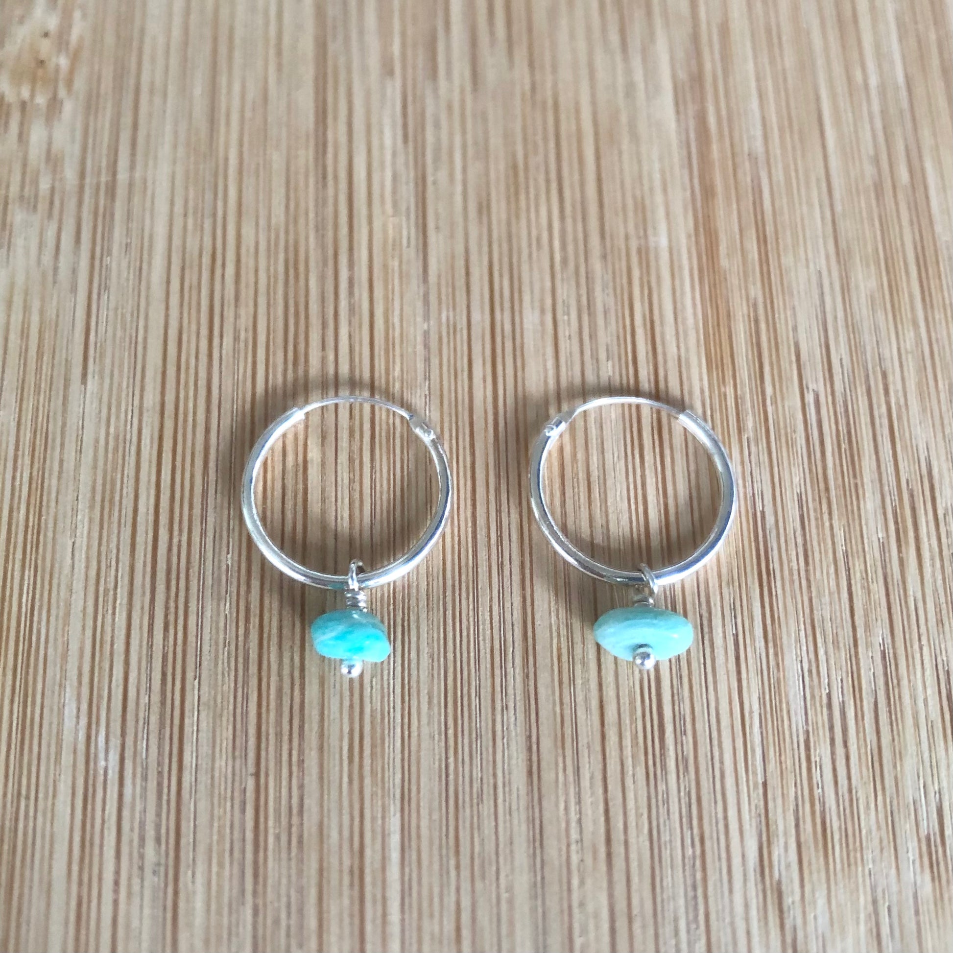 Hoop silver earrings made with a raw bead of blue amazonite stone.