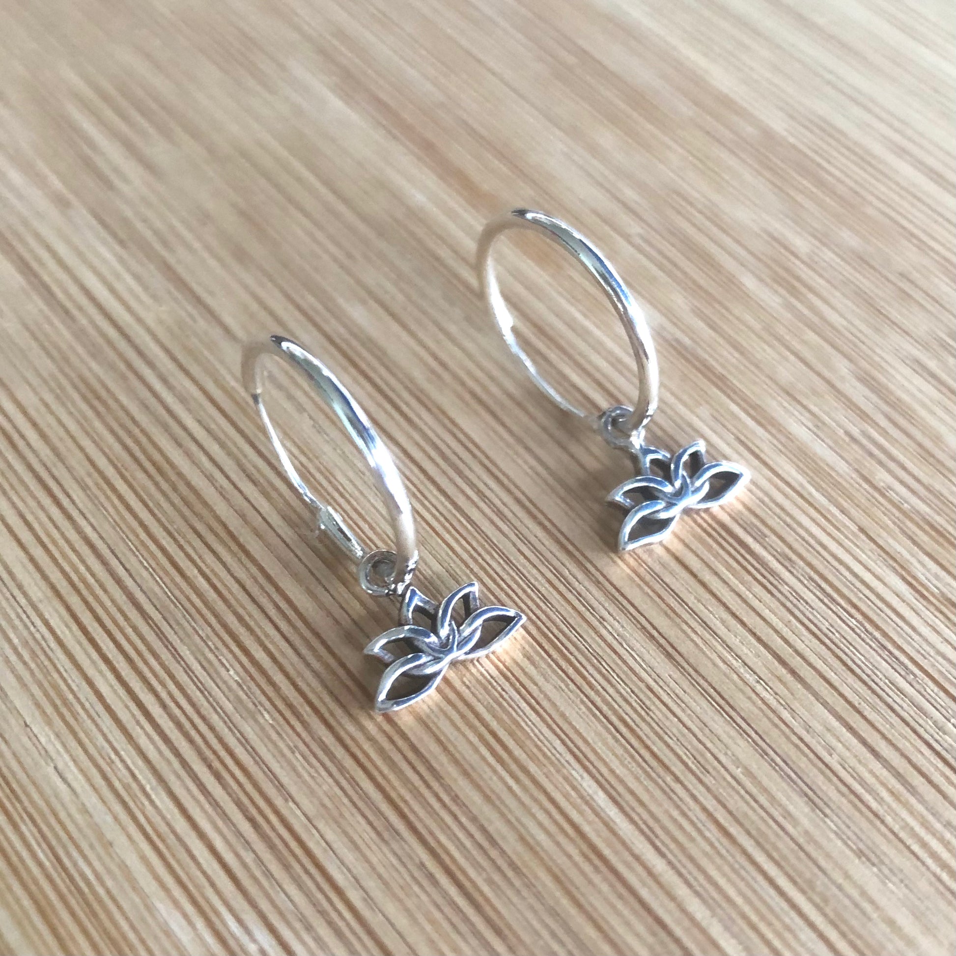Hoop silver earrings made with a mini lotus flower pendant.