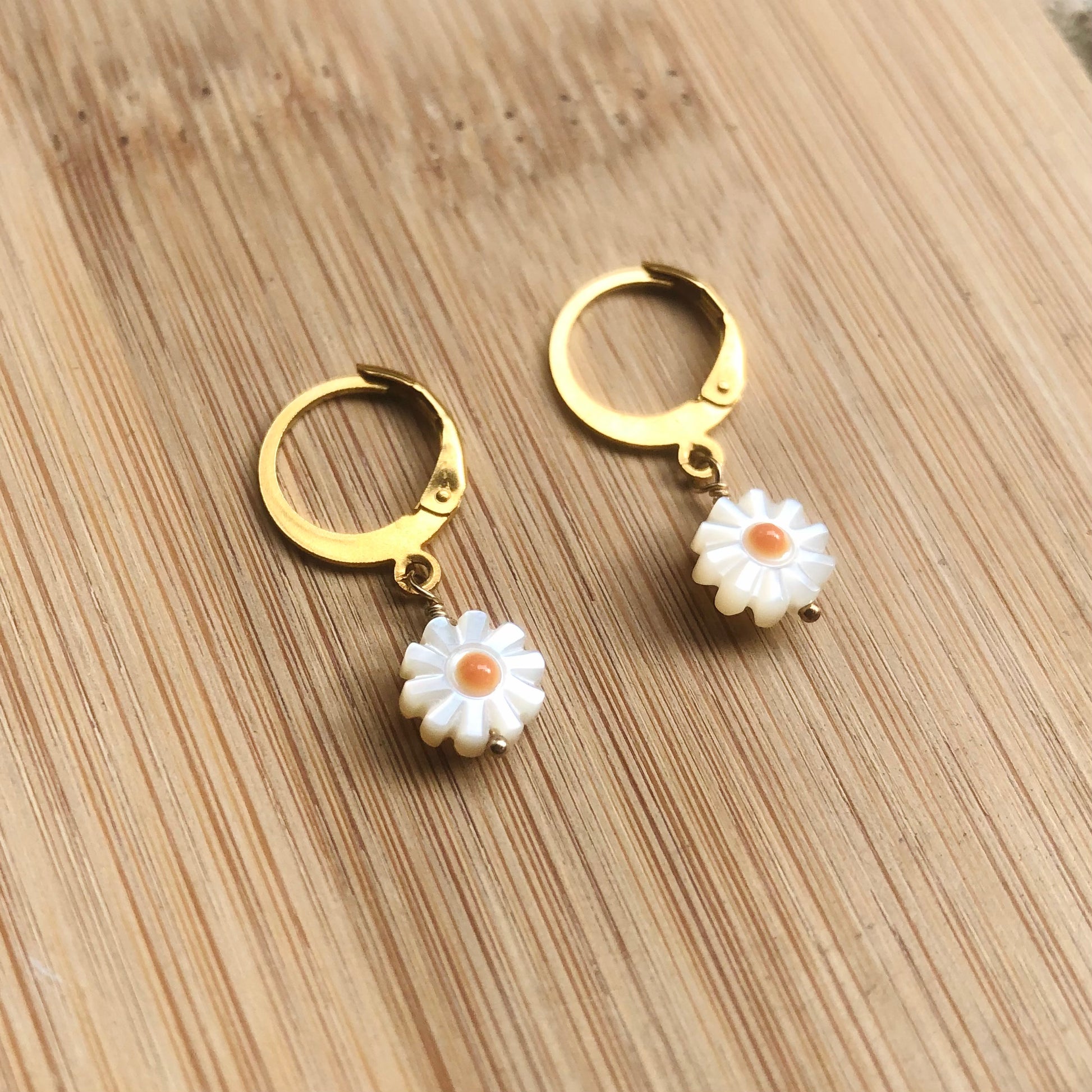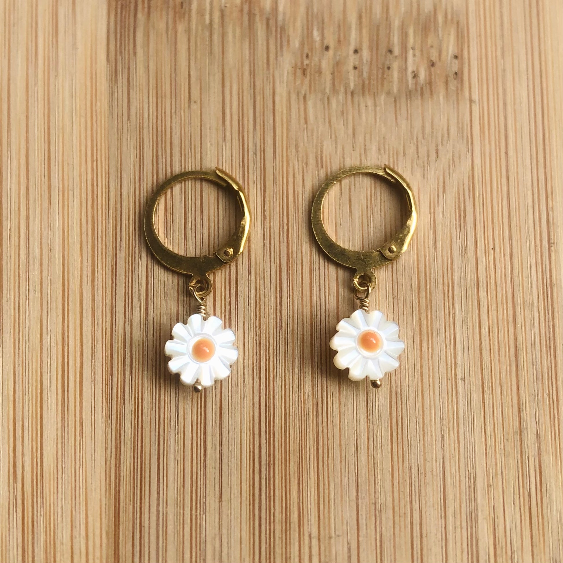 Hoops earrings made mother of pearl Marguerite flower charm.