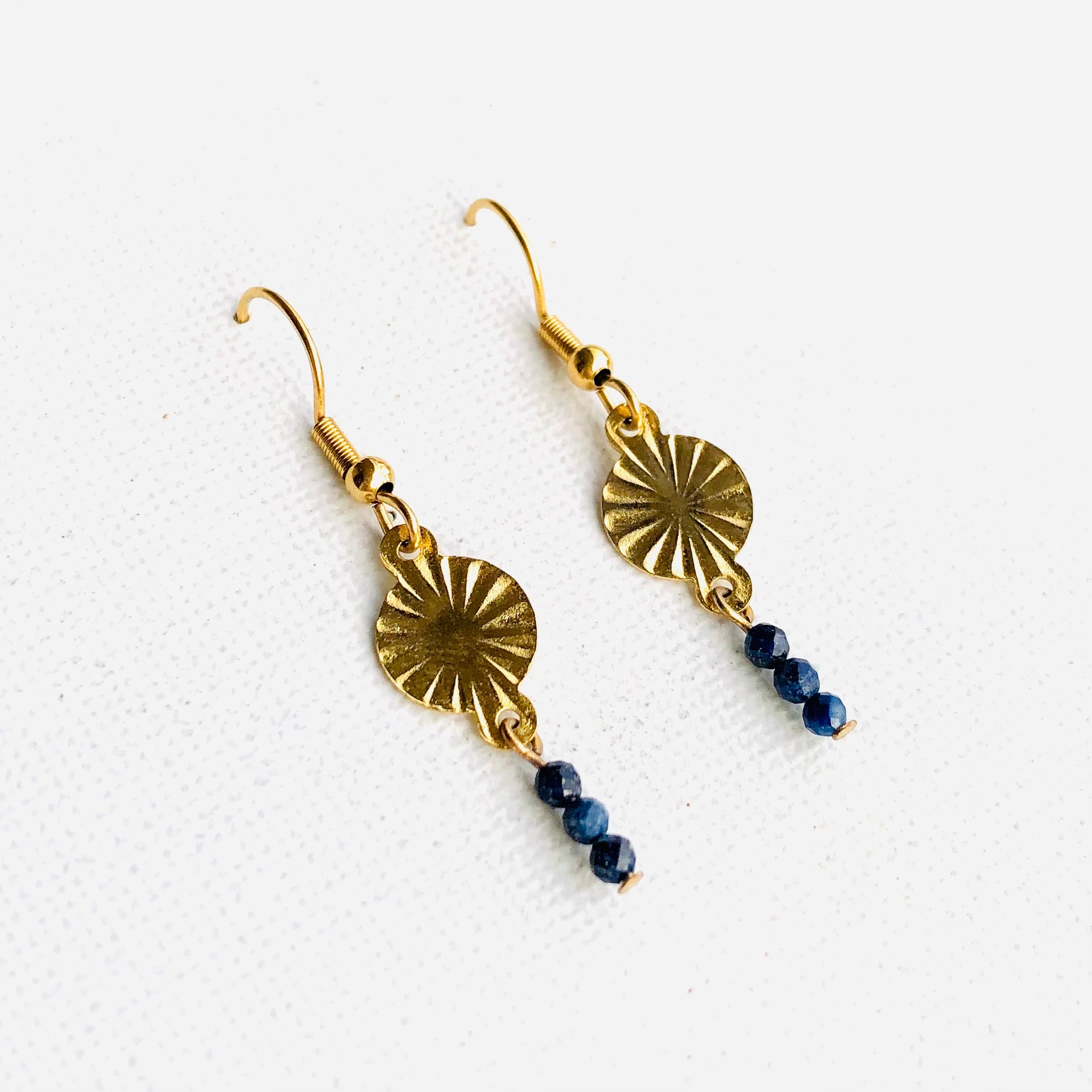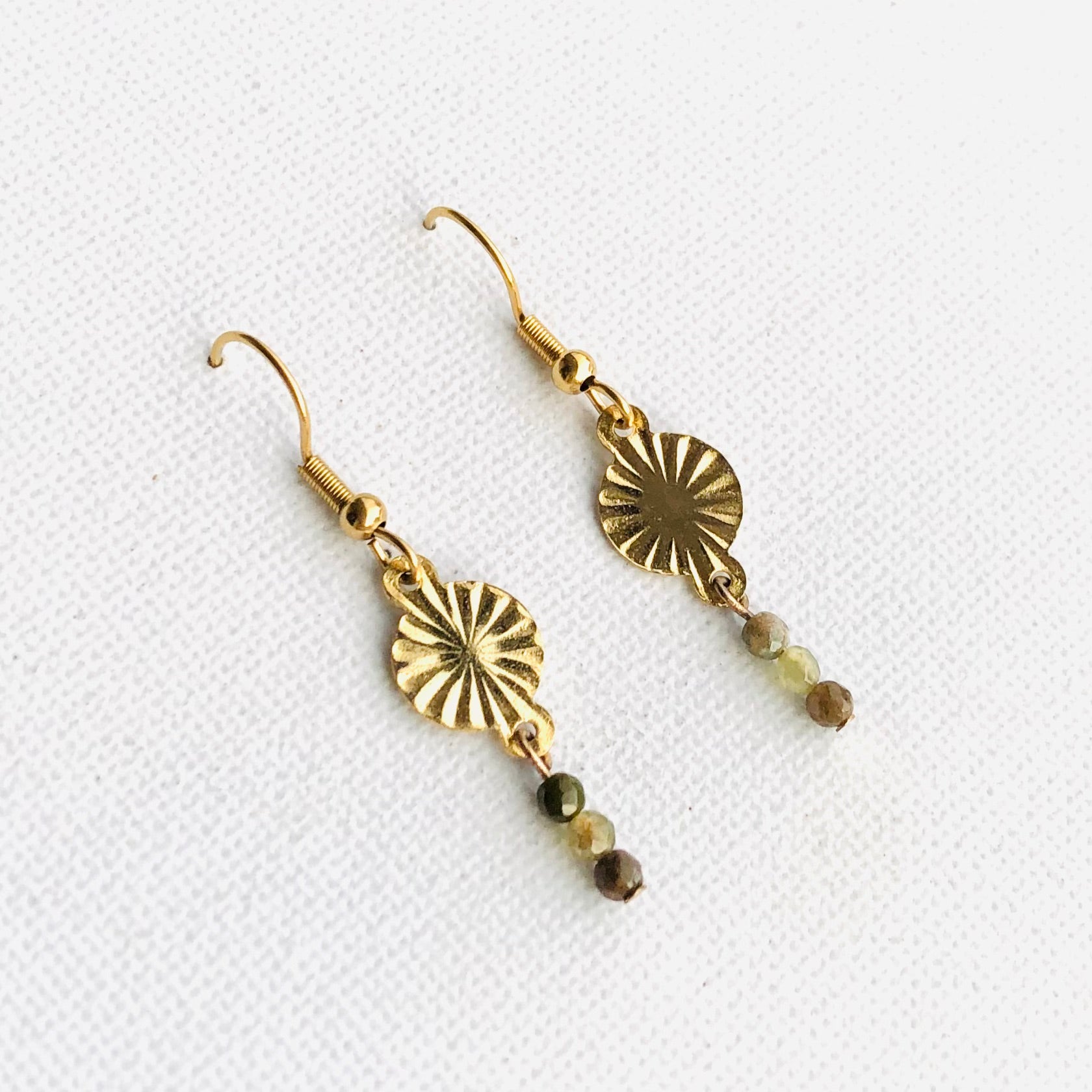 Dangling earrings with a gold plated stainless steel charm and 3 stone beads.