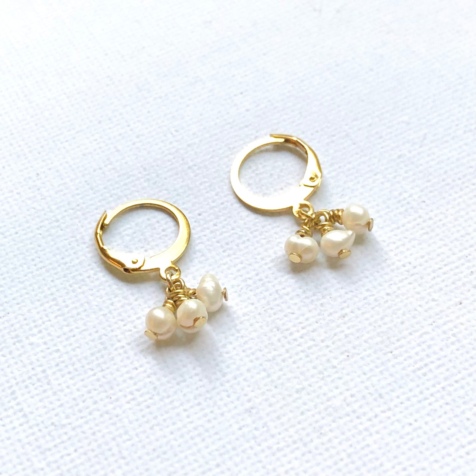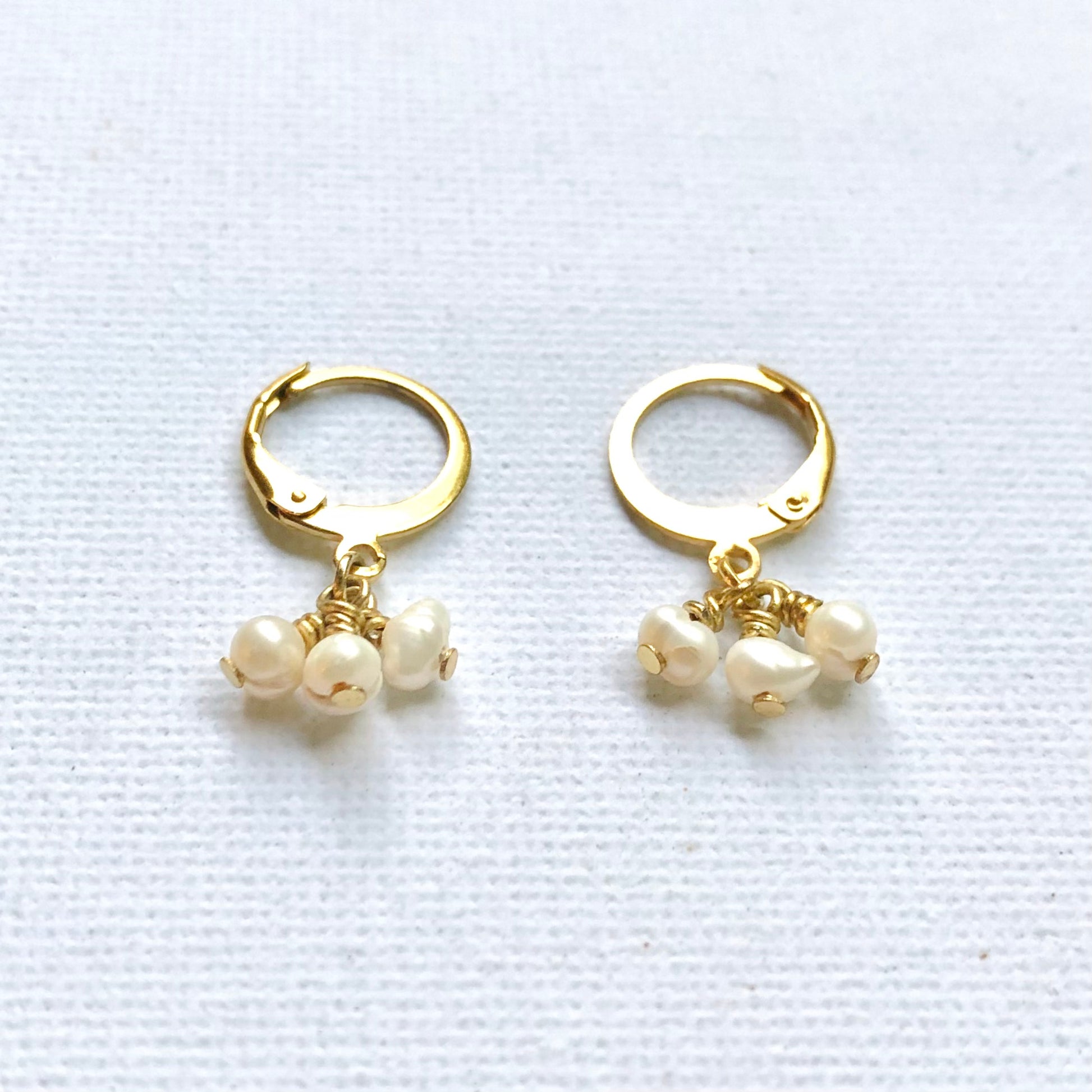 Pendientes de aros elaborados con 3 mini perlas blancas de agua dulce.