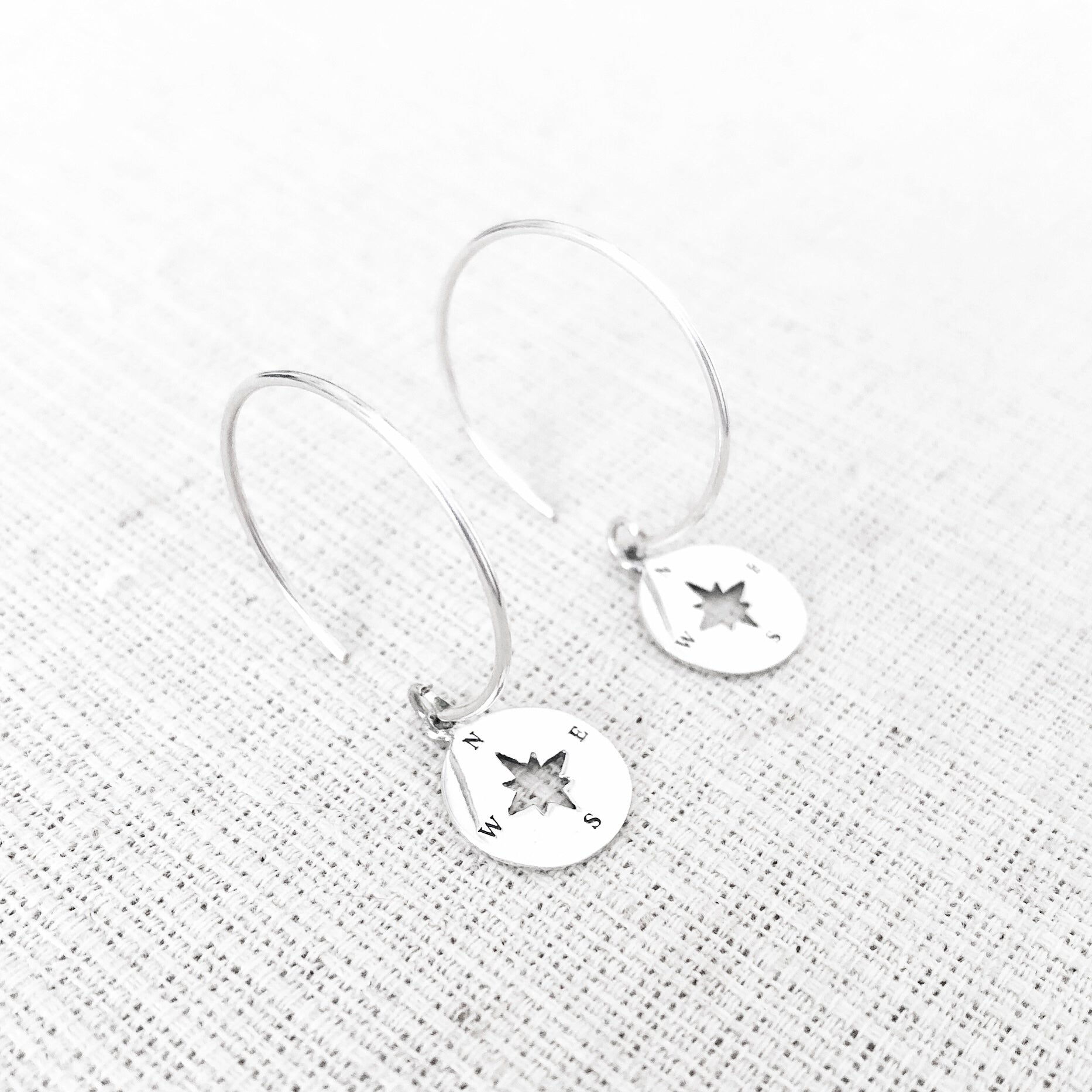 Pendientes de aro de plata con colgante de rosa de los vientos plateada.