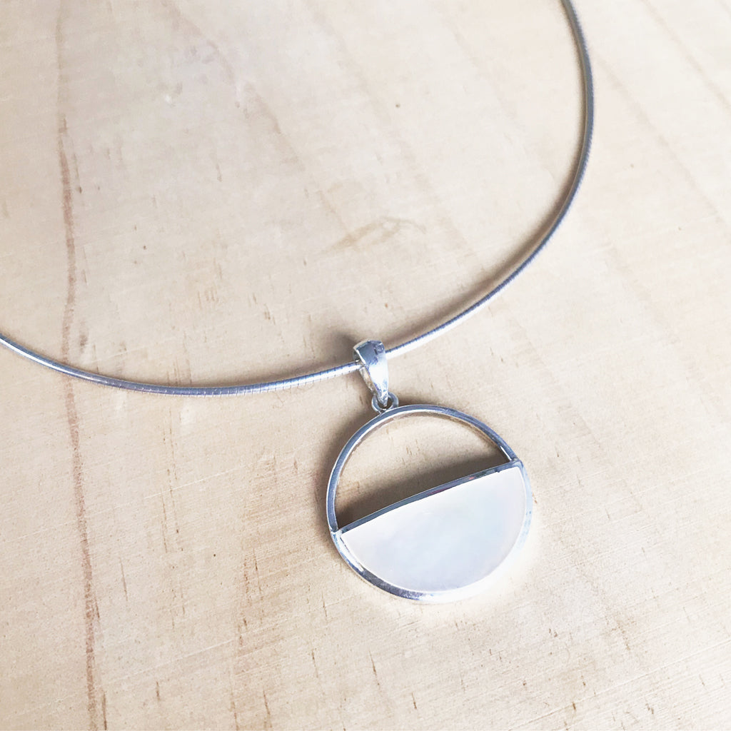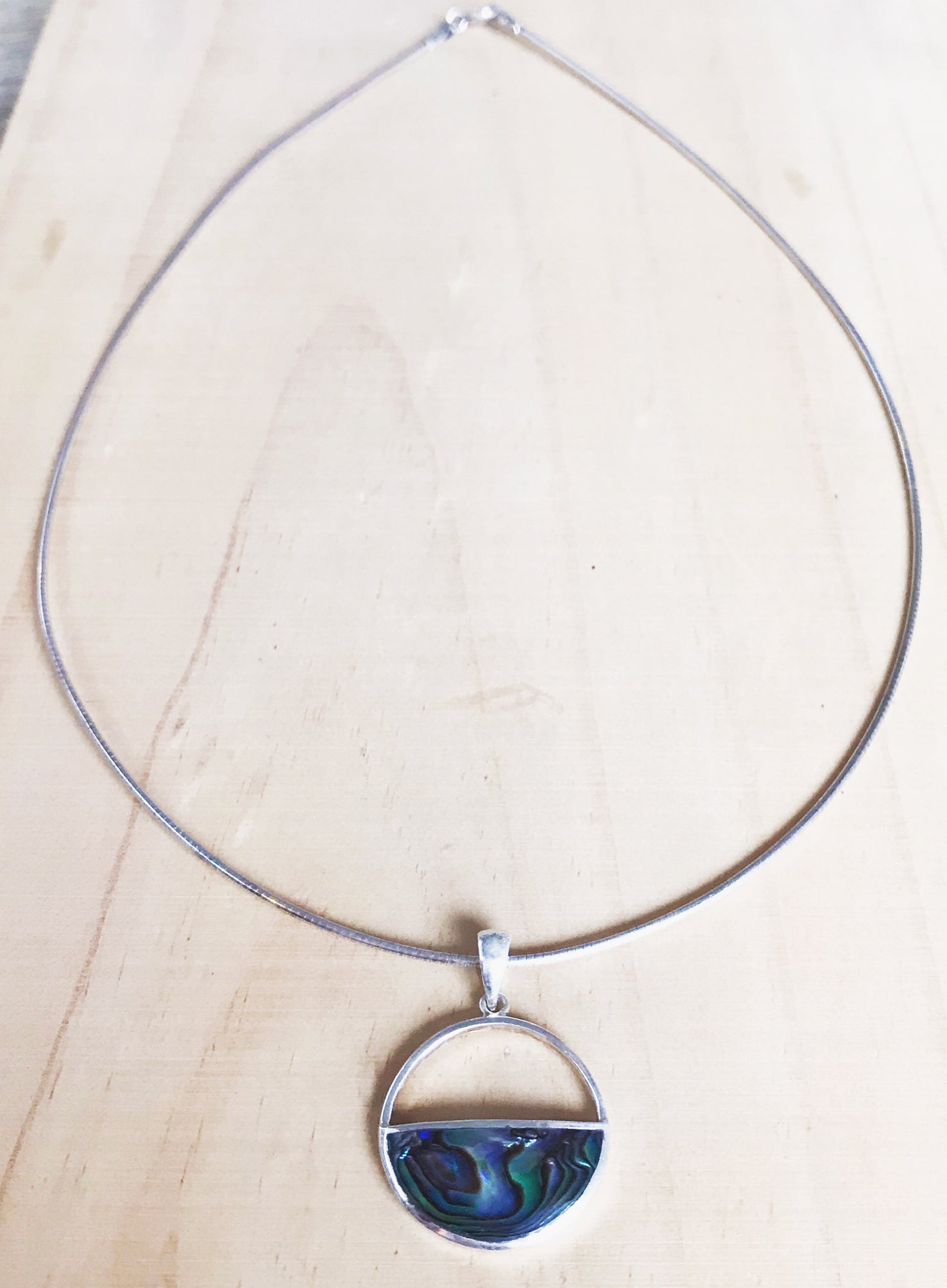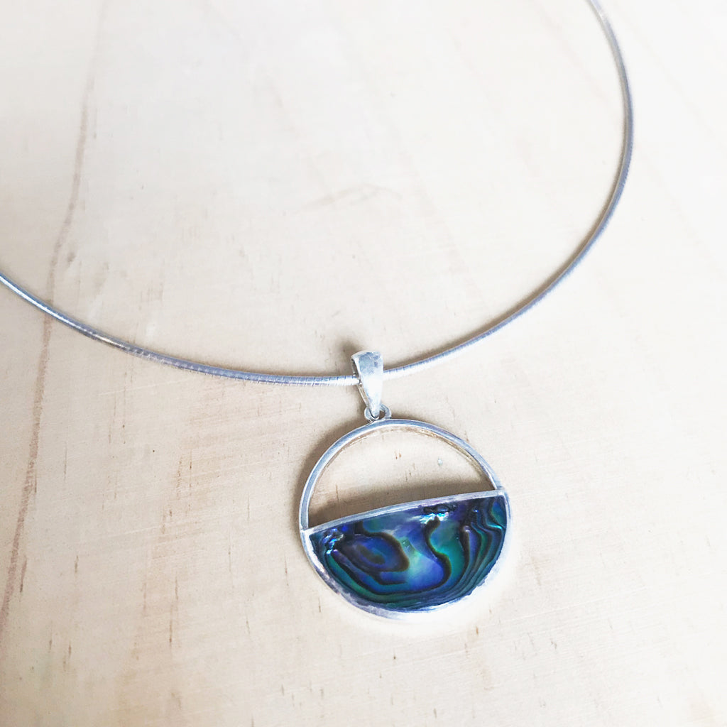 Collar rígido elaborado en plata con un colgante elaborado con concha de abulón (azul) o nácar (blanco).