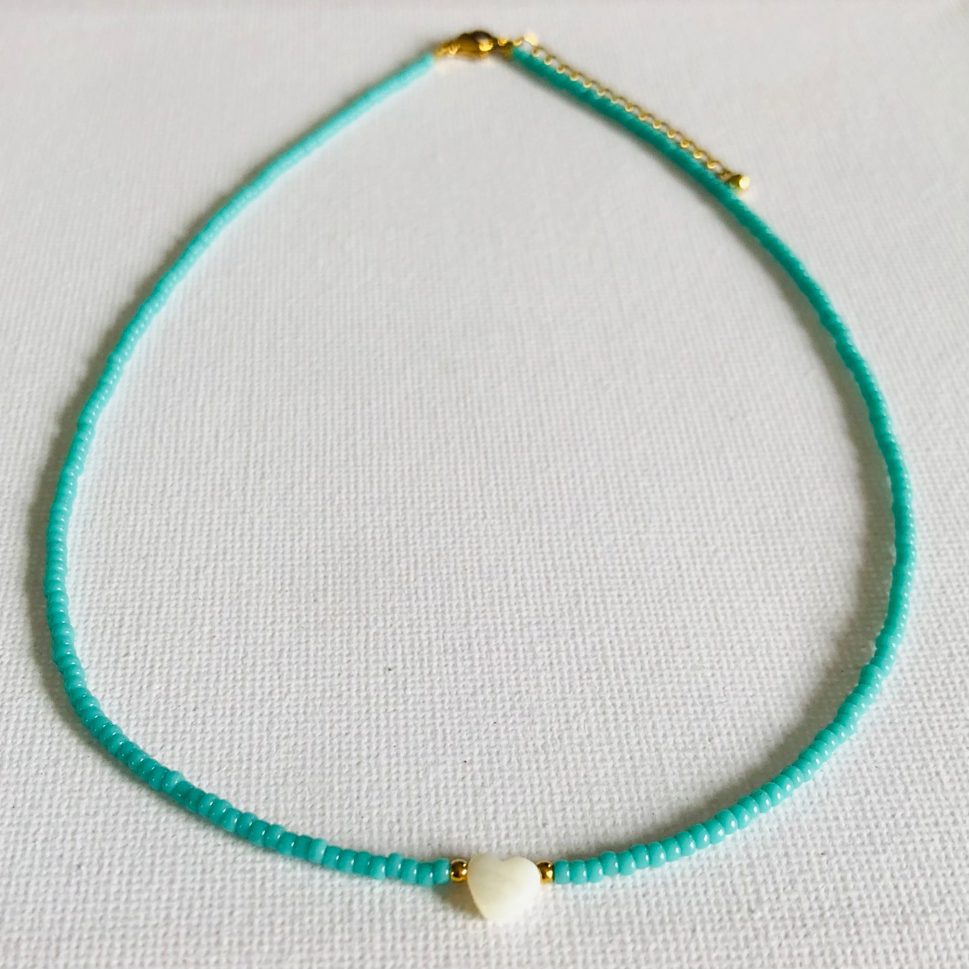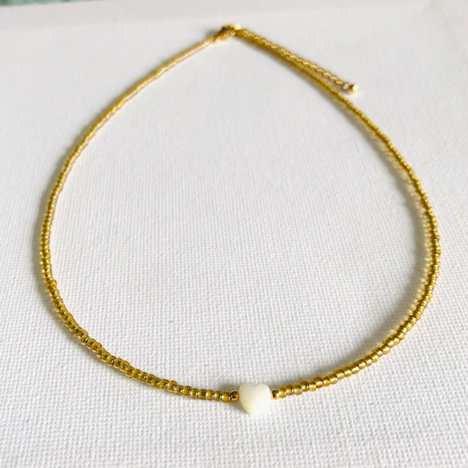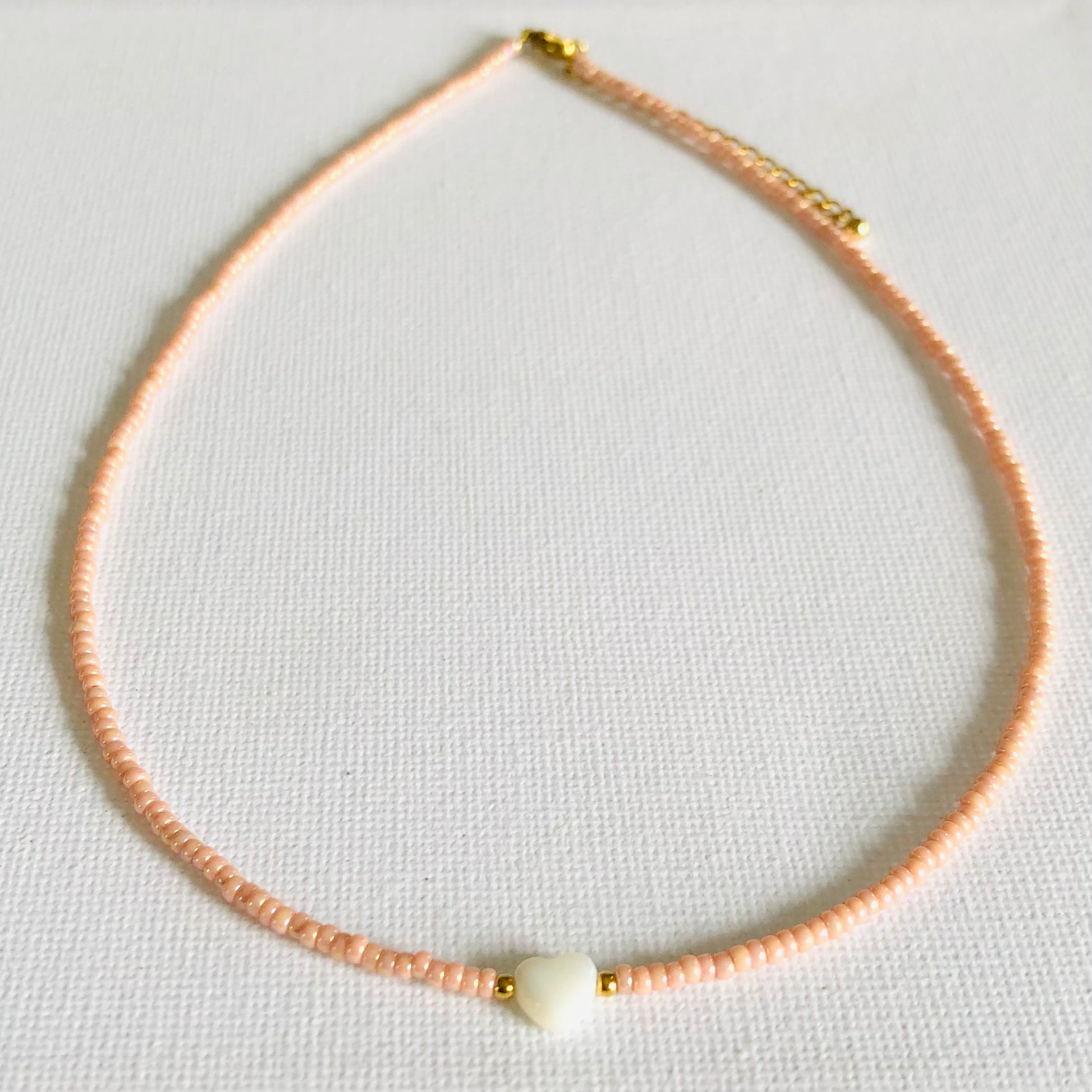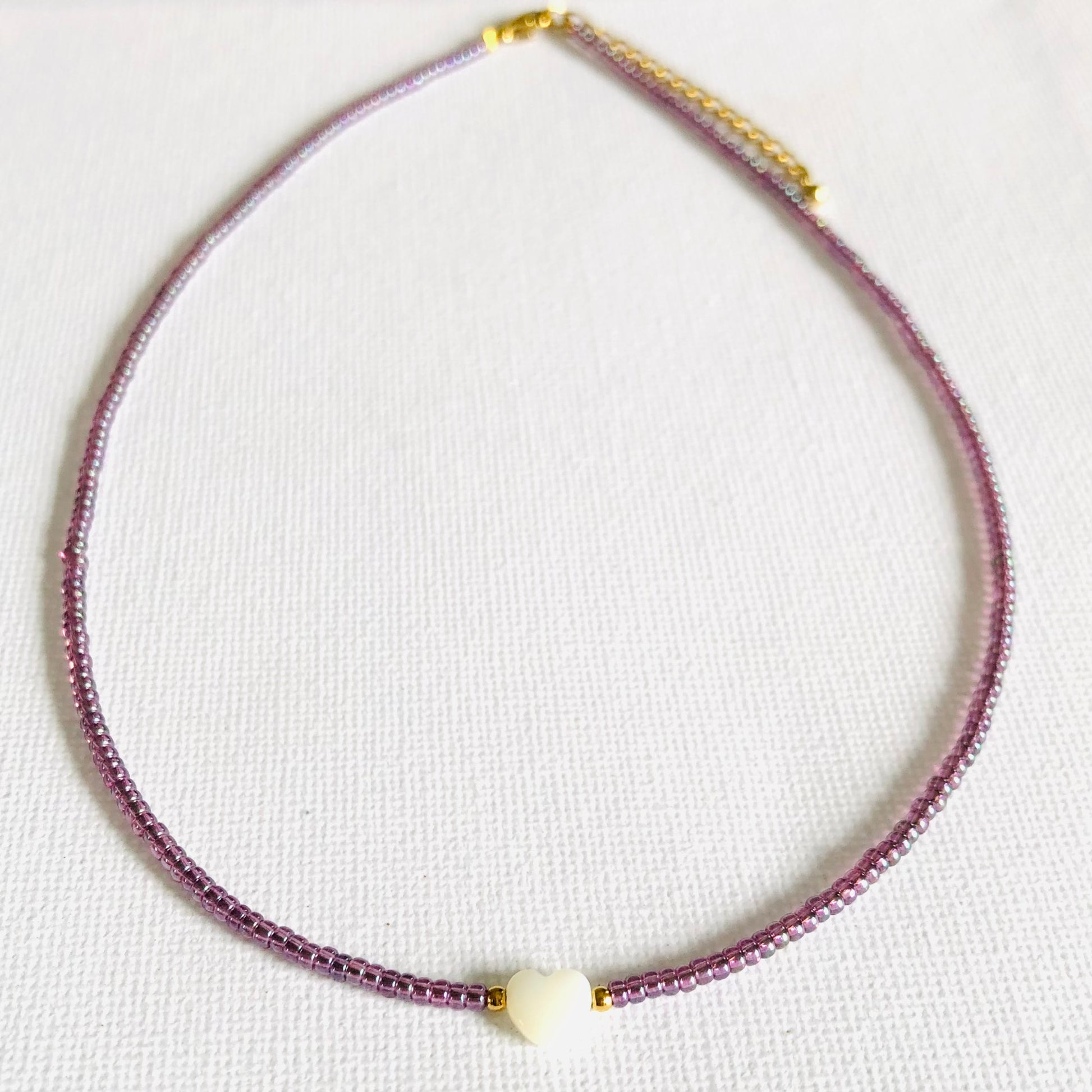 Collar corto elaborado con cuentas de cristal japonés (Miyuki Beads) y un charm de corazón de nácar.
