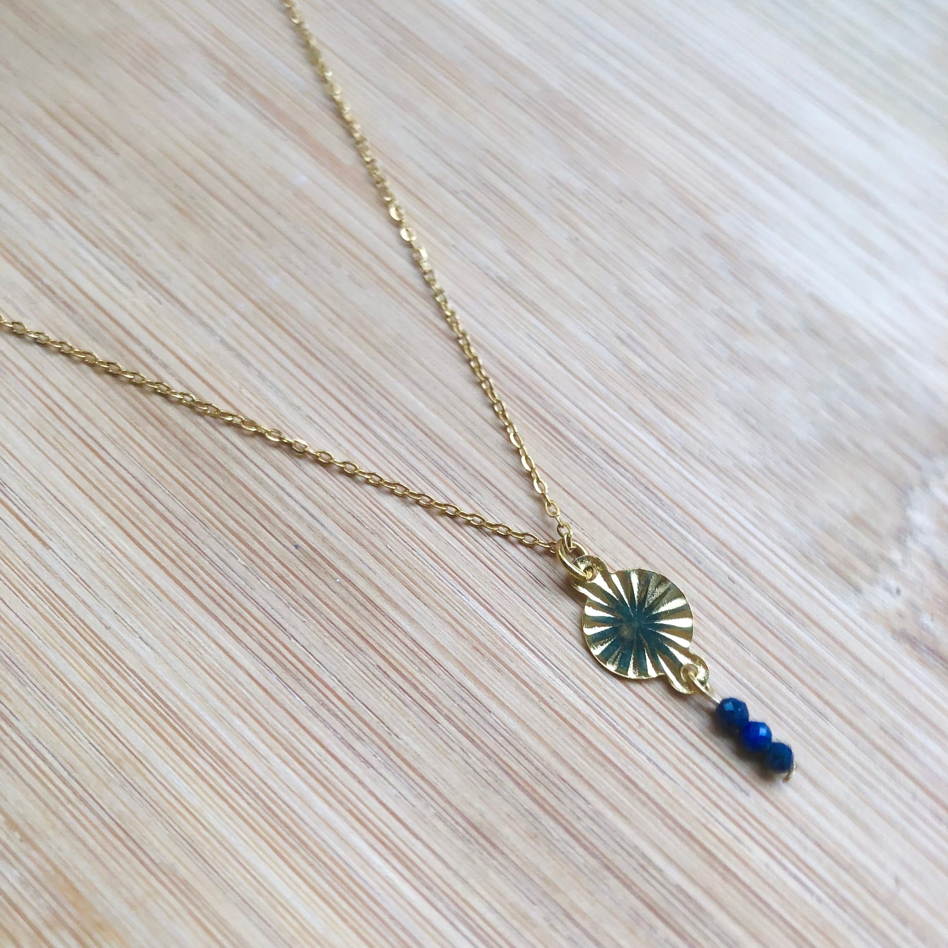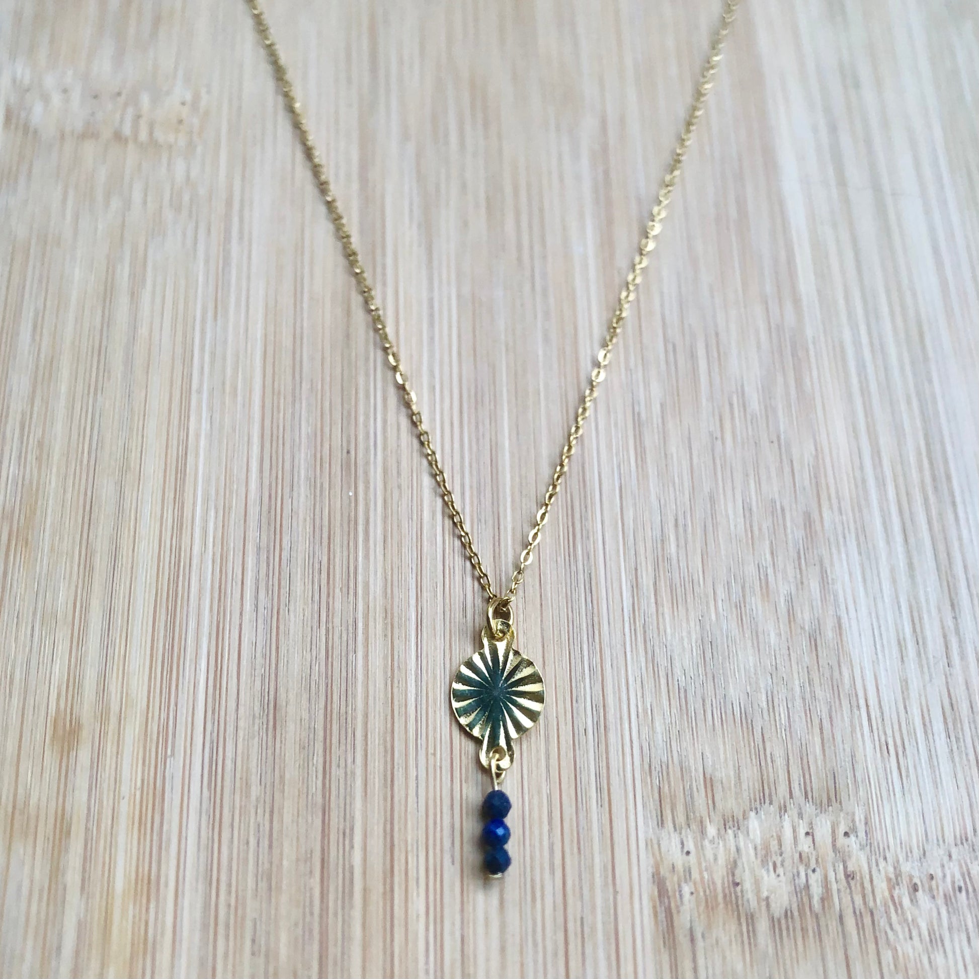 A short necklace made with a thin chain, a sun pendant and 3 beads of lapis lazuli stone (dark blue).