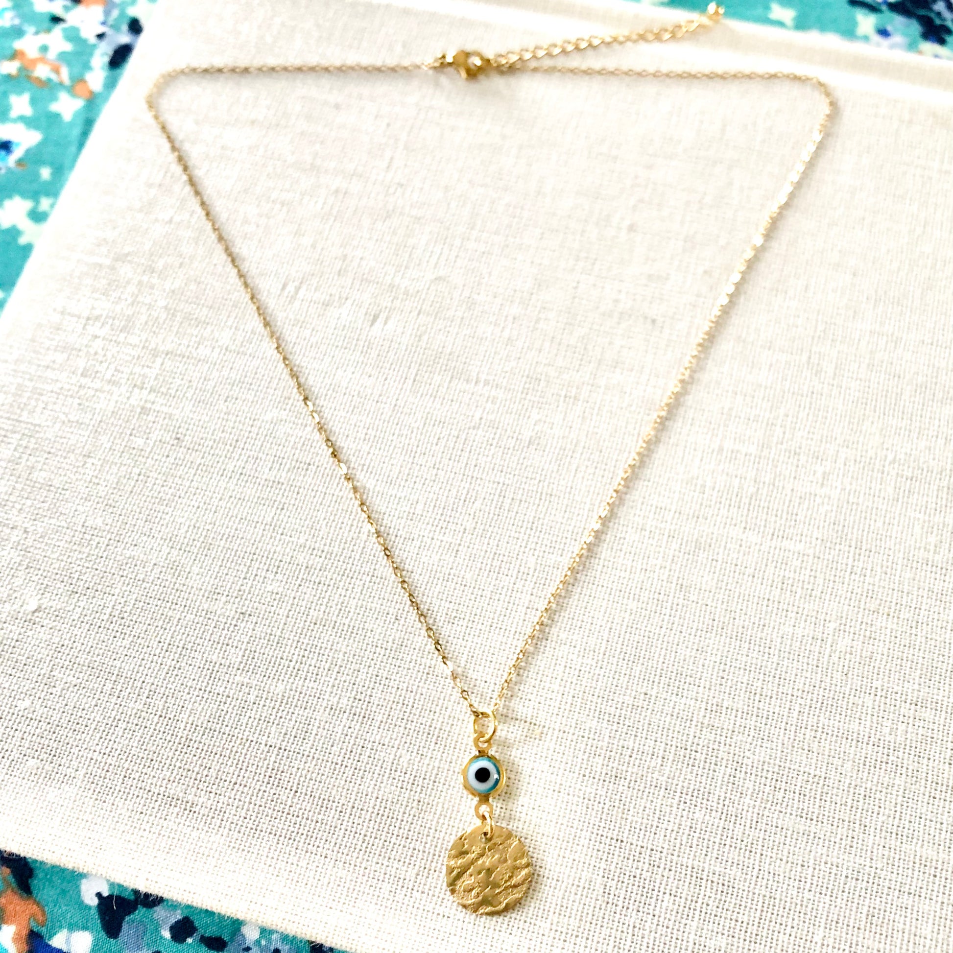 Collar corto elaborado con una fina cadena y un colgante compuesto por un ojo griego y un charm redondo martillado.
