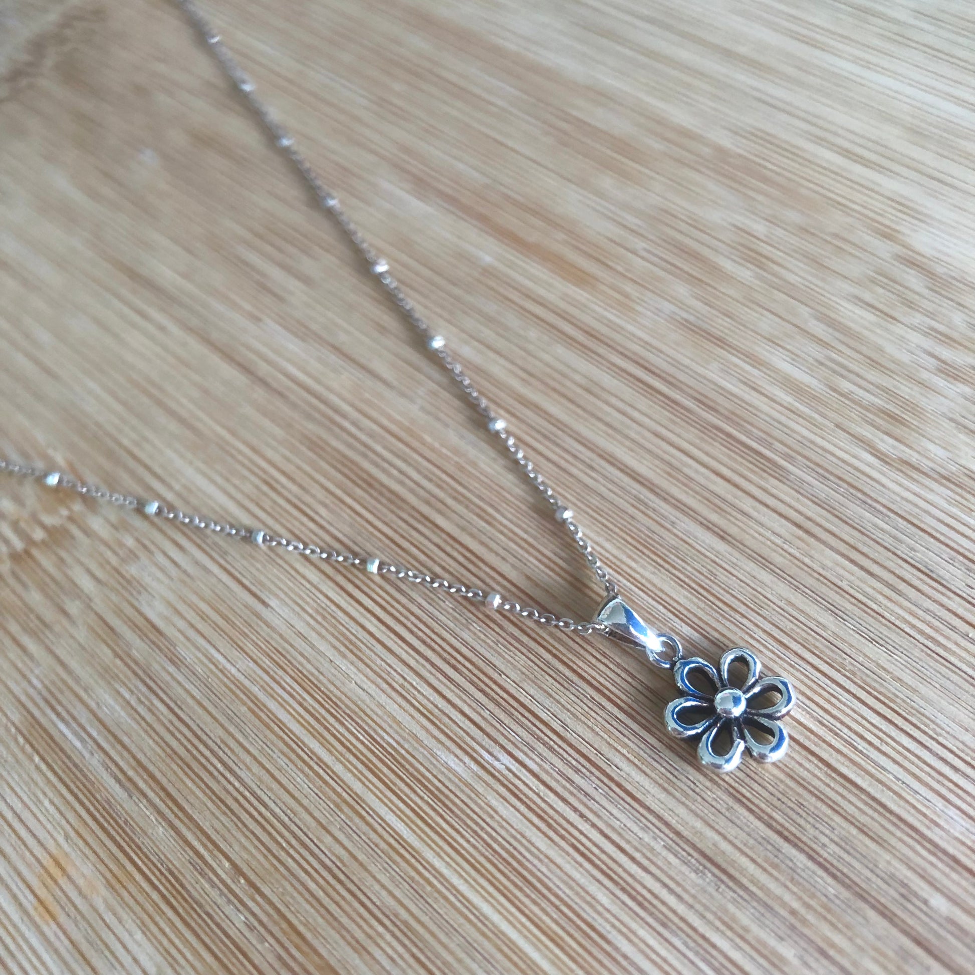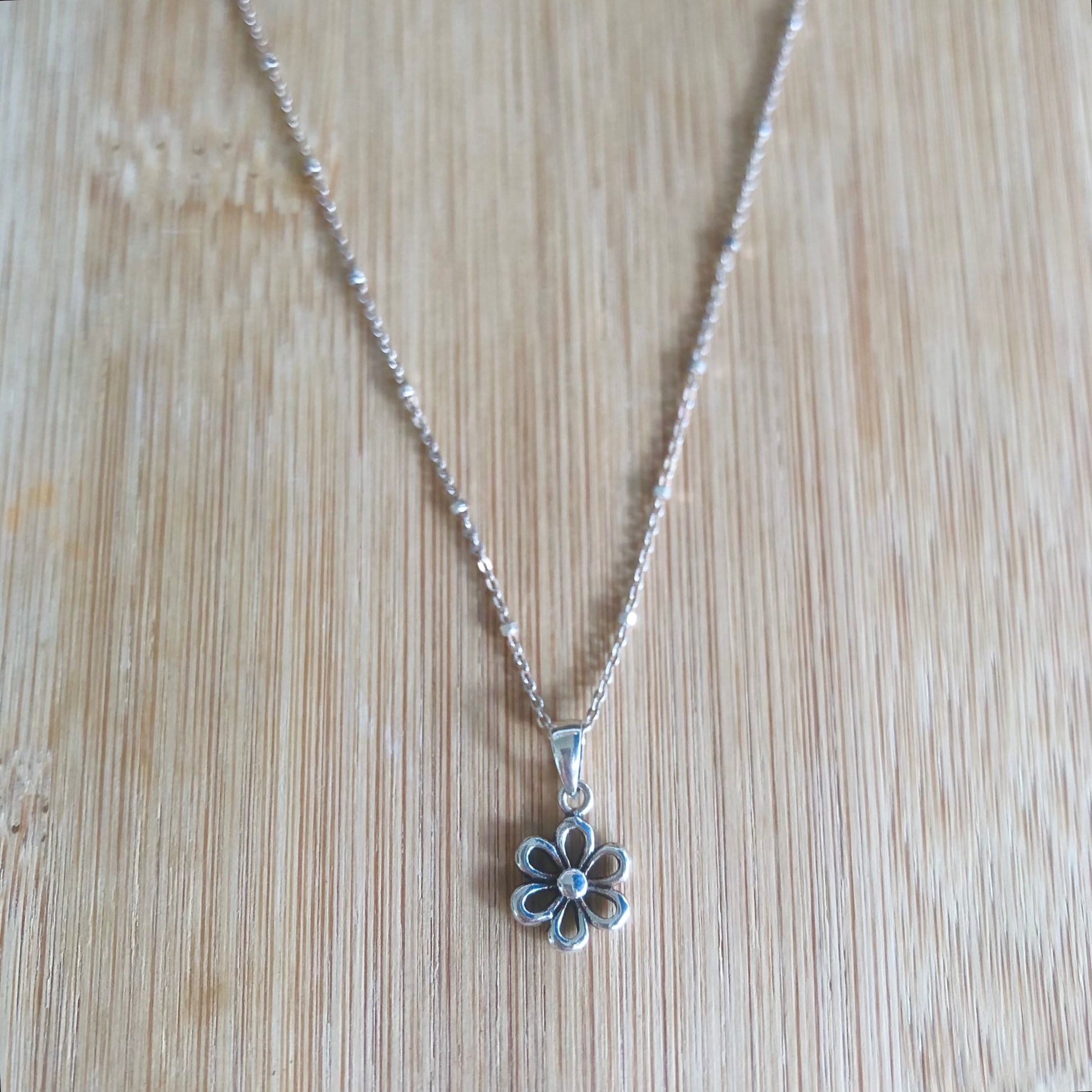 A necklace made with a very thin silver ball chain and a silver flower charm.
