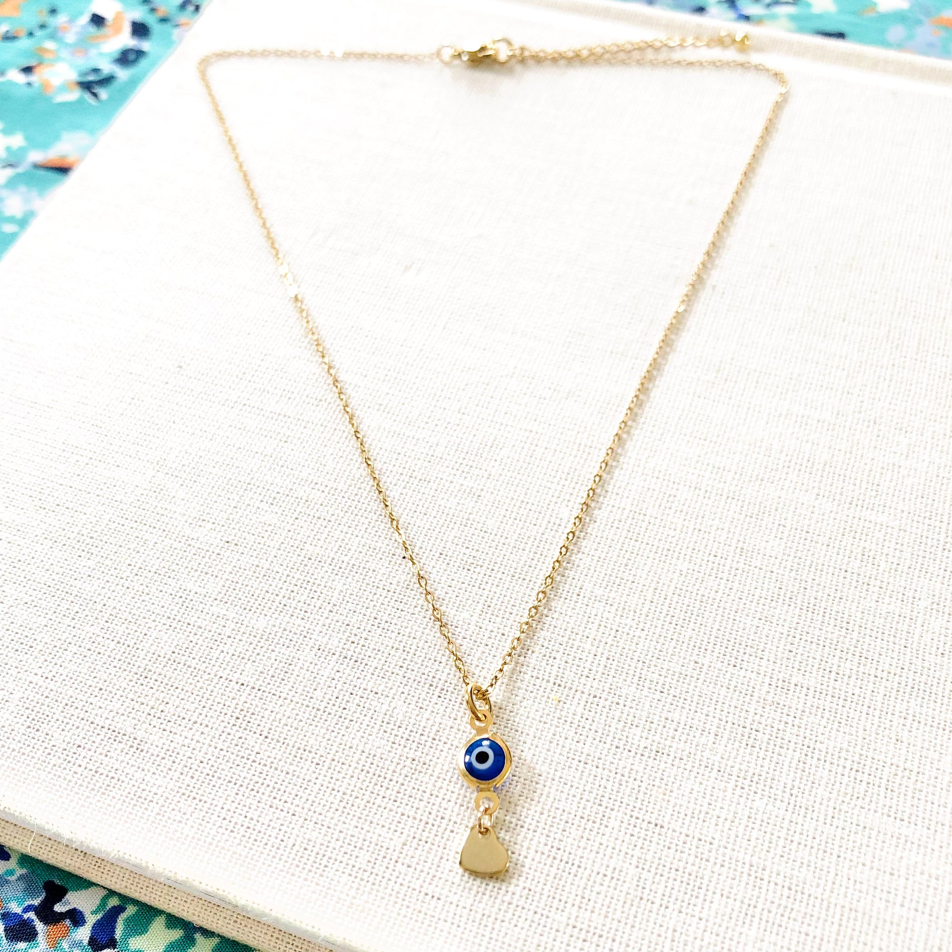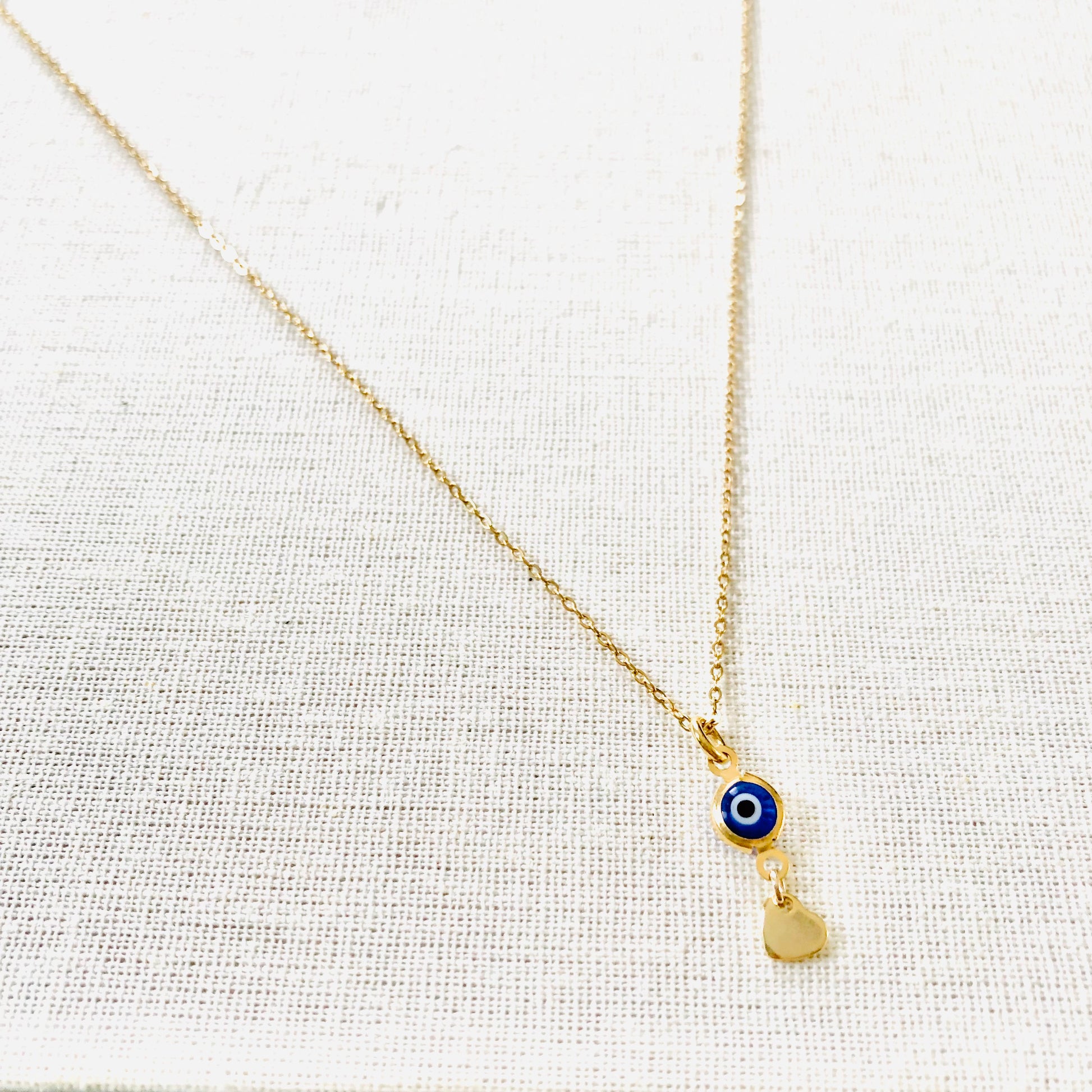 Collar corto elaborado con una fina cadena y un colgante compuesto por un ojo griego (azul oscuro) y un mini charm de corazón.