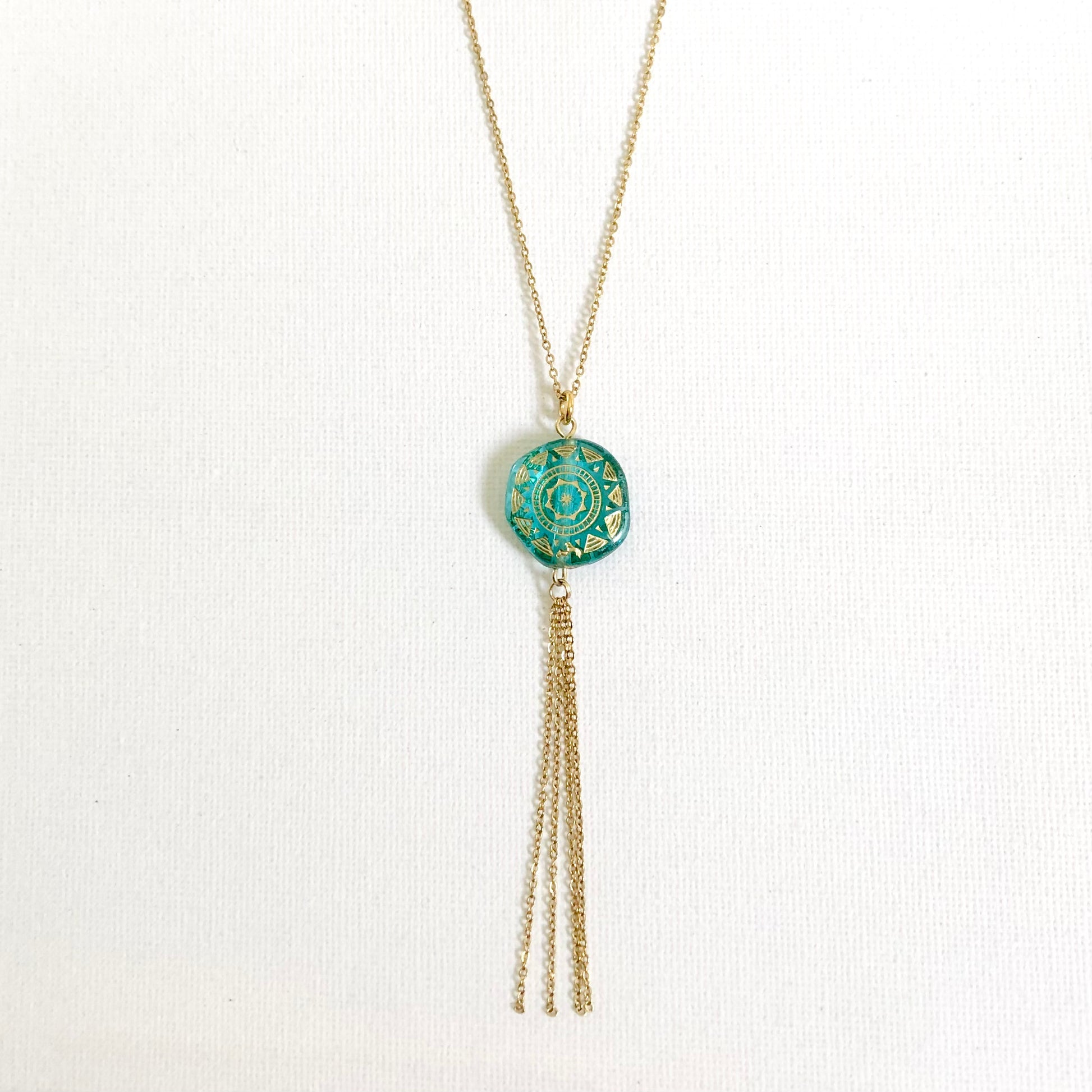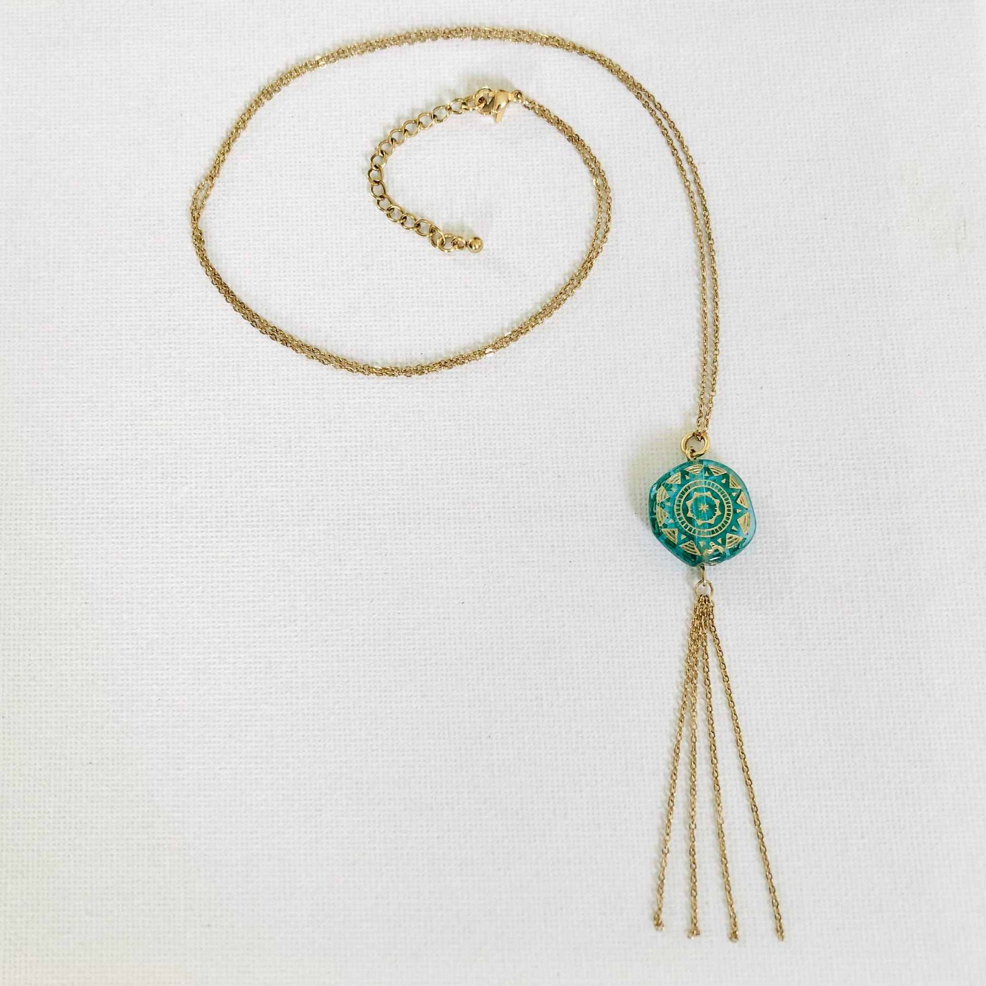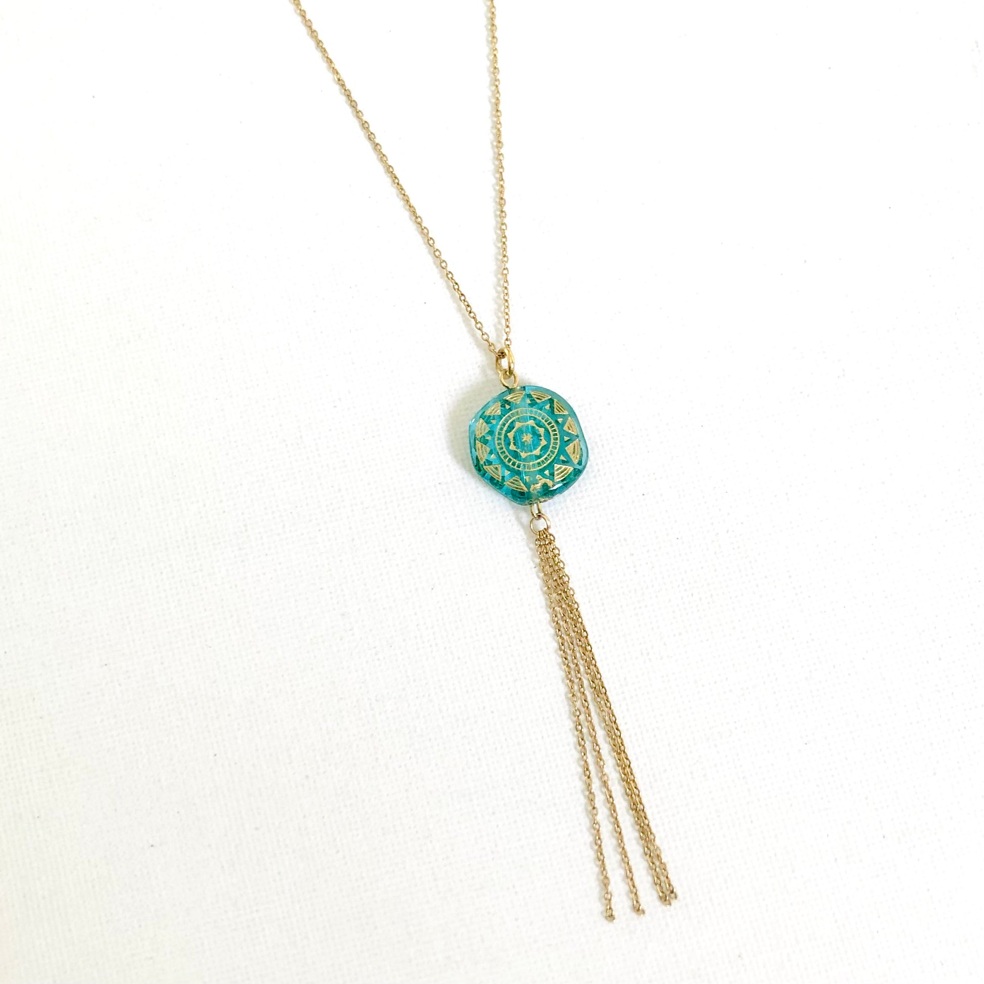 Collar largo elaborado con una fina cadena y un colgante compuesto por una cuenta de acrílico azul y unas cadenas colgantes.