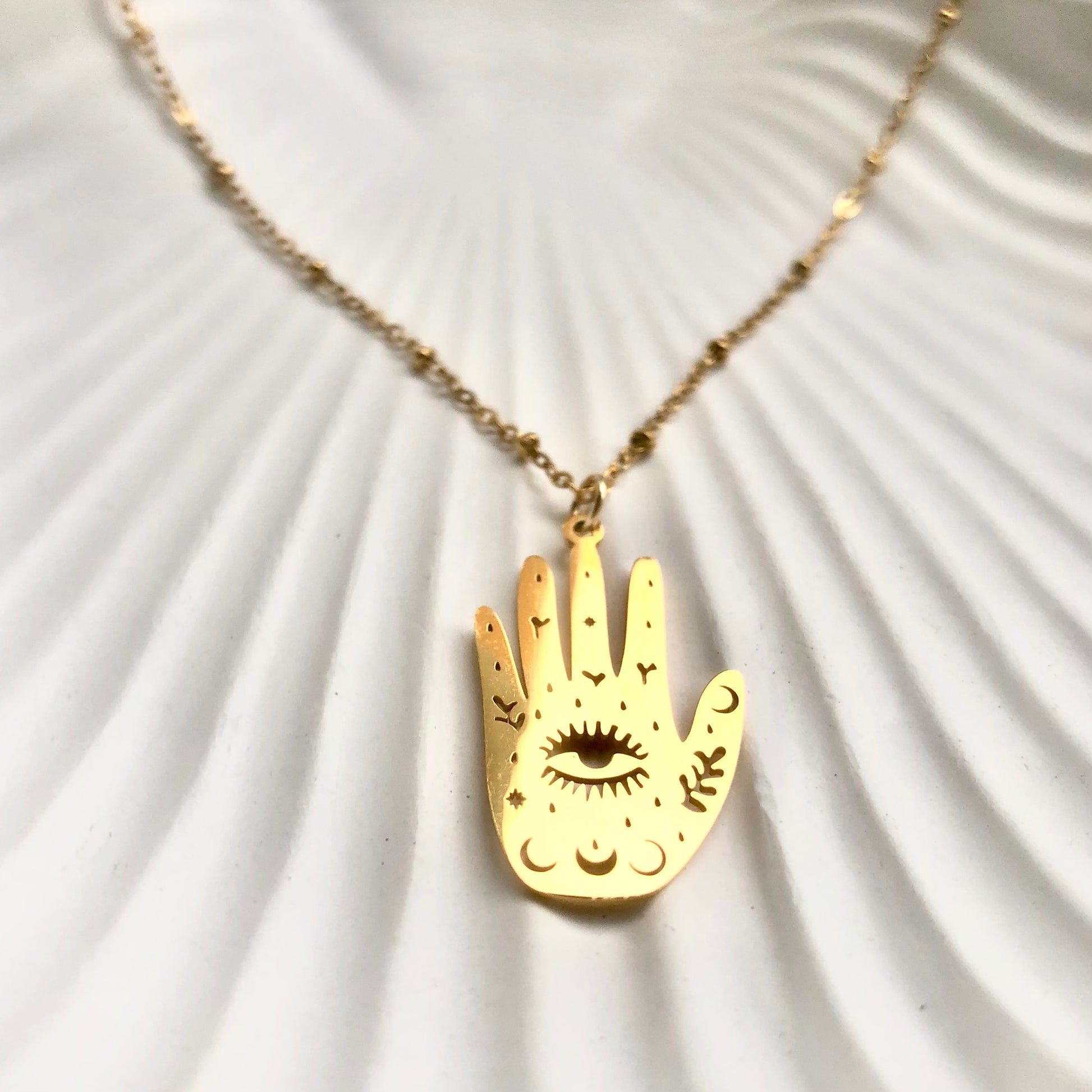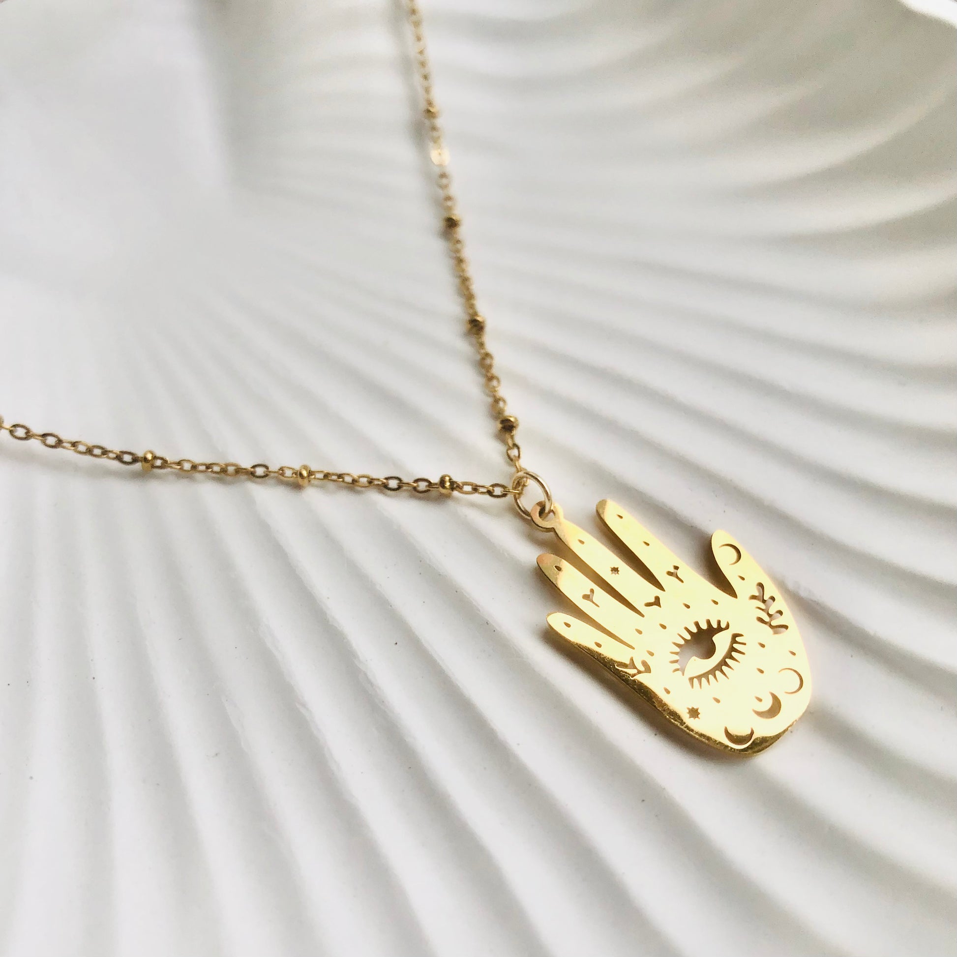 A medium necklace made with a ball chain and a gold plated stainless steel fatma hand.
