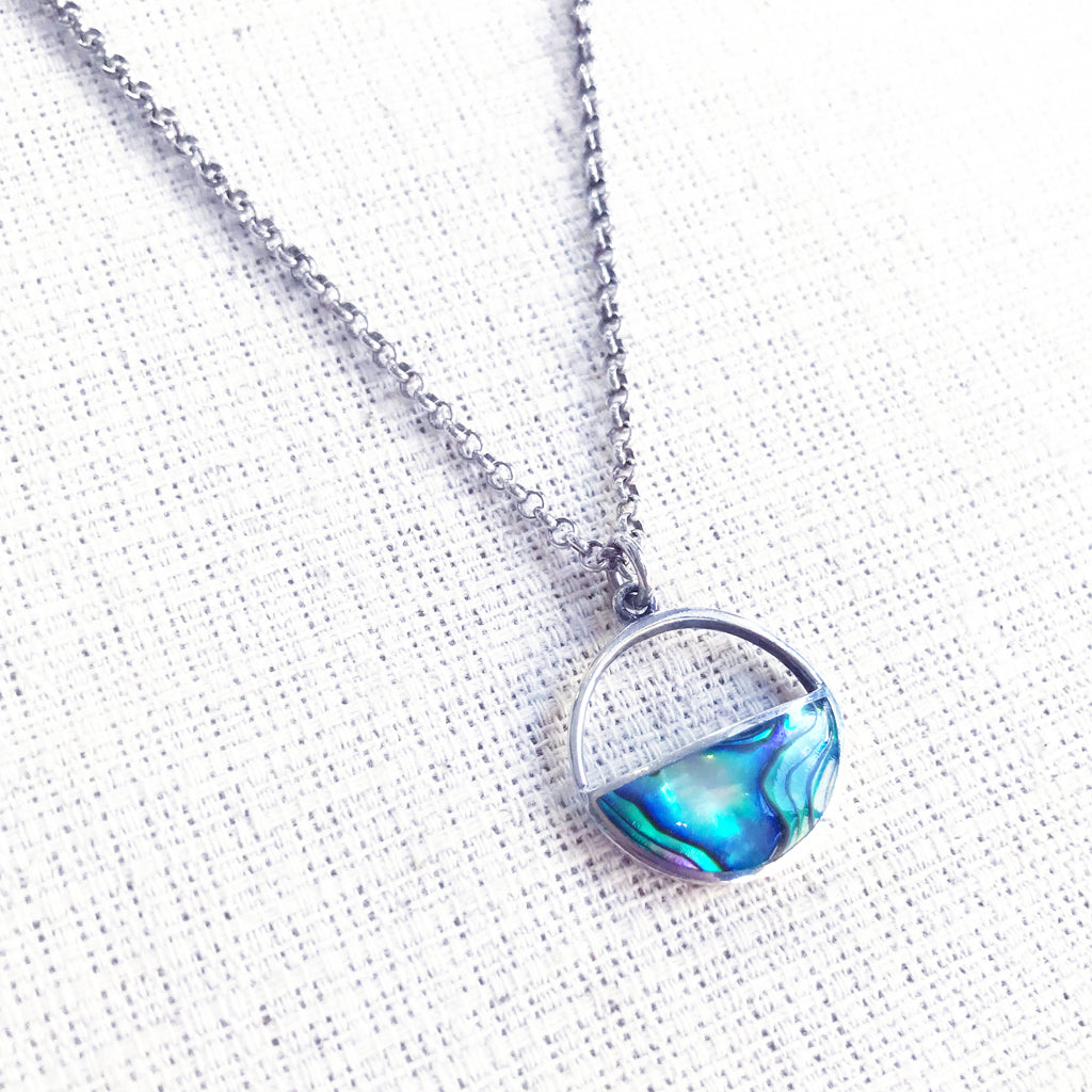 Con un fascinante colgante de concha de abulón o nácar.
