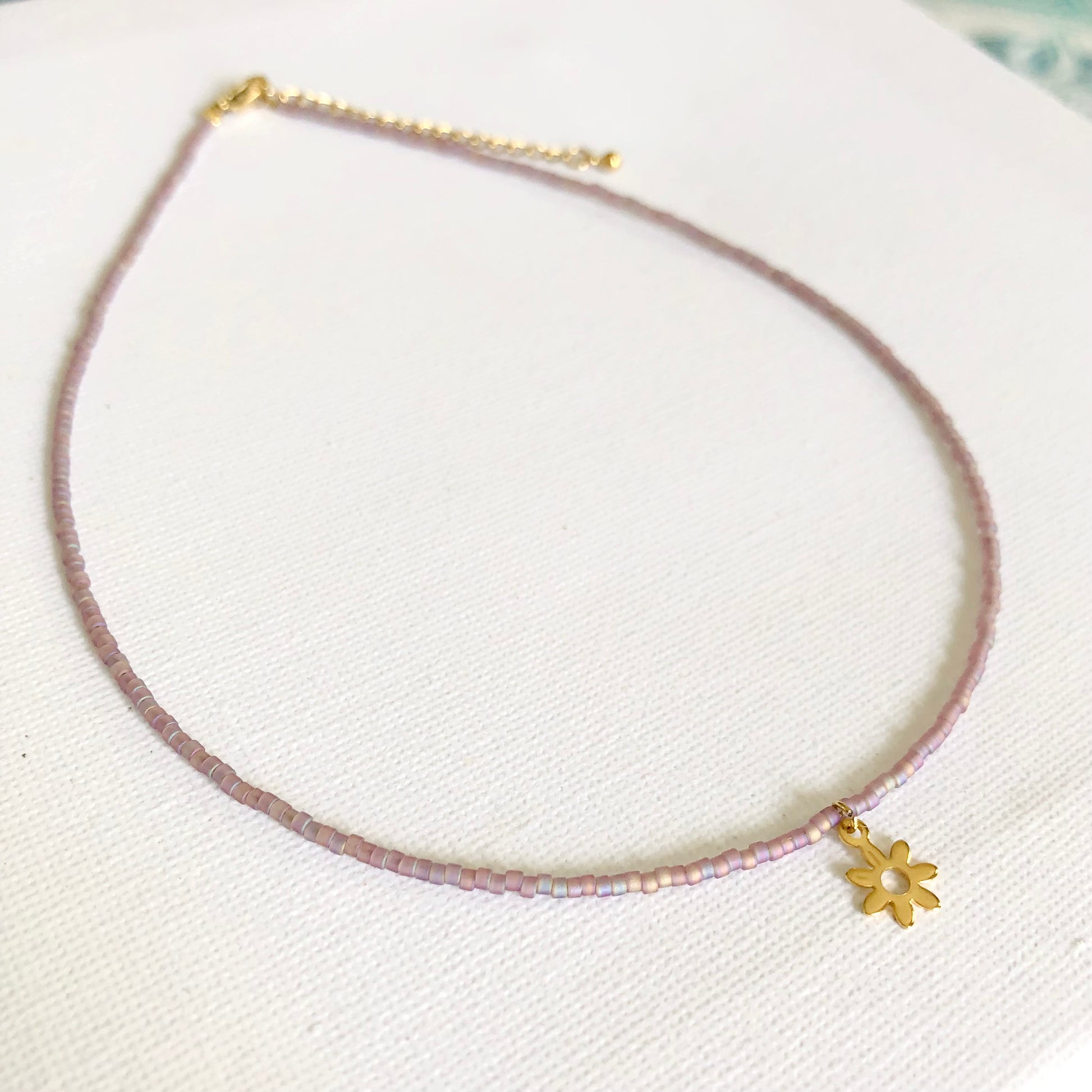 Un collar corto elaborado con cuentas de cristal japonés (Miyuki Beads), un charm de flor y unas cuentas de acero inoxidable bañadas en oro.