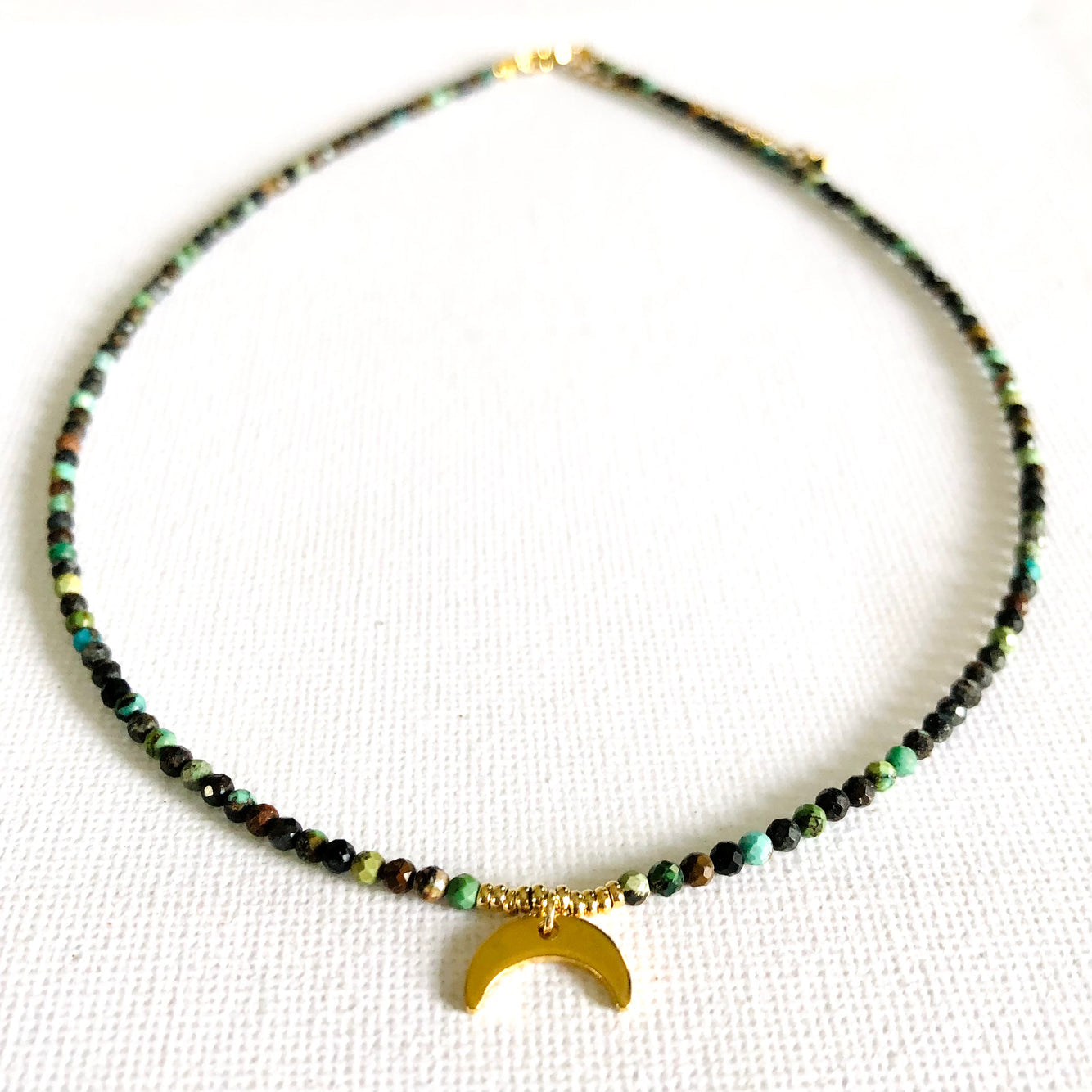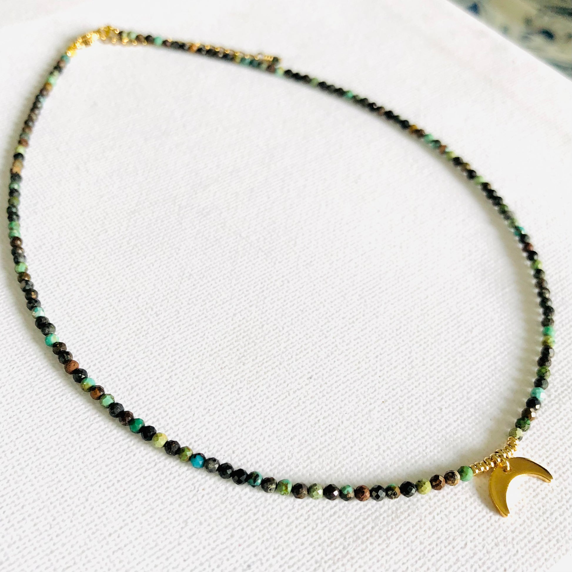 A short necklace made with turquoise stone beads, a moon charm and some gold plated stainless steel beads.