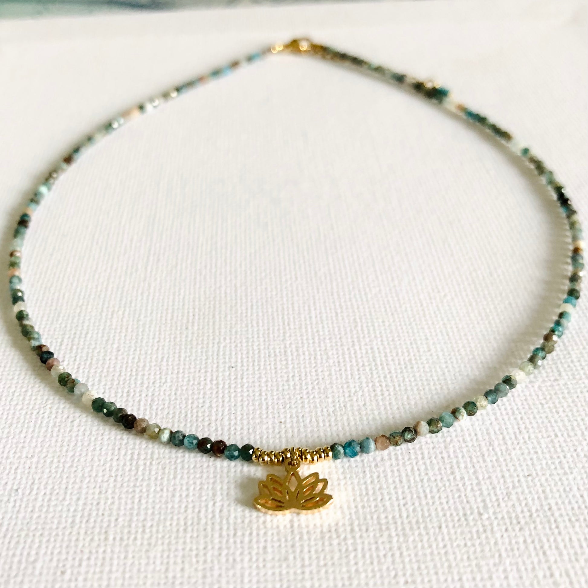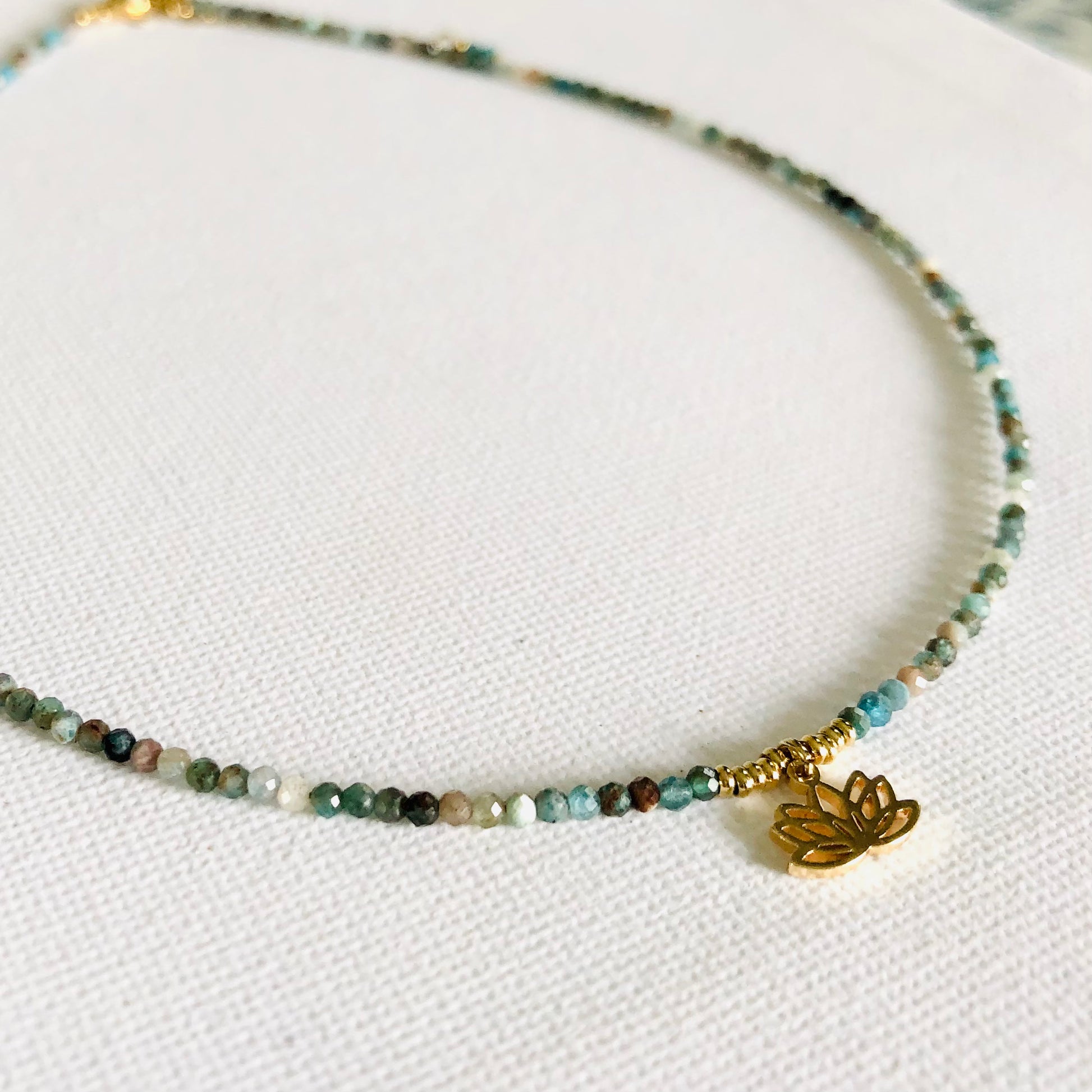 Collar corto elaborado con cuentas de piedra, un charm y unas cuentas de acero inoxidable bañadas en oro.