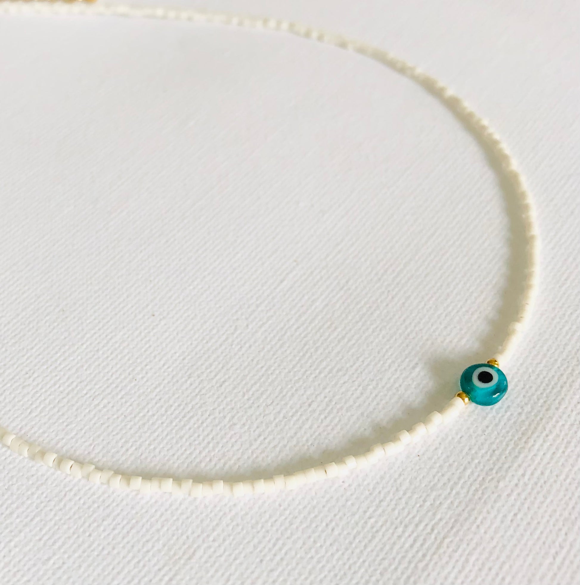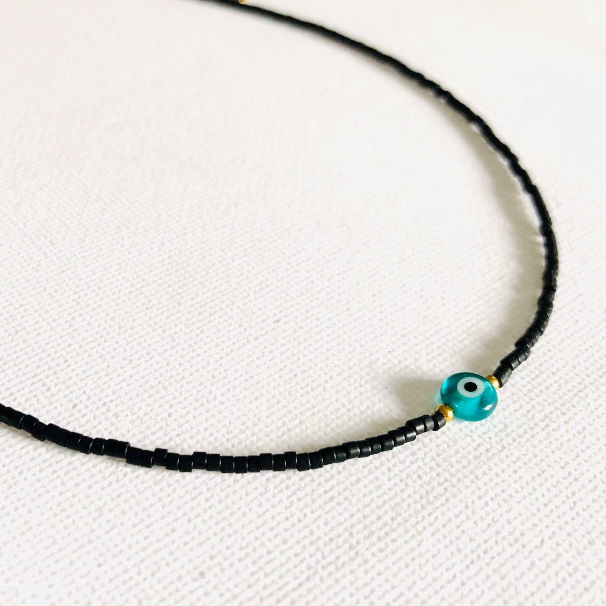 Un collar corto elaborado con cuentas de vidrio japonés (Miyuki Beads), un charm de ojo griego y unas cuentas de acero inoxidable bañadas en oro.