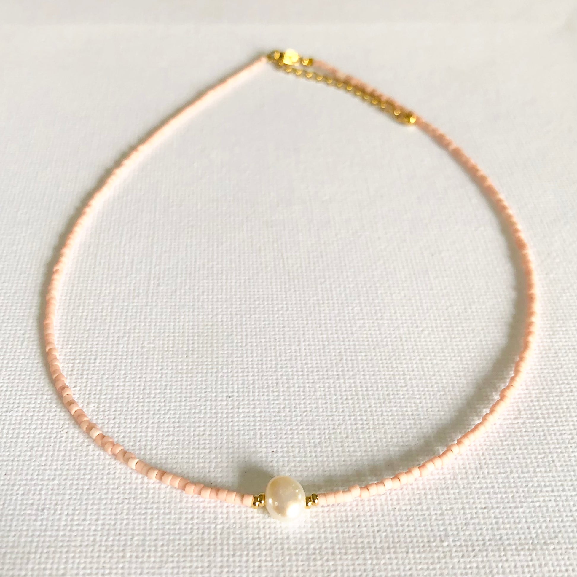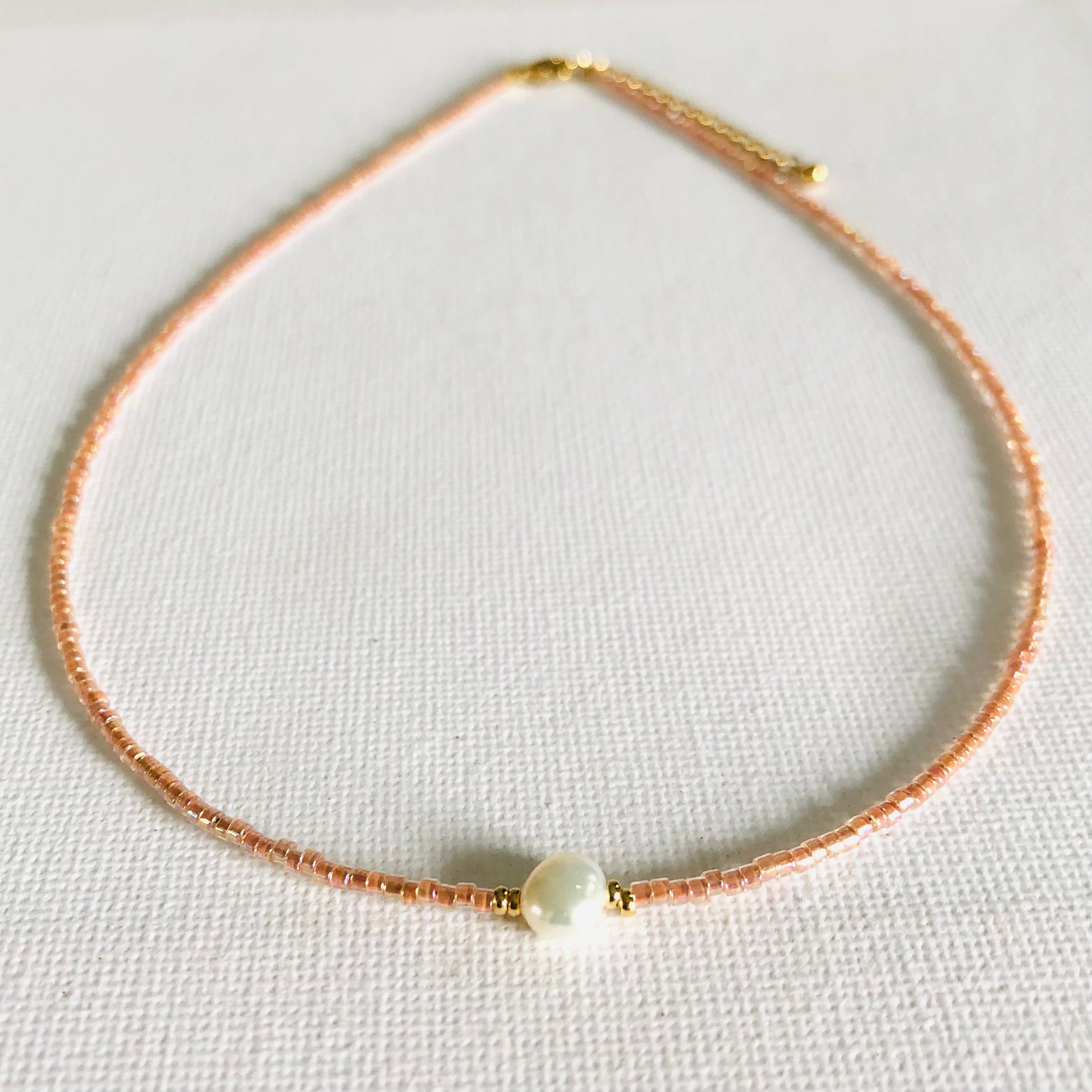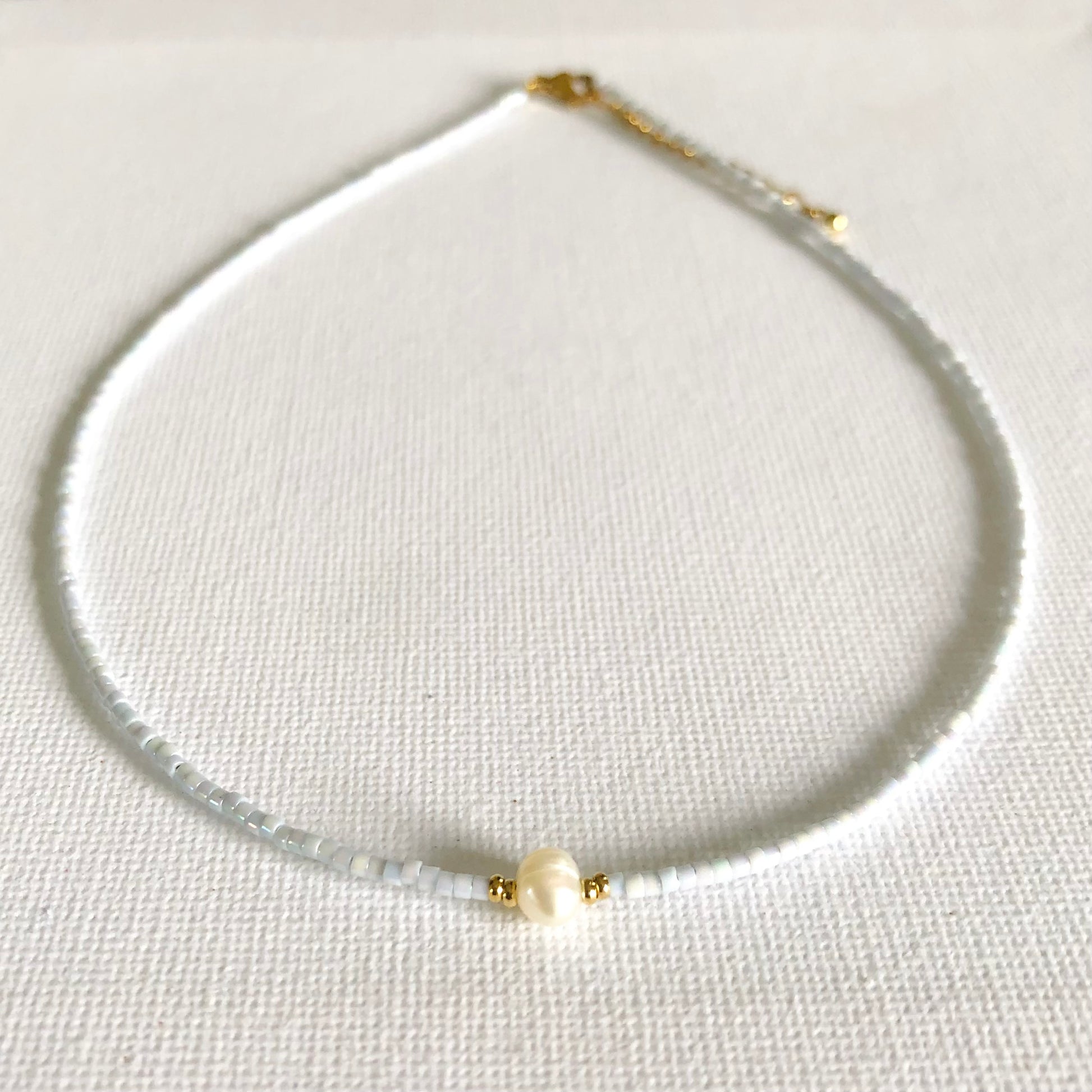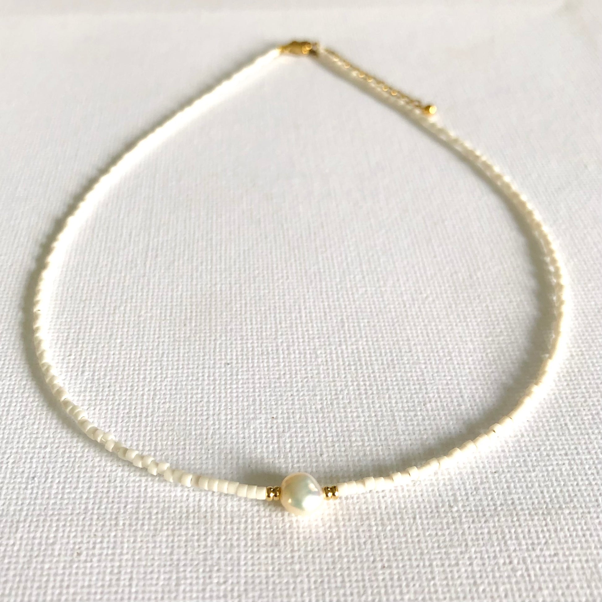 Un collar corto elaborado con cuentas de vidrio japonés (Miyuki Beads), una perla blanca de agua dulce y unas cuentas de acero inoxidable bañadas en oro.