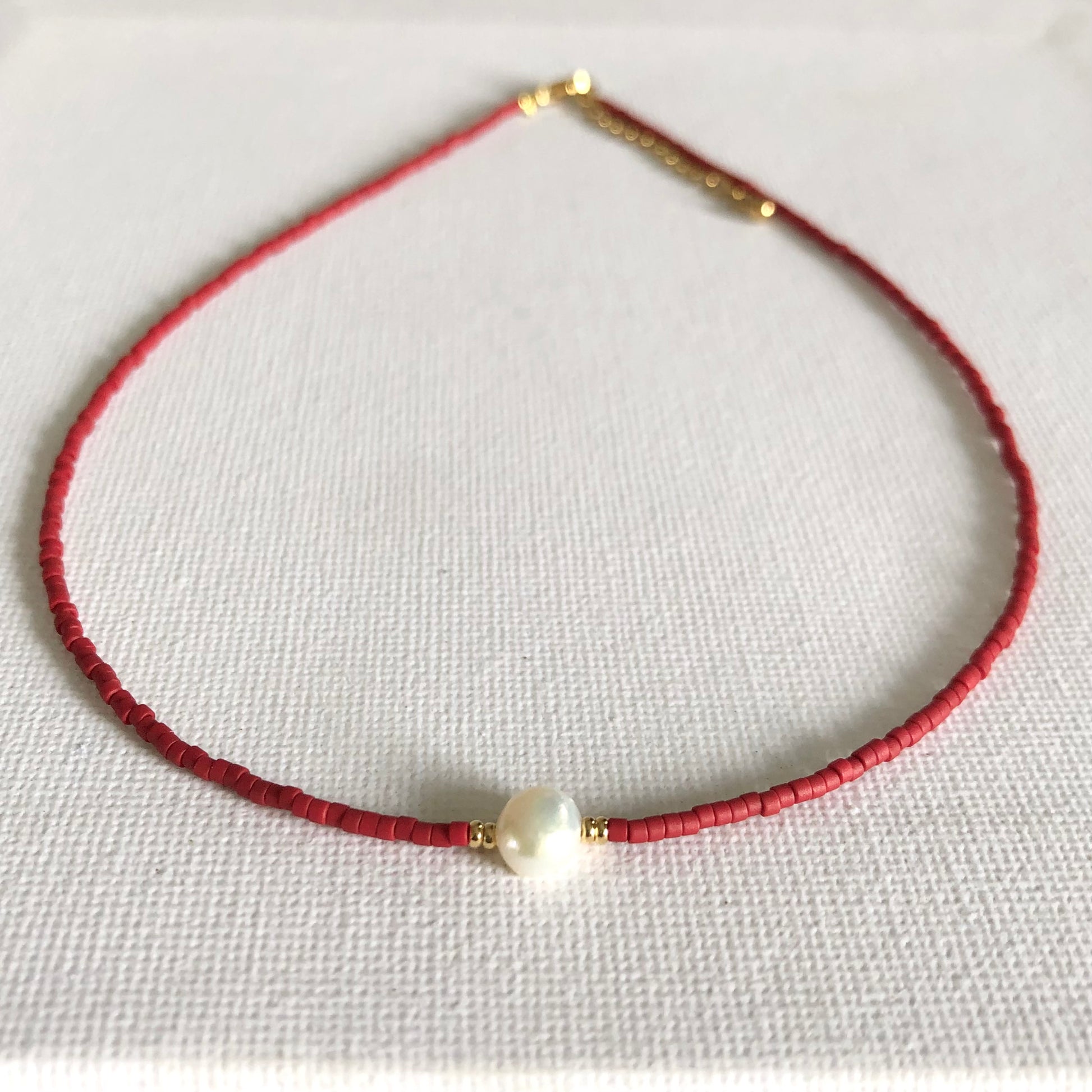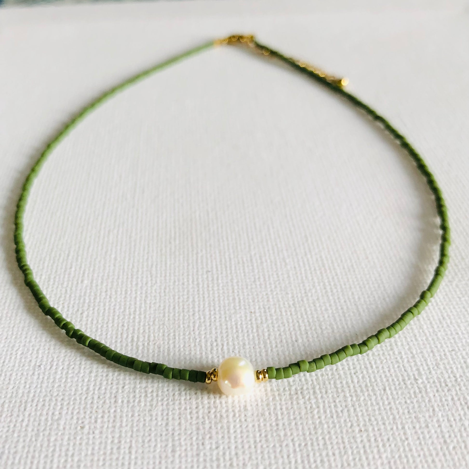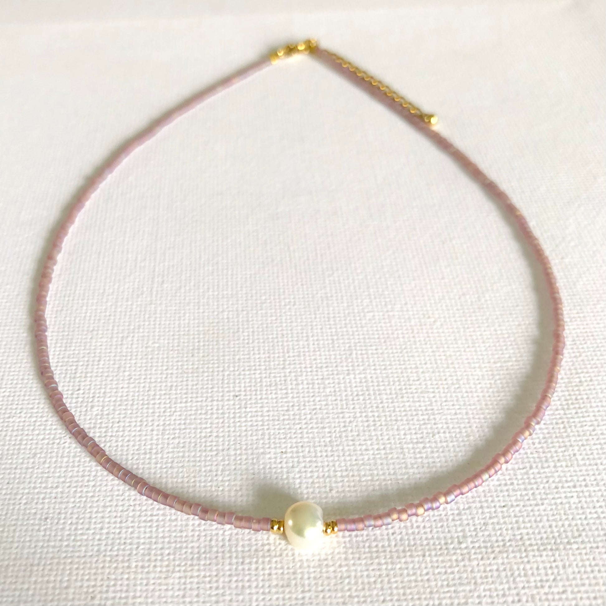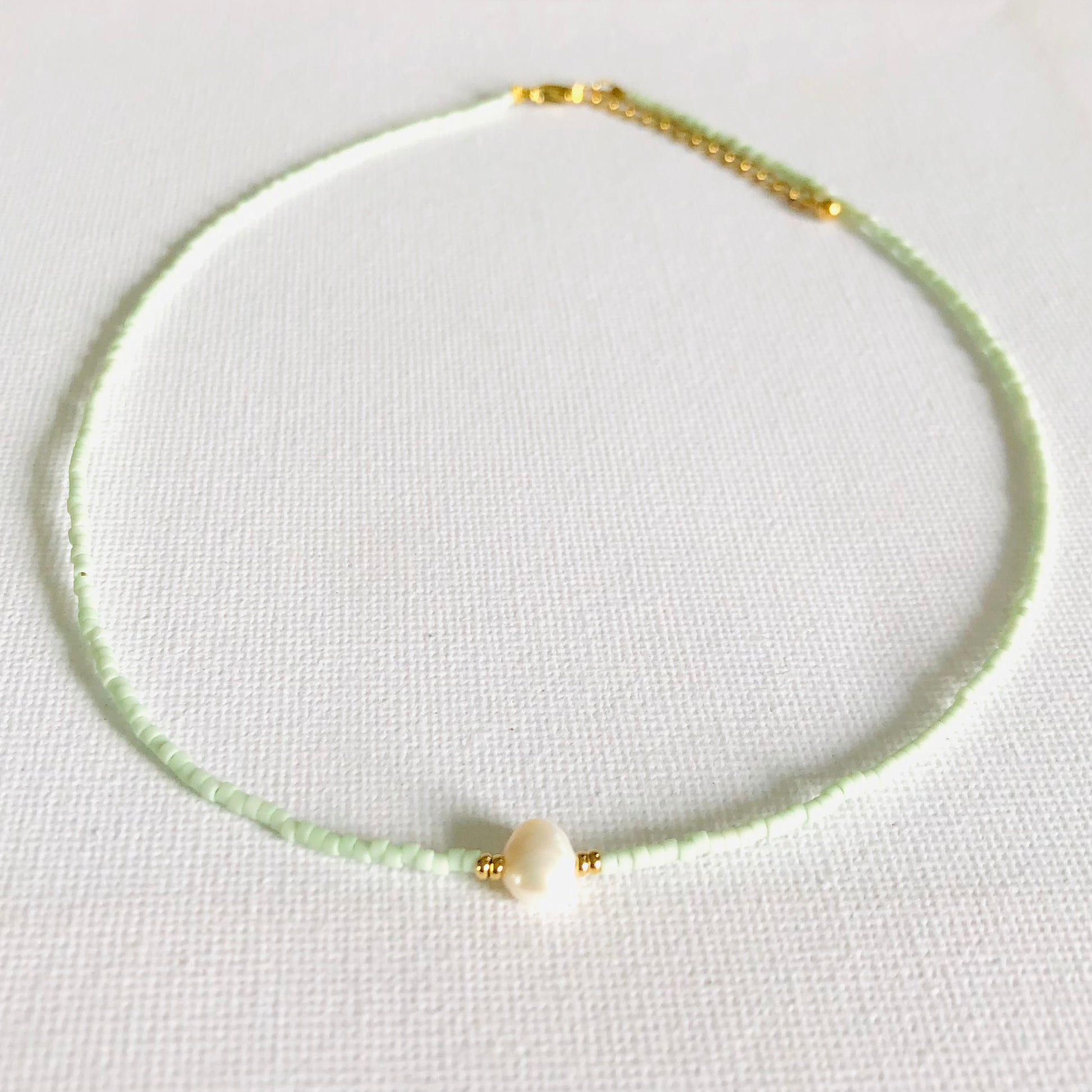 Un collar corto elaborado con cuentas de vidrio japonés (Miyuki Beads), una perla blanca de agua dulce y unas cuentas de acero inoxidable bañadas en oro.