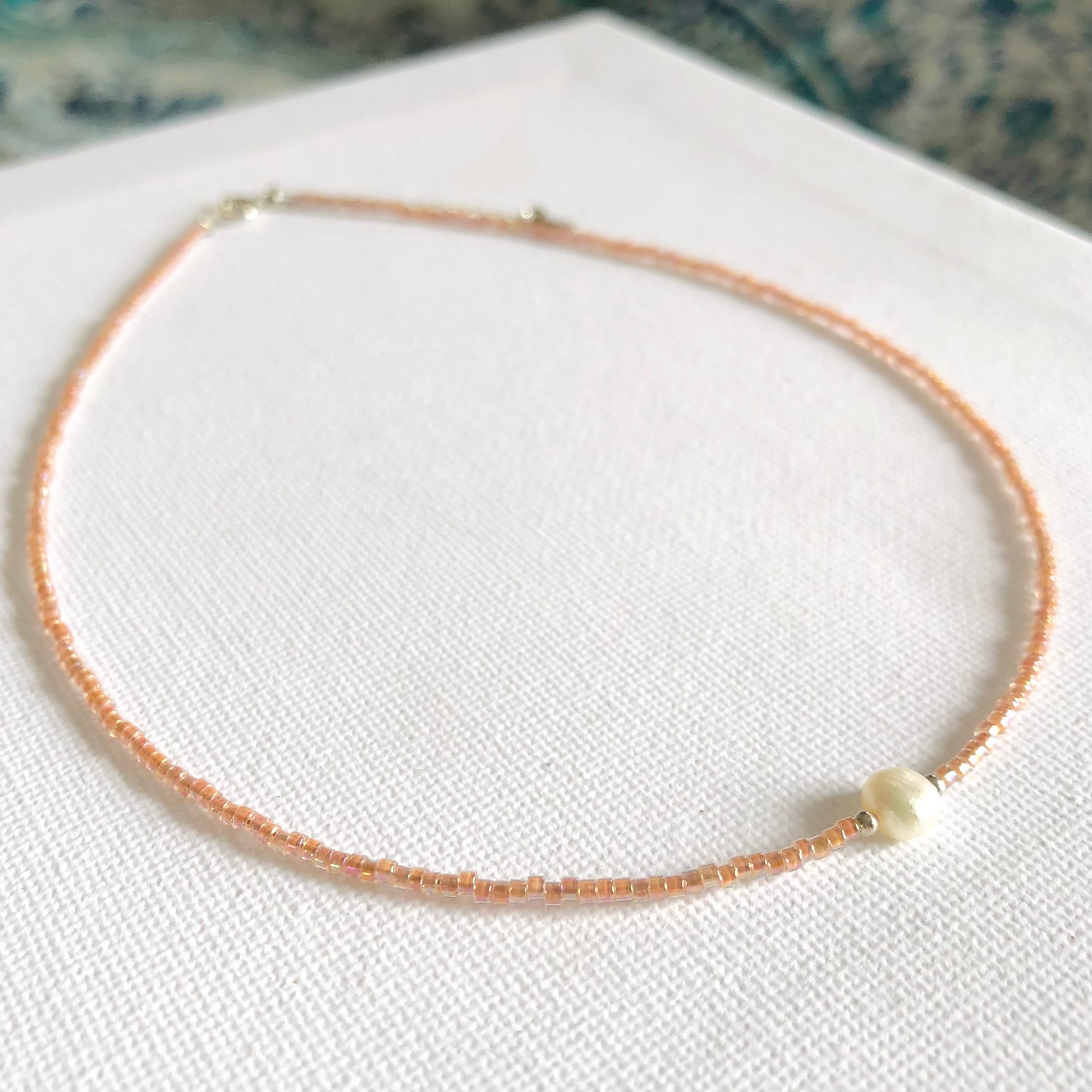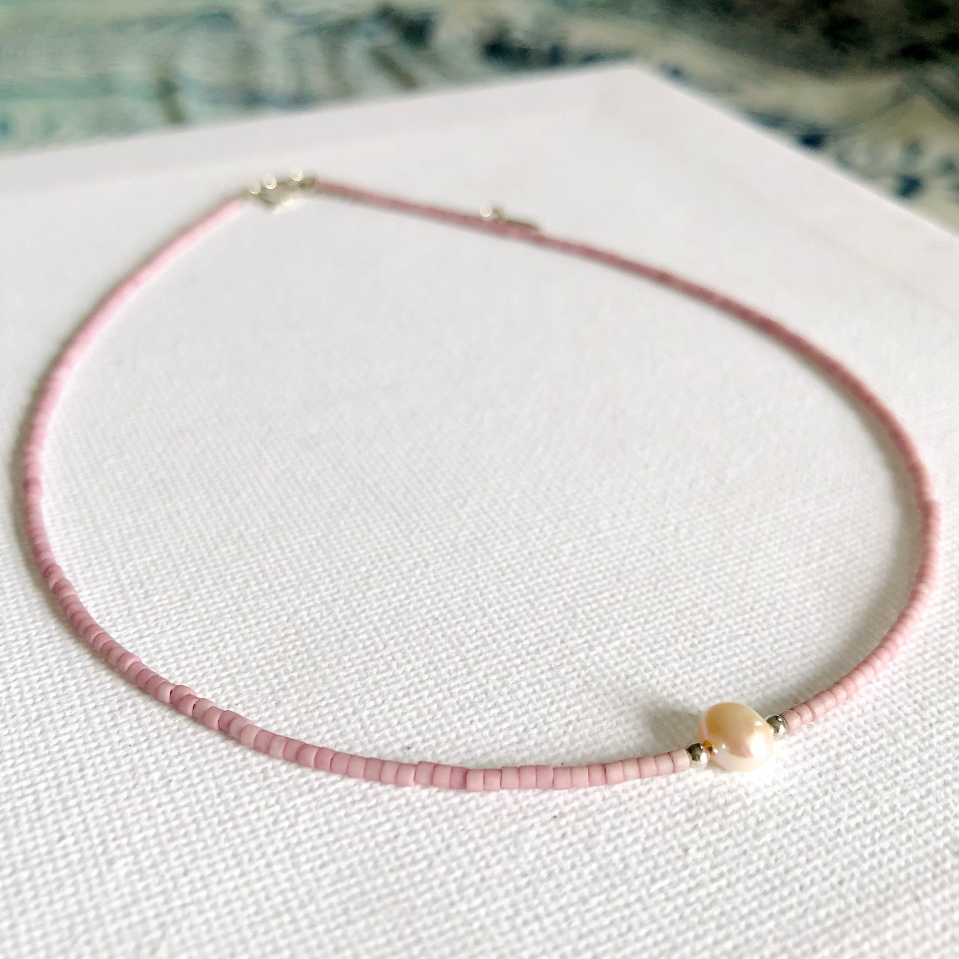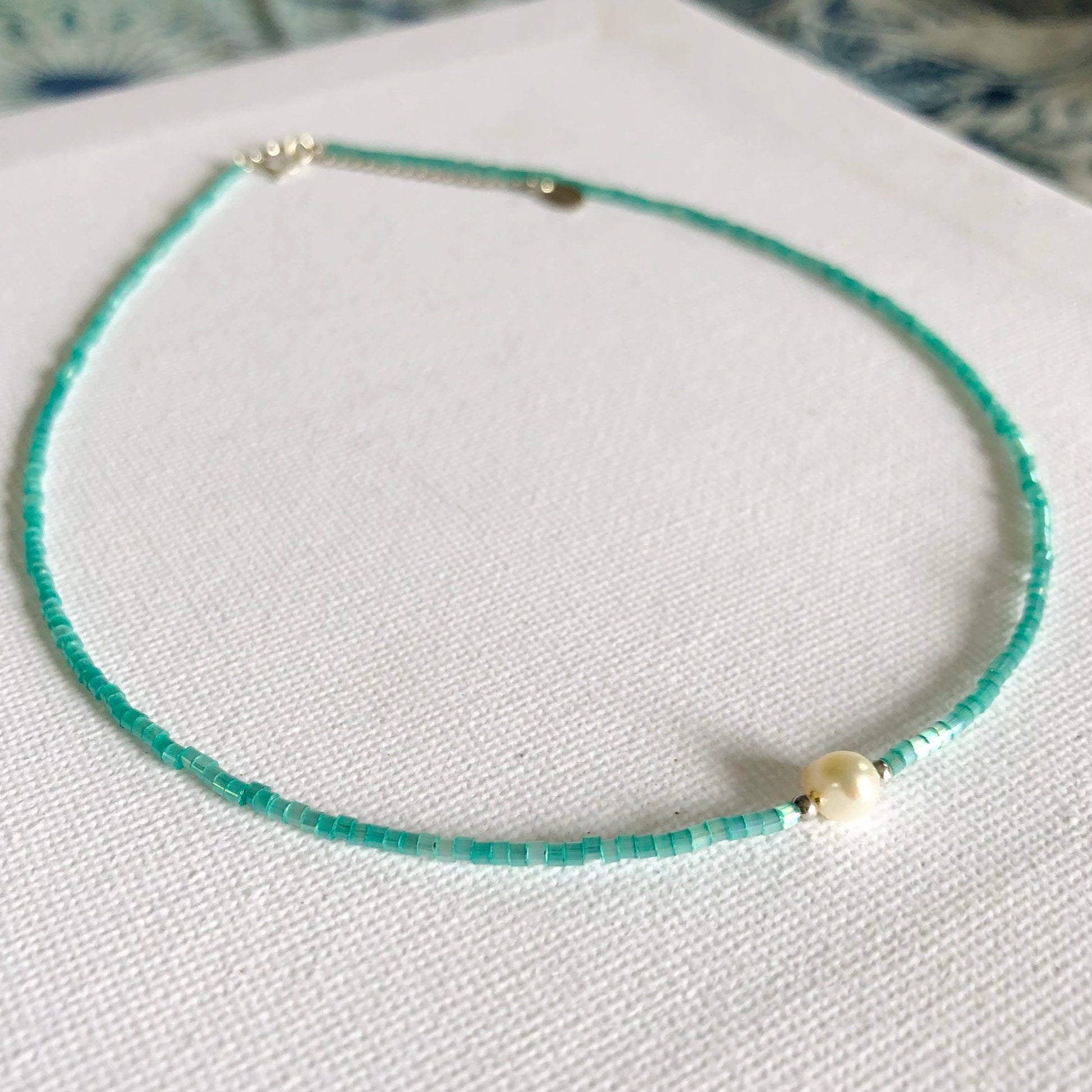 Un collar corto elaborado con cuentas de vidrio japonés (Miyuki Beads), una perla blanca de agua dulce y plata.