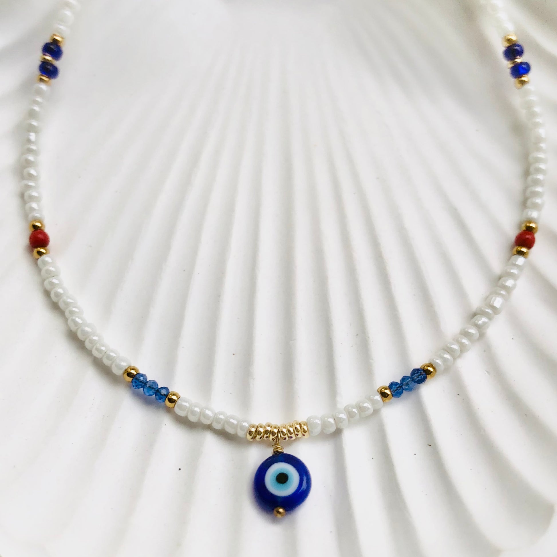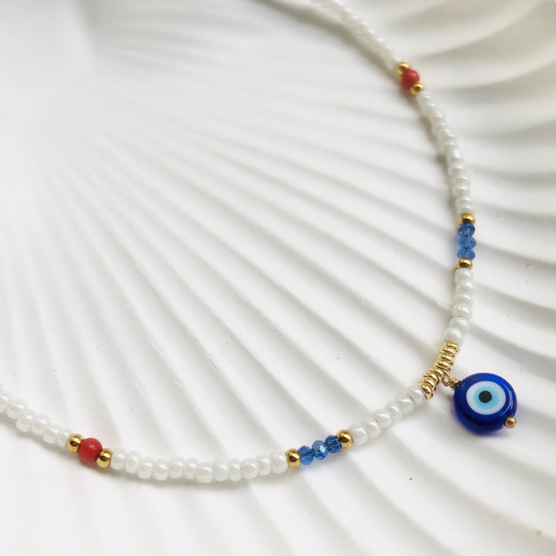 A short necklace made with glass beads (Miyuki beads), some crystal glass beads, coral beads, gold plated stainless steel beads and a big Greek eye made in glass.