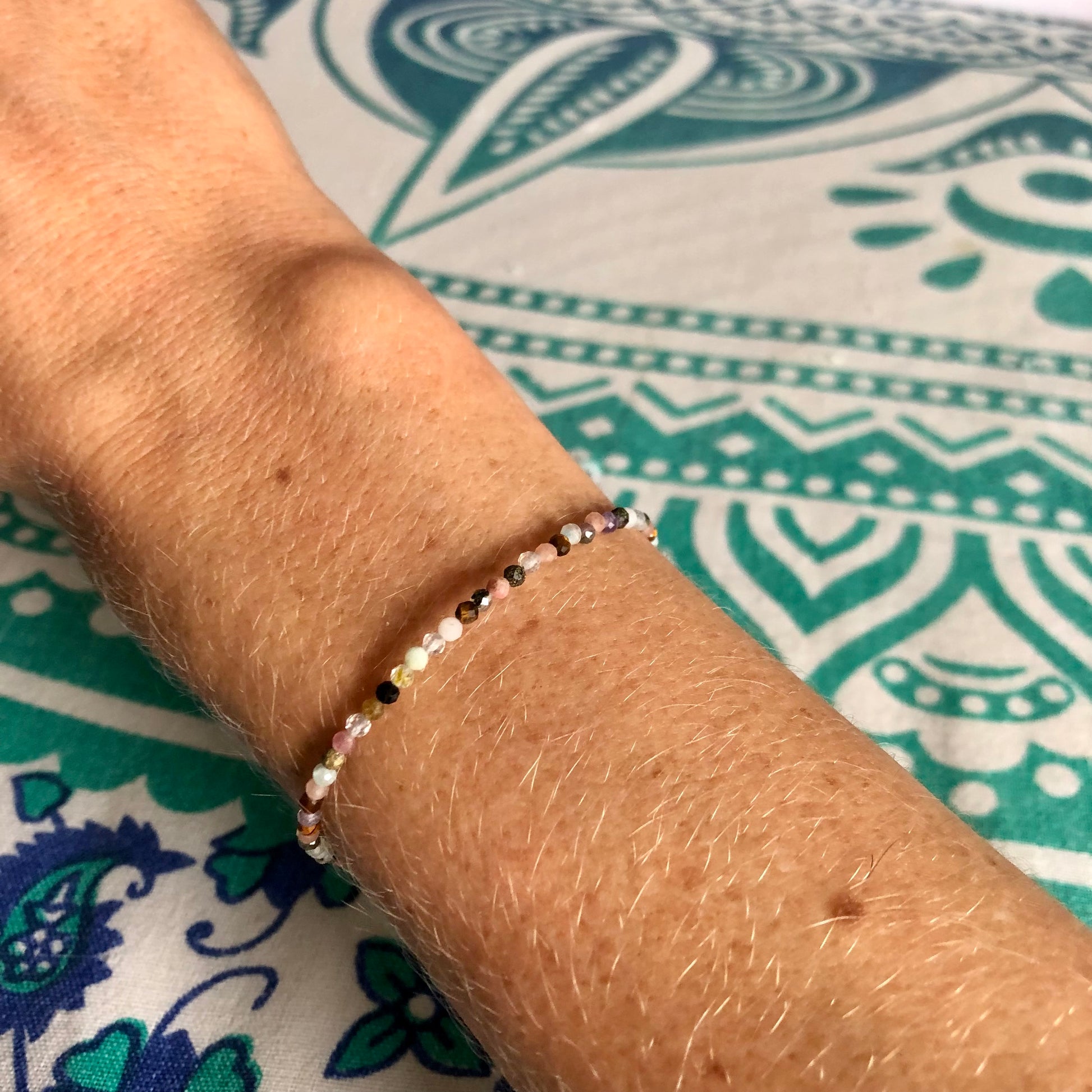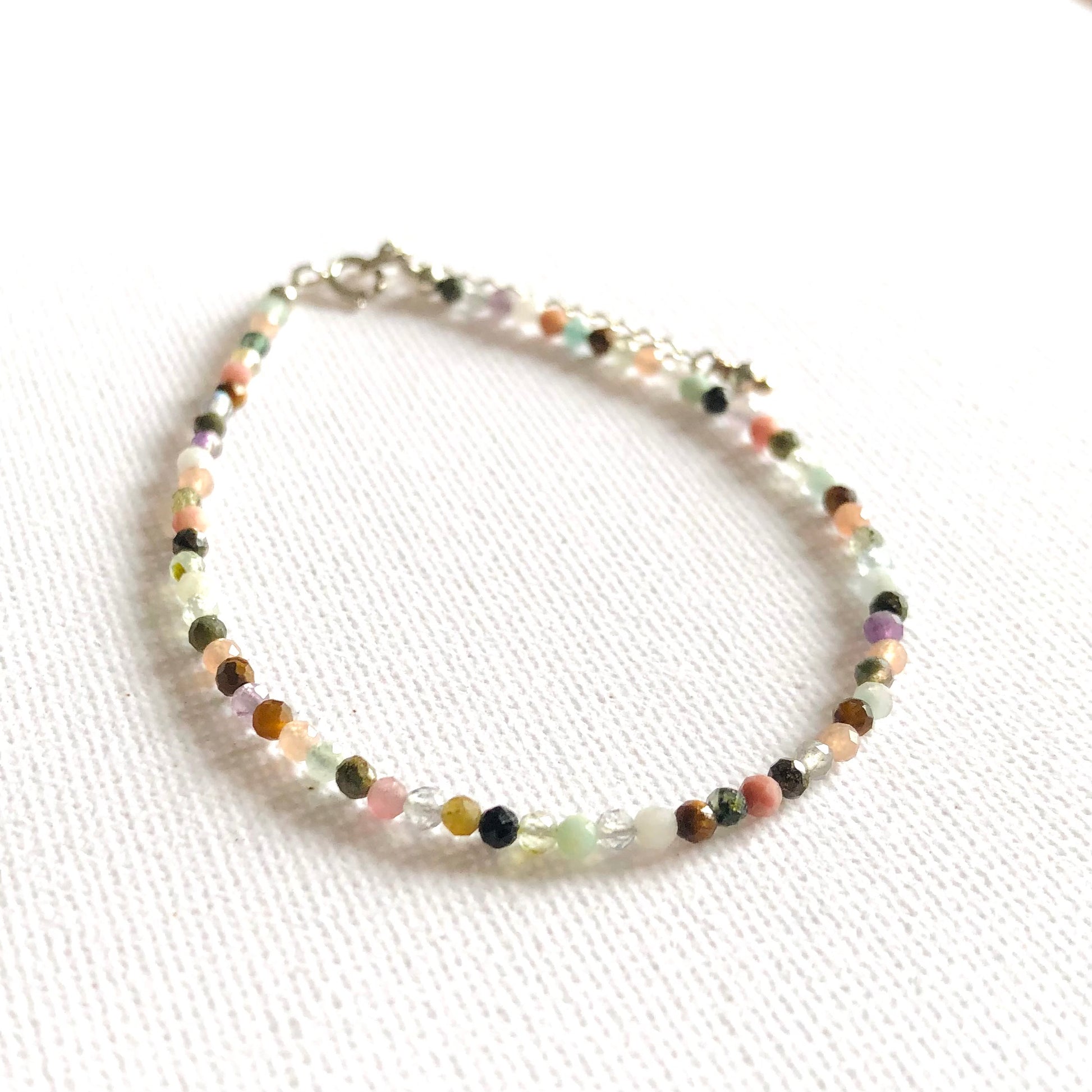 A thin bracelet made with silver and a mix of different stones beads (amethyst, tiger eye, peach moonstone, tianhe, tourmaline, labradorite).